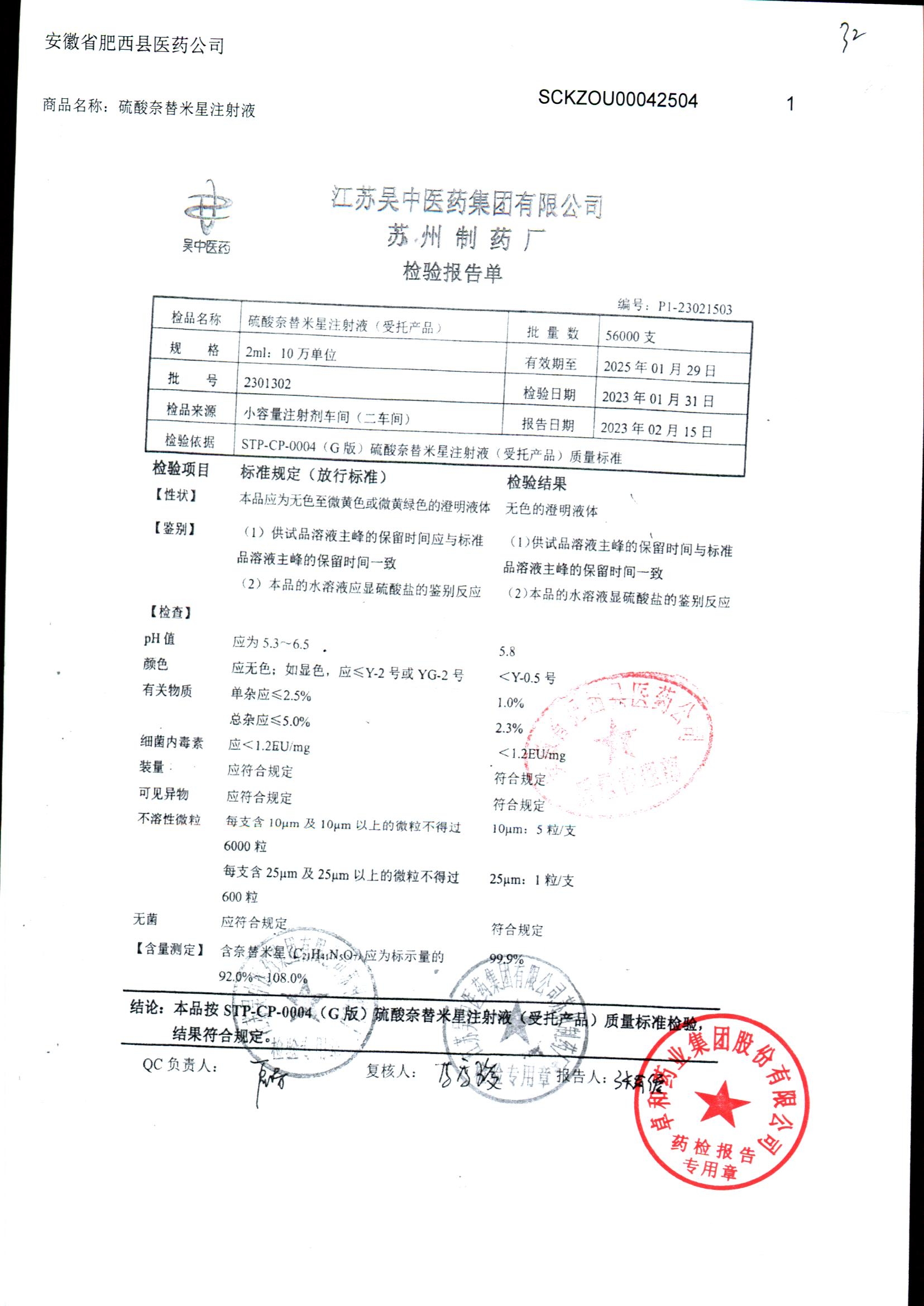 硫酸奈替米星注射液 | 2ml:10万单位 | 2301302 | 查看详情 |