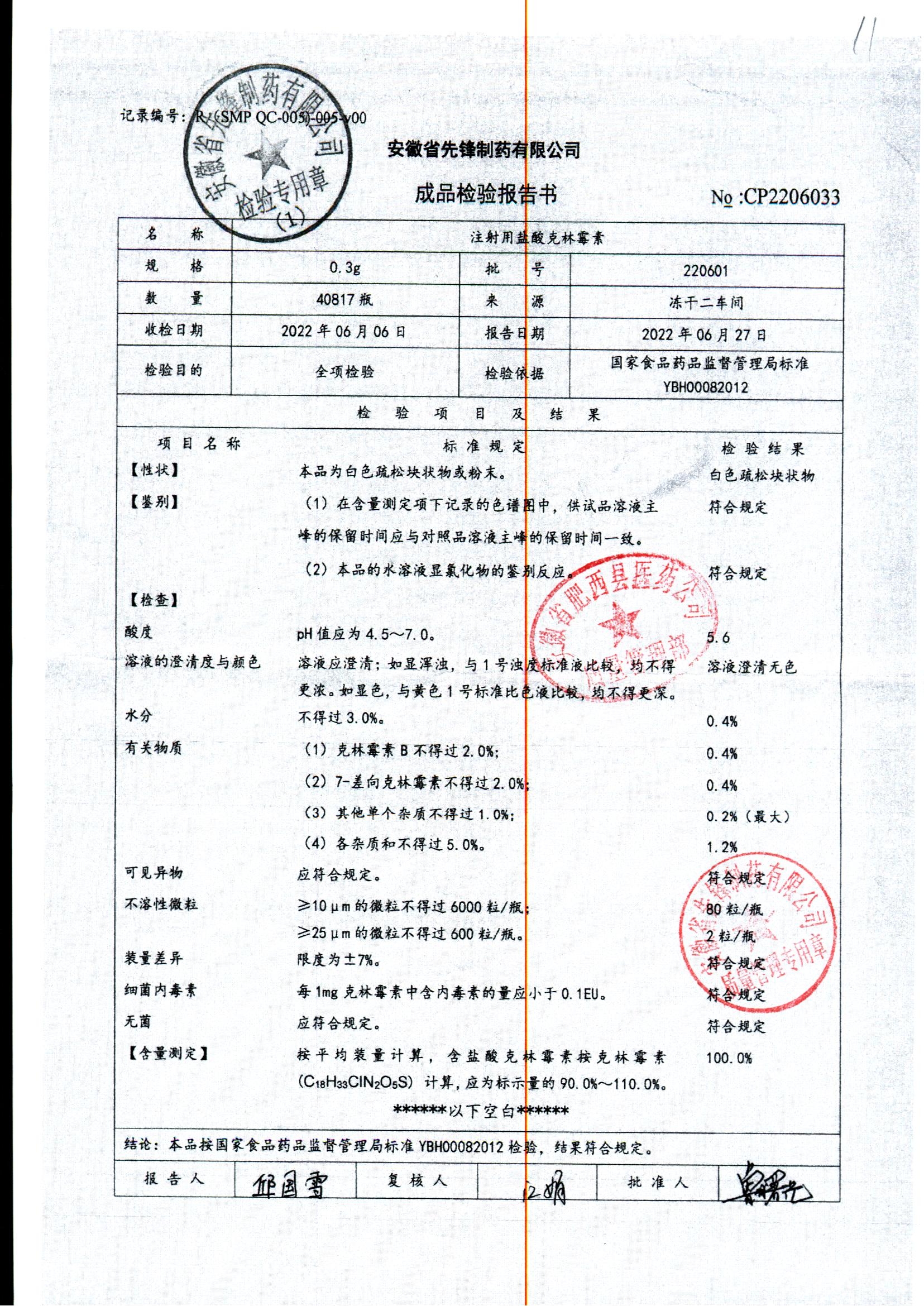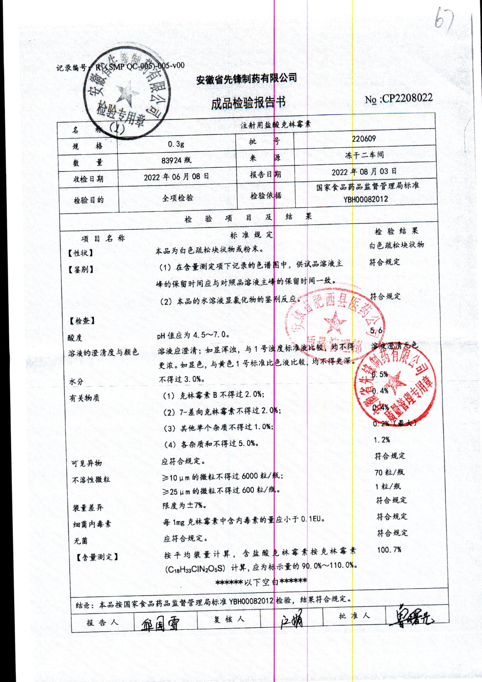 注射用盐酸克林霉素 | 0.3g | 220609 | 查看详情 |