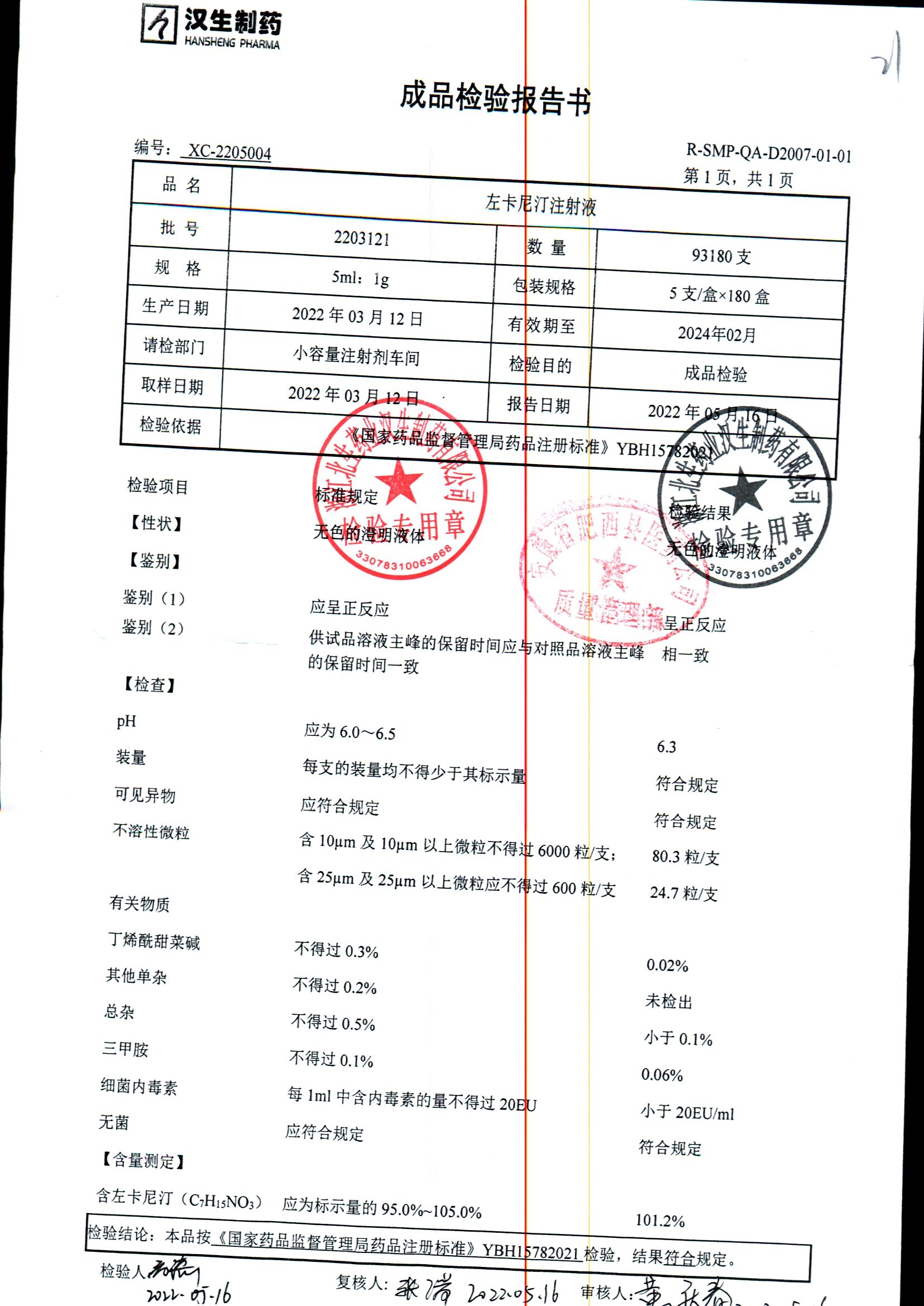左卡尼汀注射液 | 5ml:1g*5支 | 2203211 | 查看详情 |