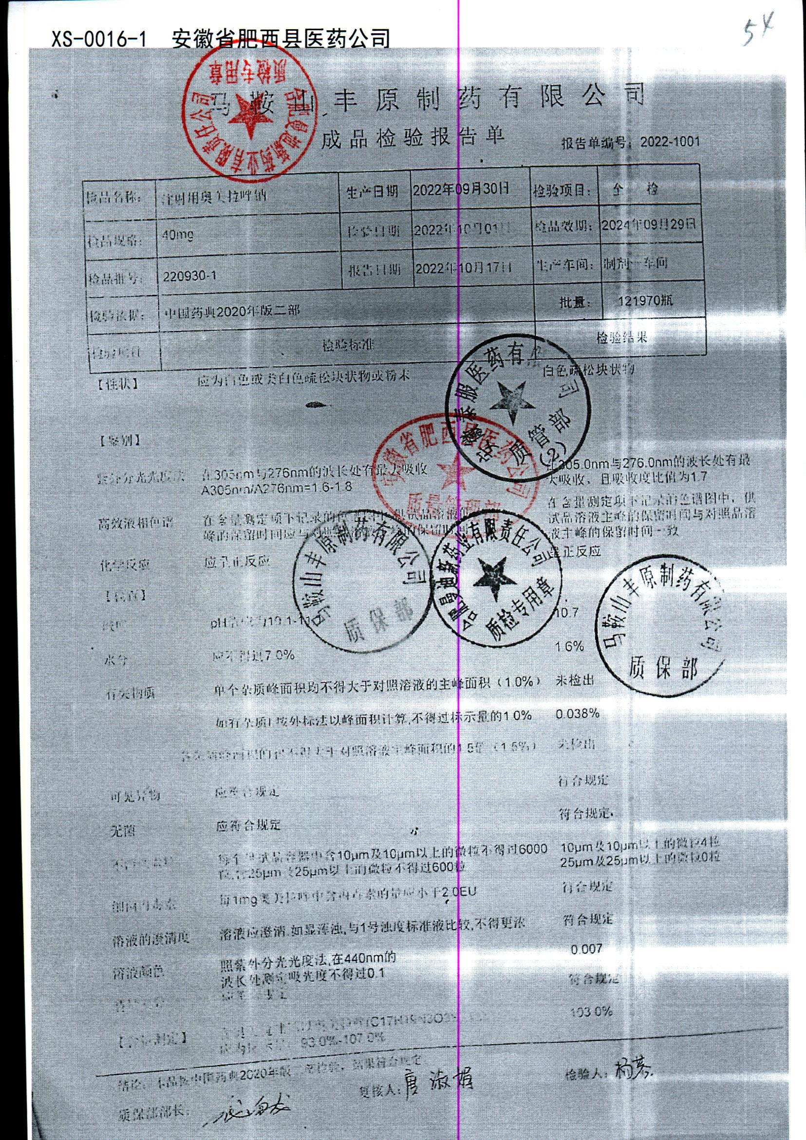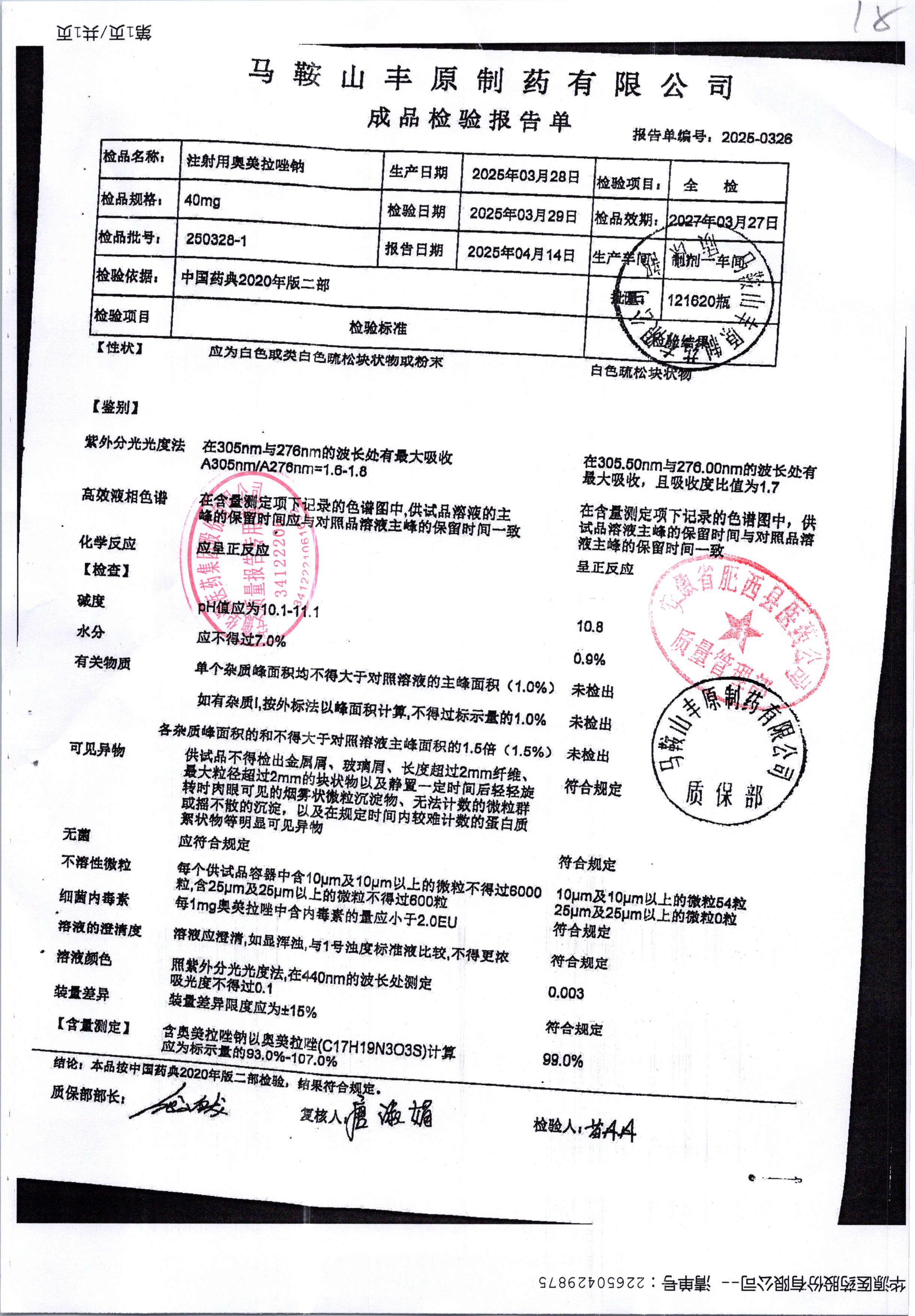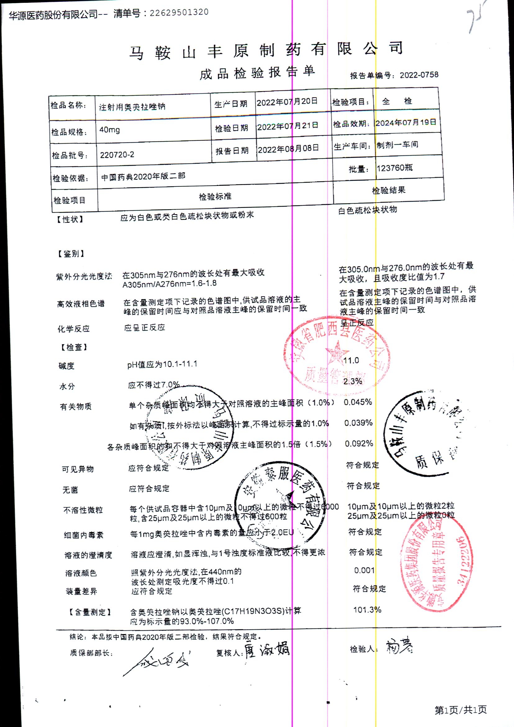 注射用奥美拉唑钠 | 40mg | 220724-1 | 查看详情 |