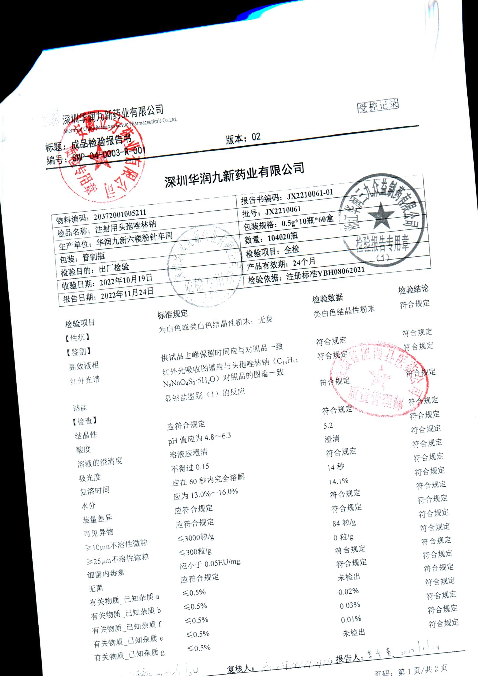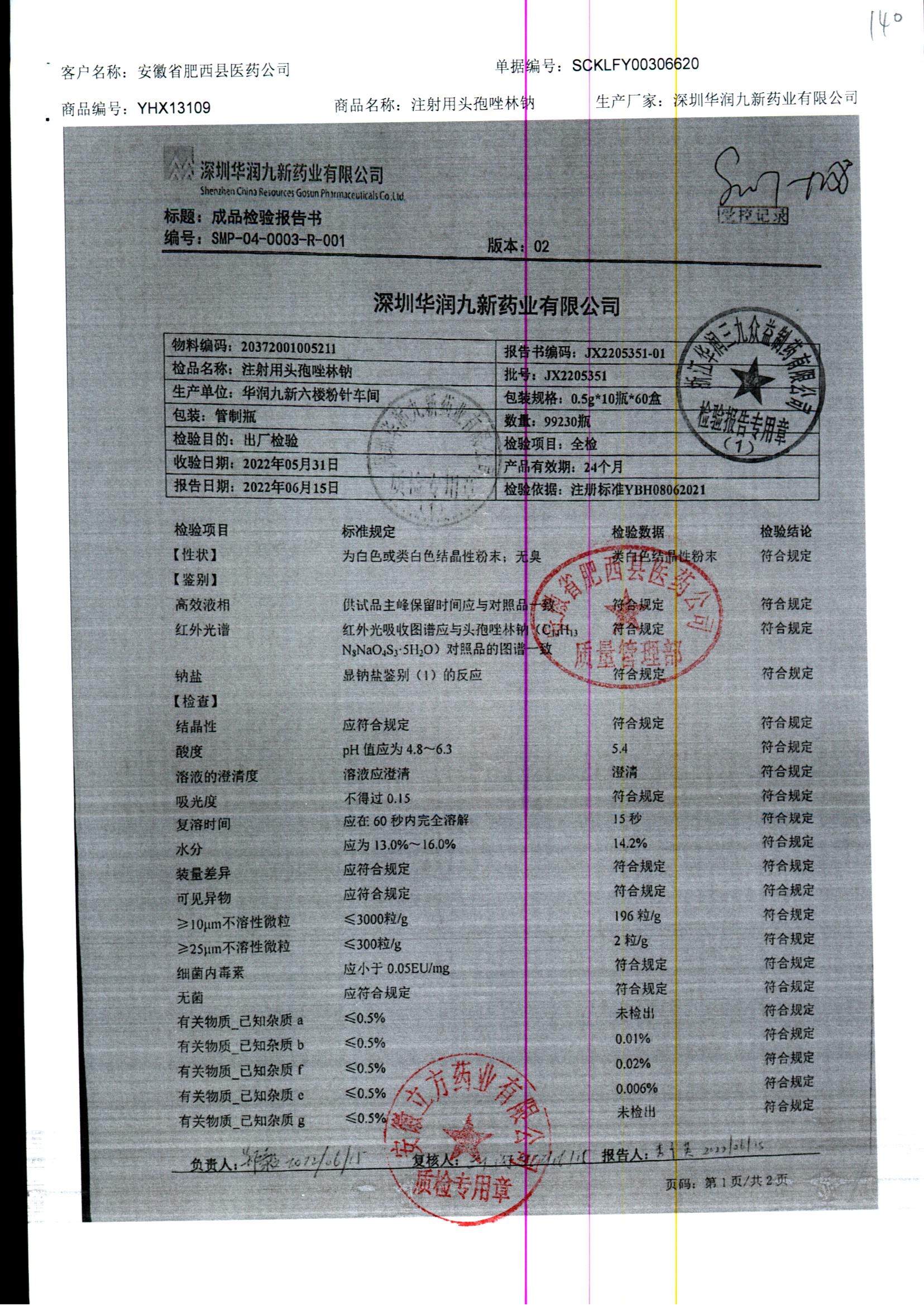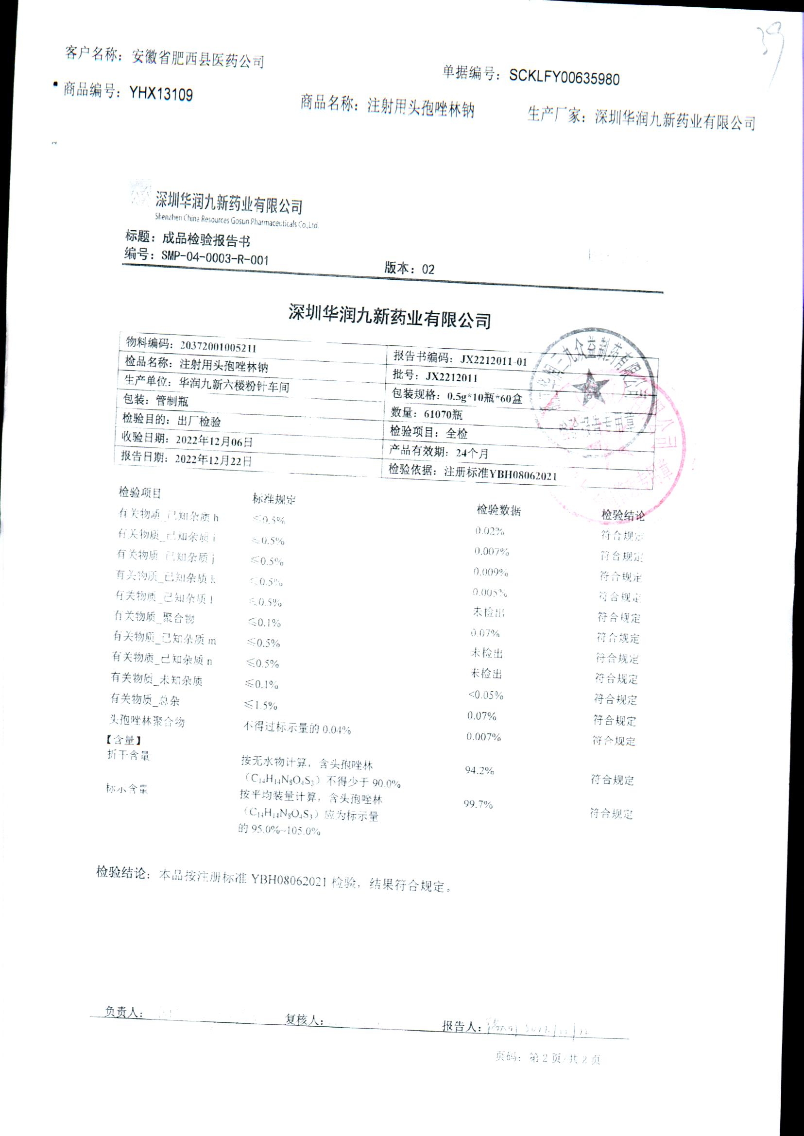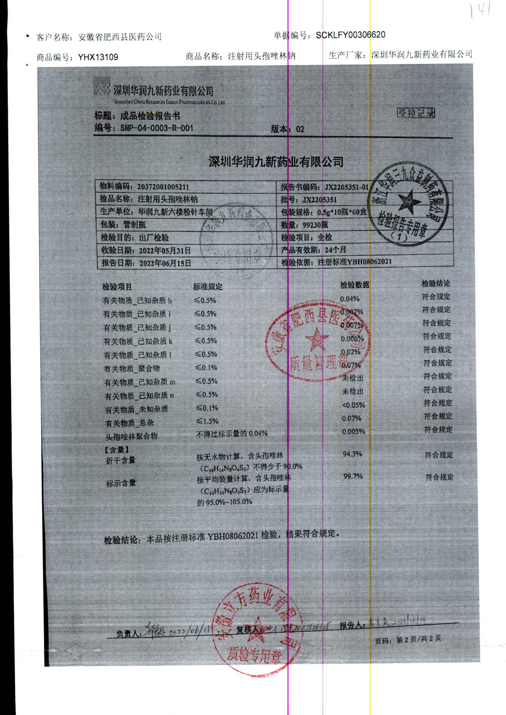 注射用头孢唑啉钠 | 0.5g*10瓶 | JX2209051/2 | 查看详情 |
