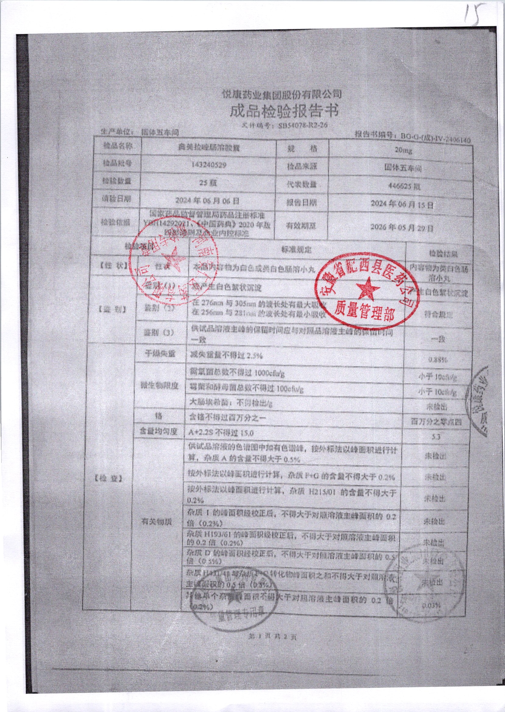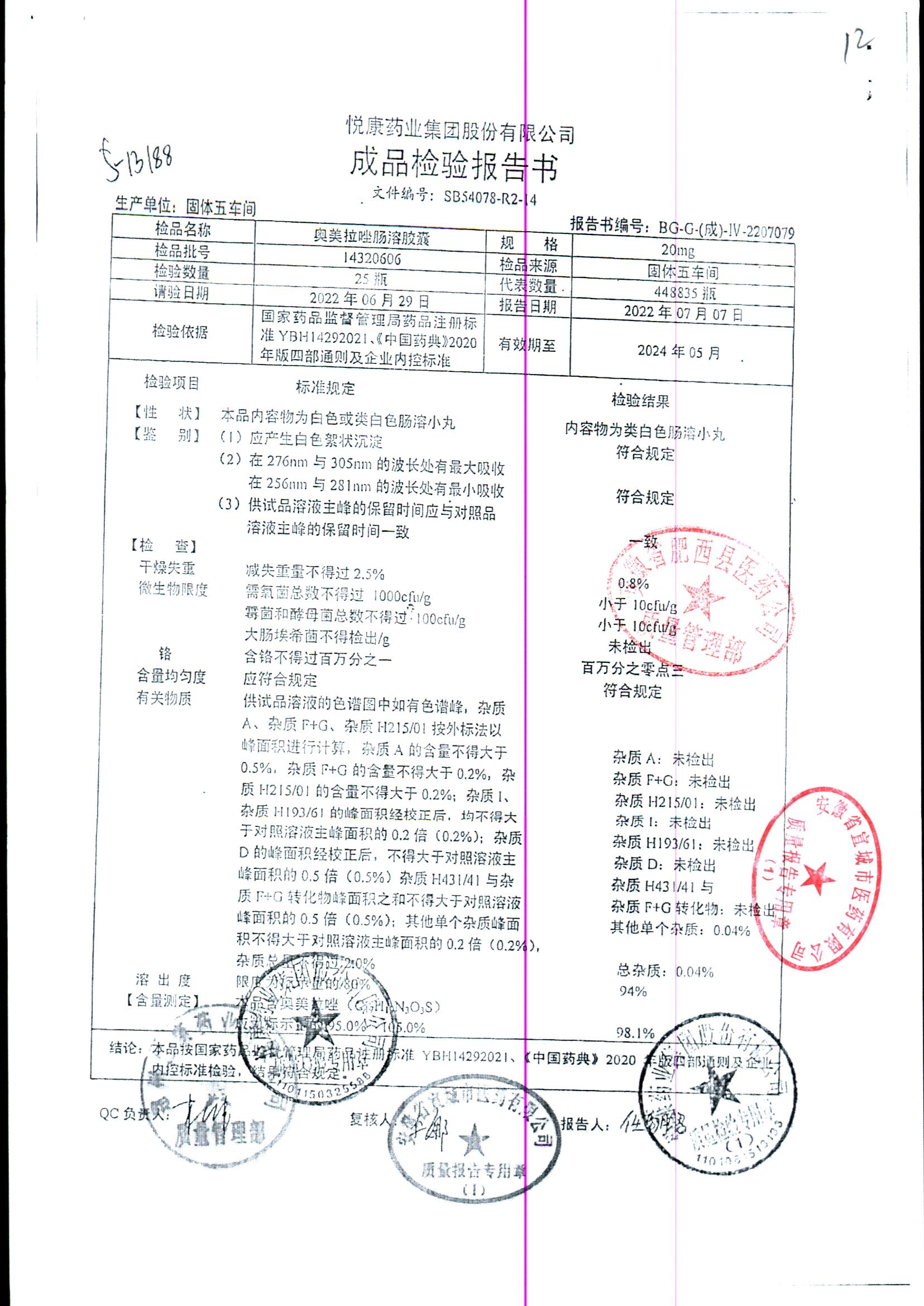 奥美拉唑肠溶胶囊 | 20mg | 143240529/1 | 查看详情 |