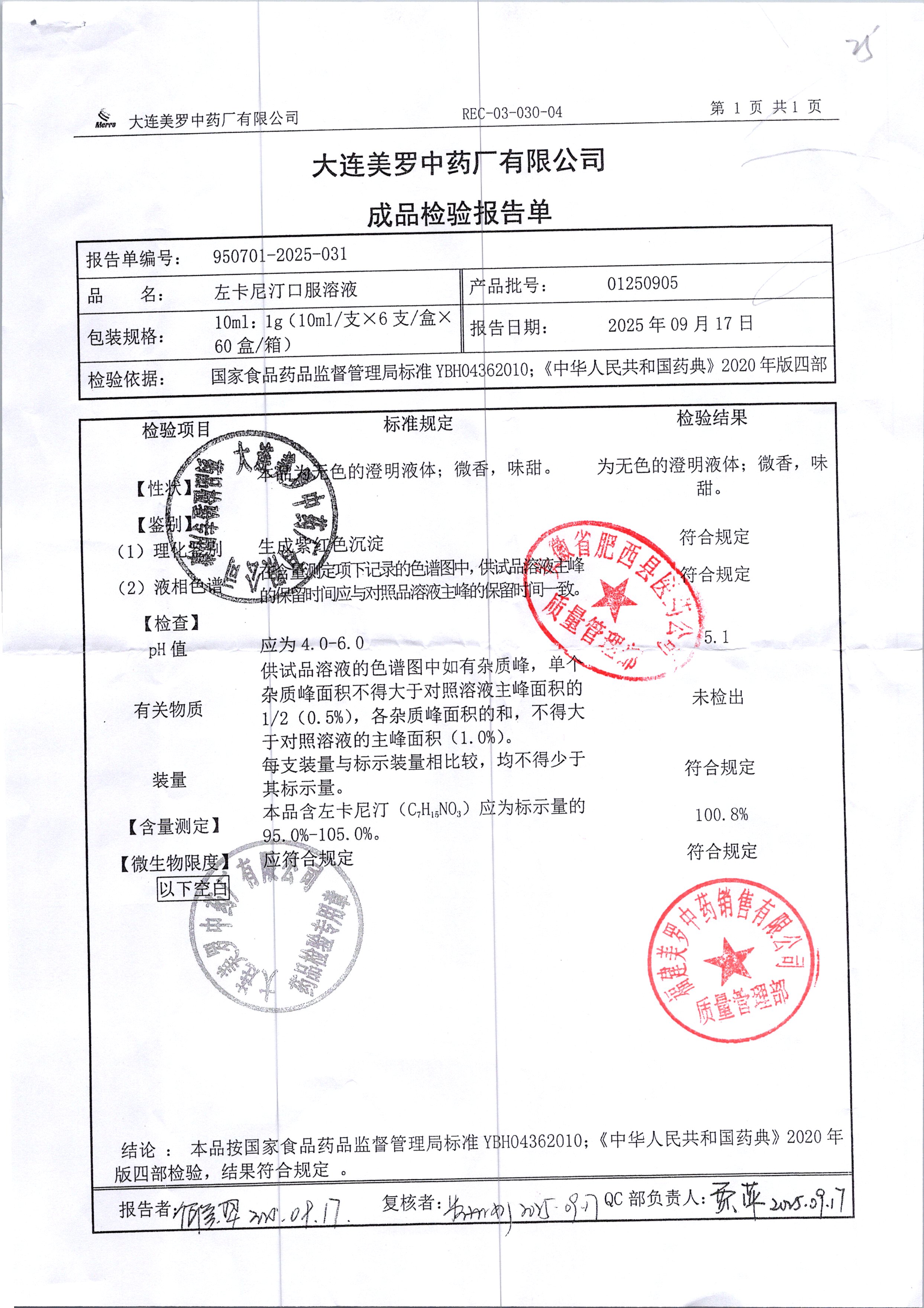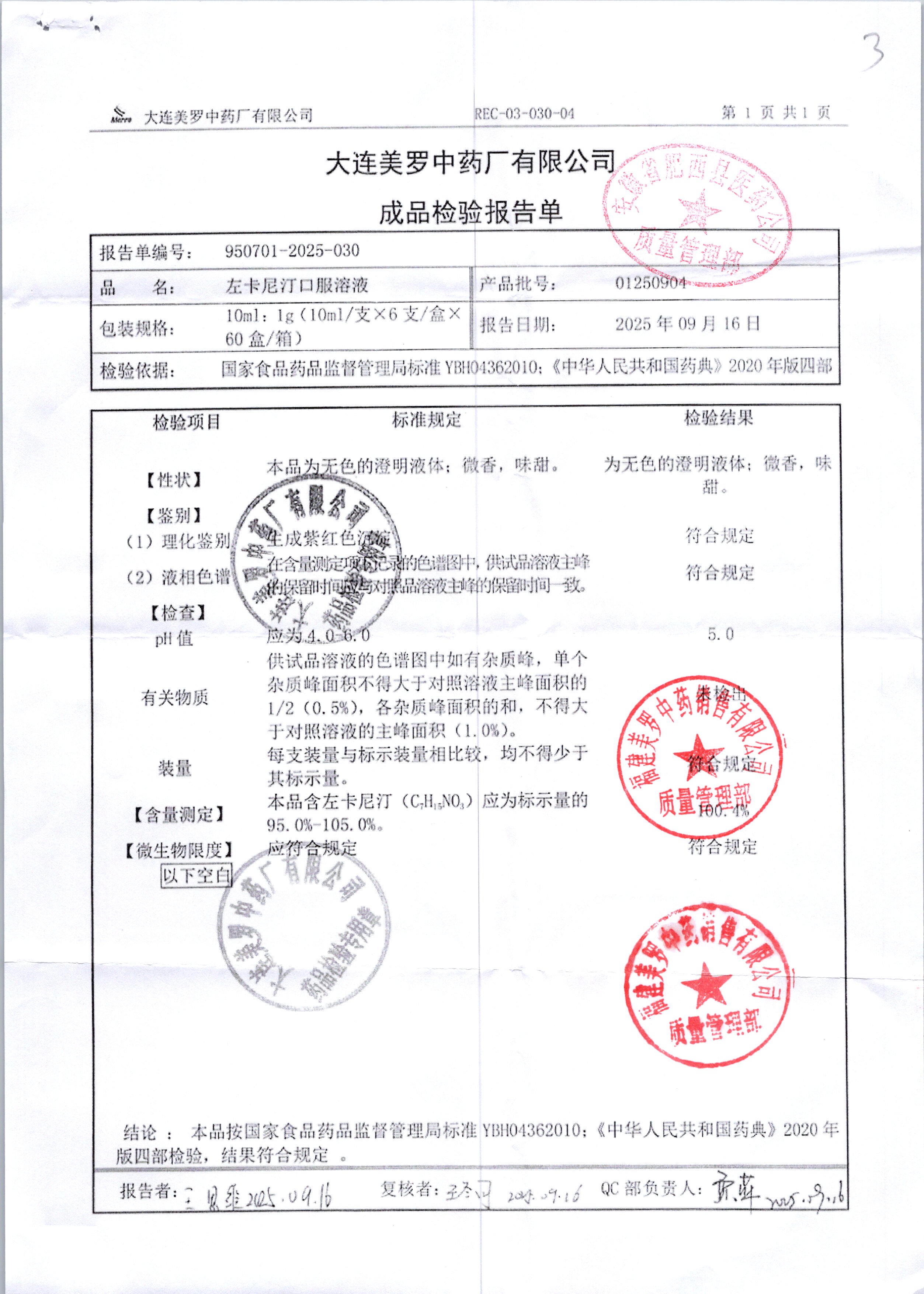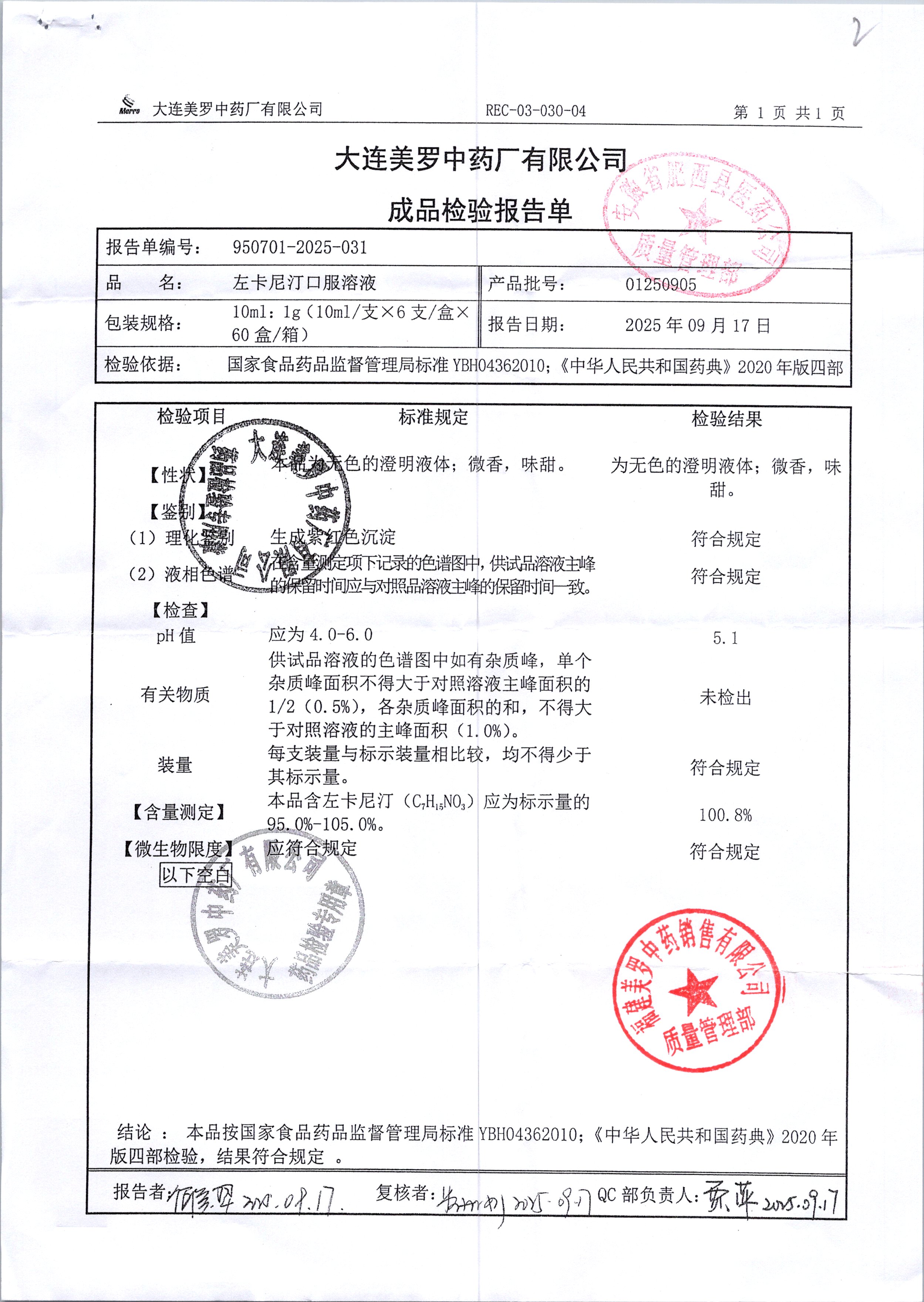 | 左卡尼汀口服溶液 | 10ml:1g*6支 | 01240607 | 查看详情 |