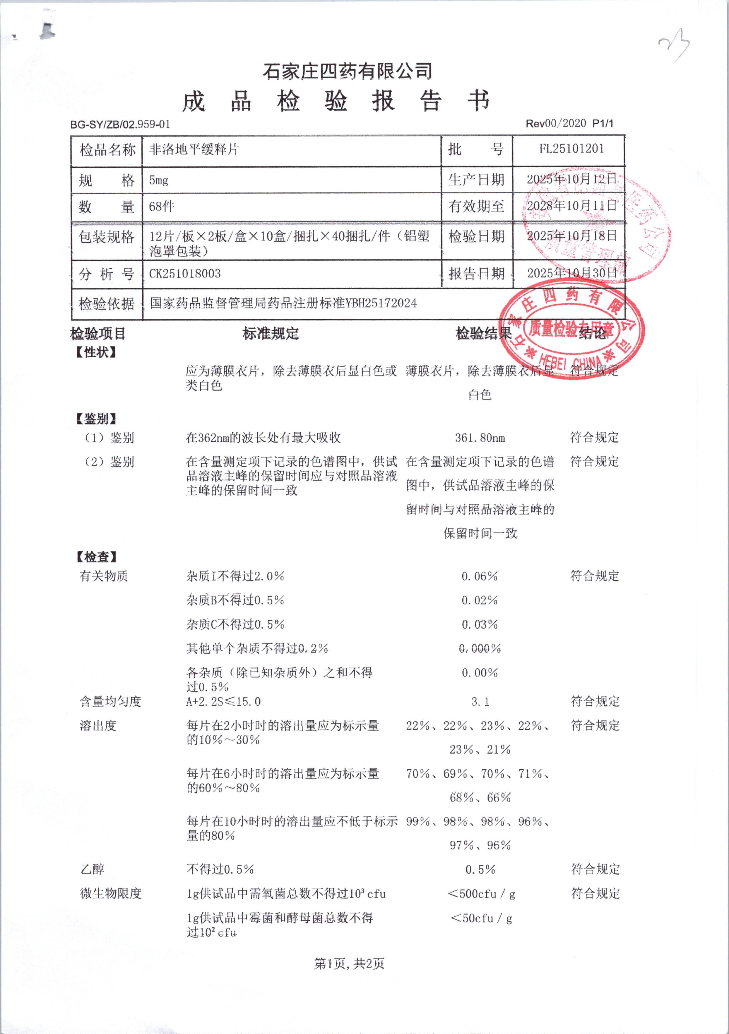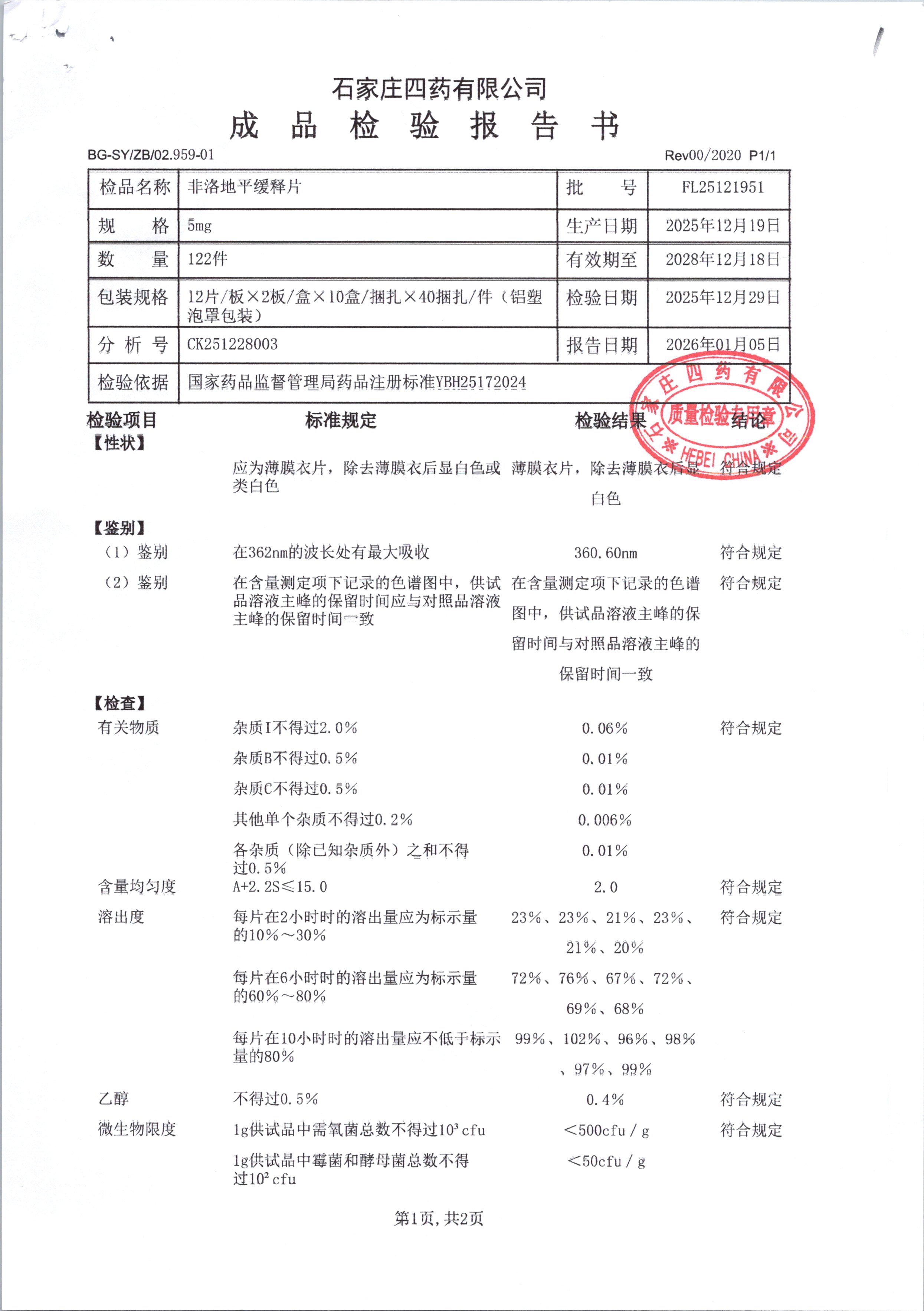 | 非洛地平缓释片 | 5mg*24粒 | FL25121951/1 | 查看详情 |