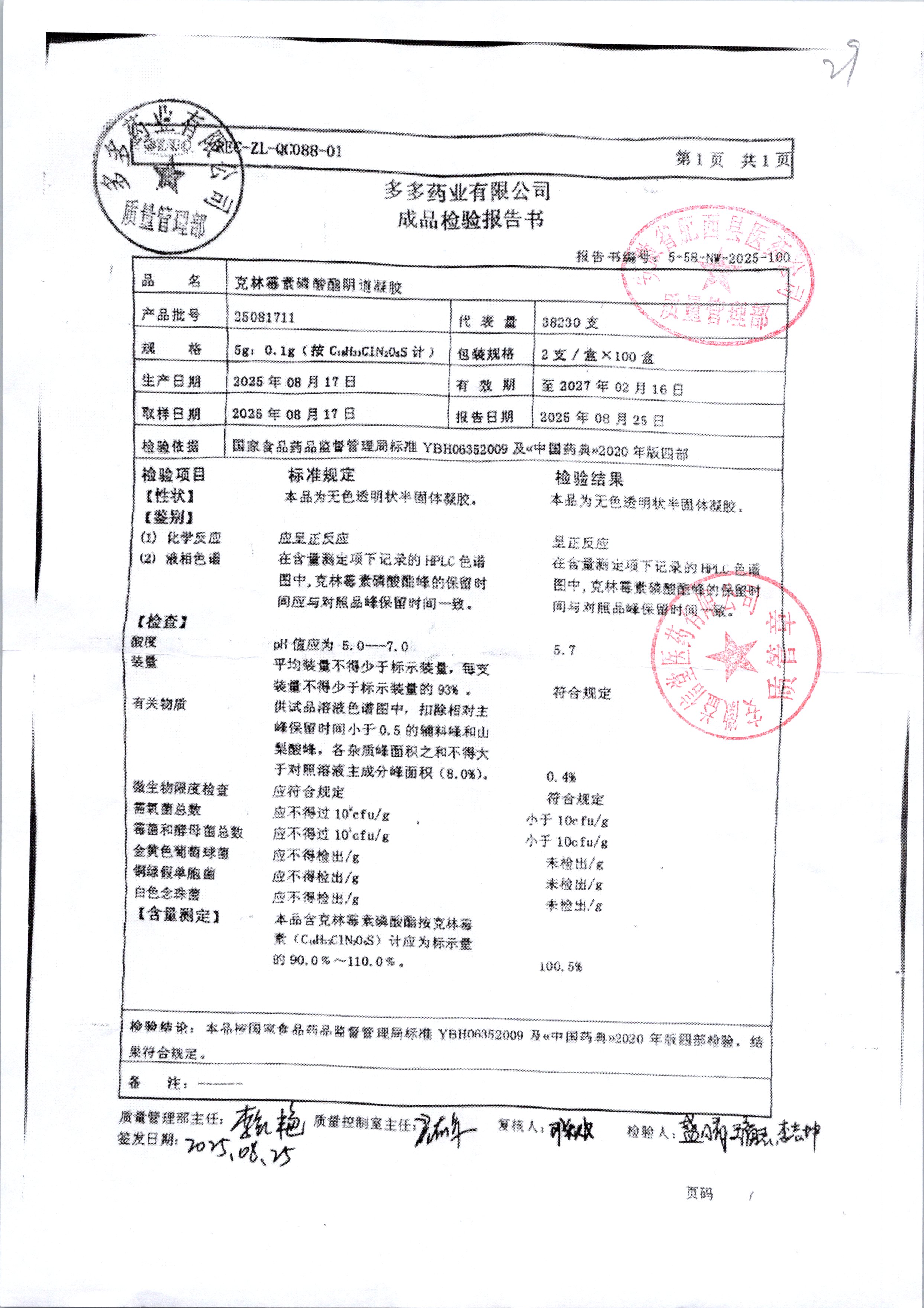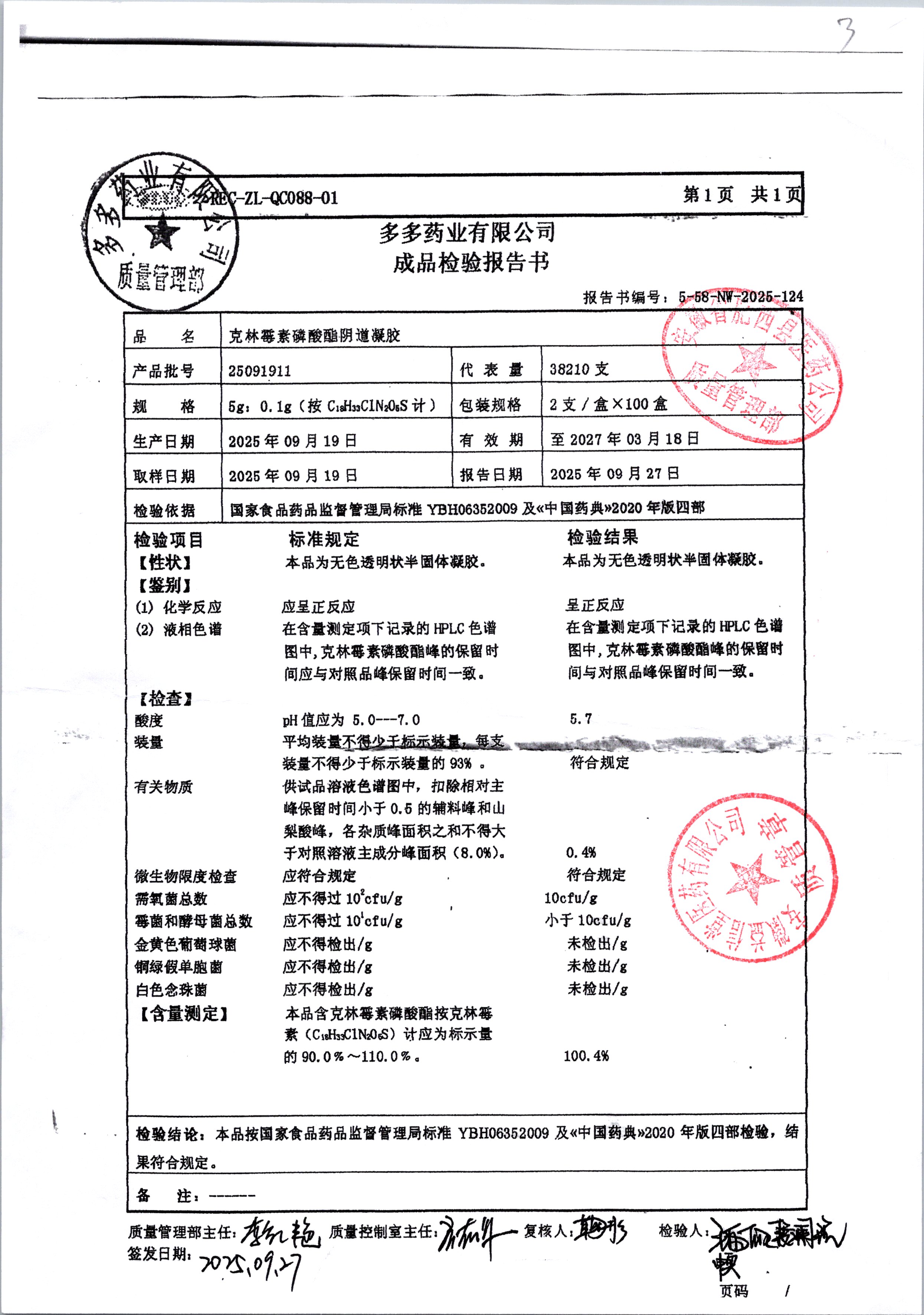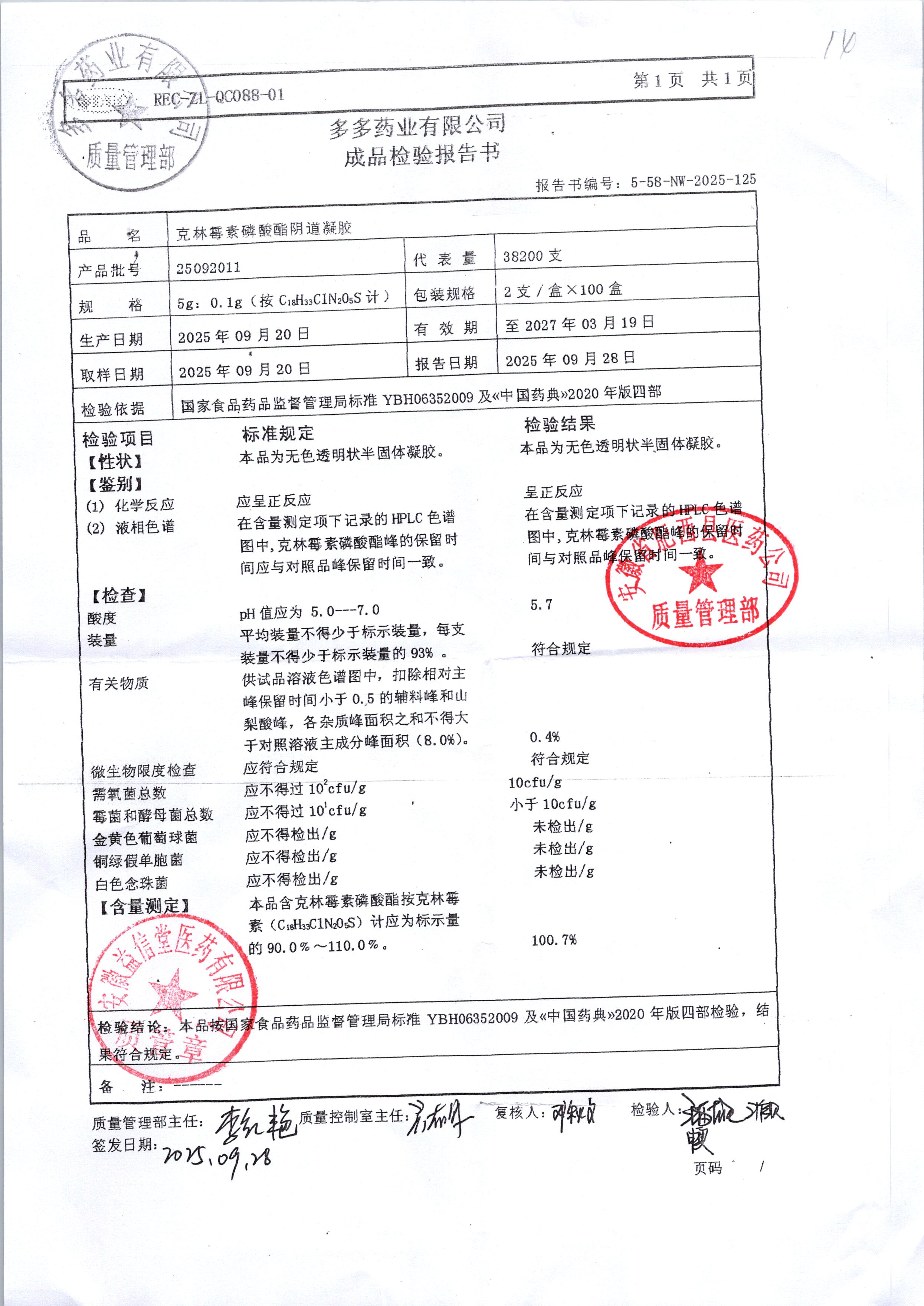 | 克林霉素磷酸酯阴道凝胶 | 5g:0.1g | 25092011 | 查看详情 |
