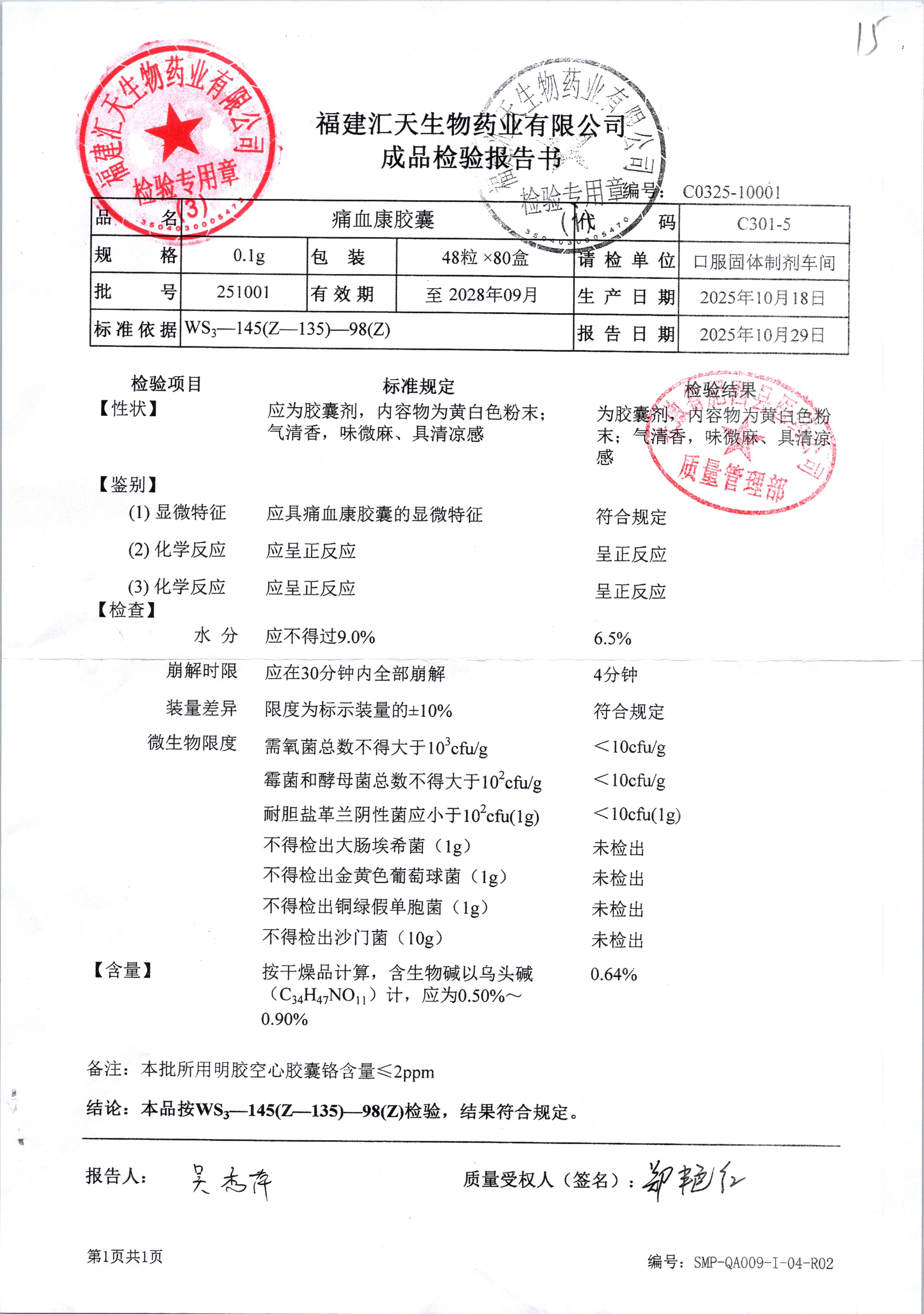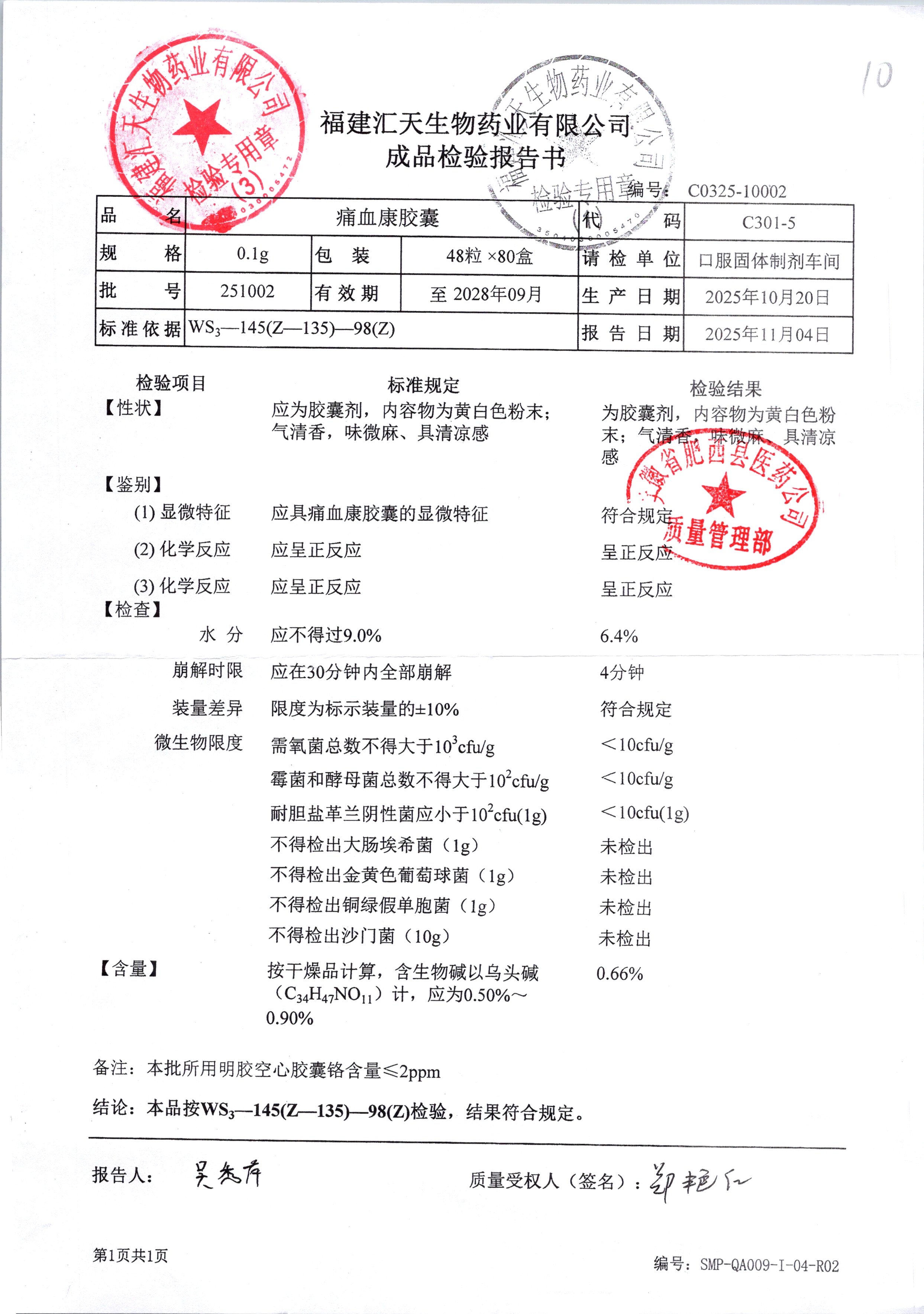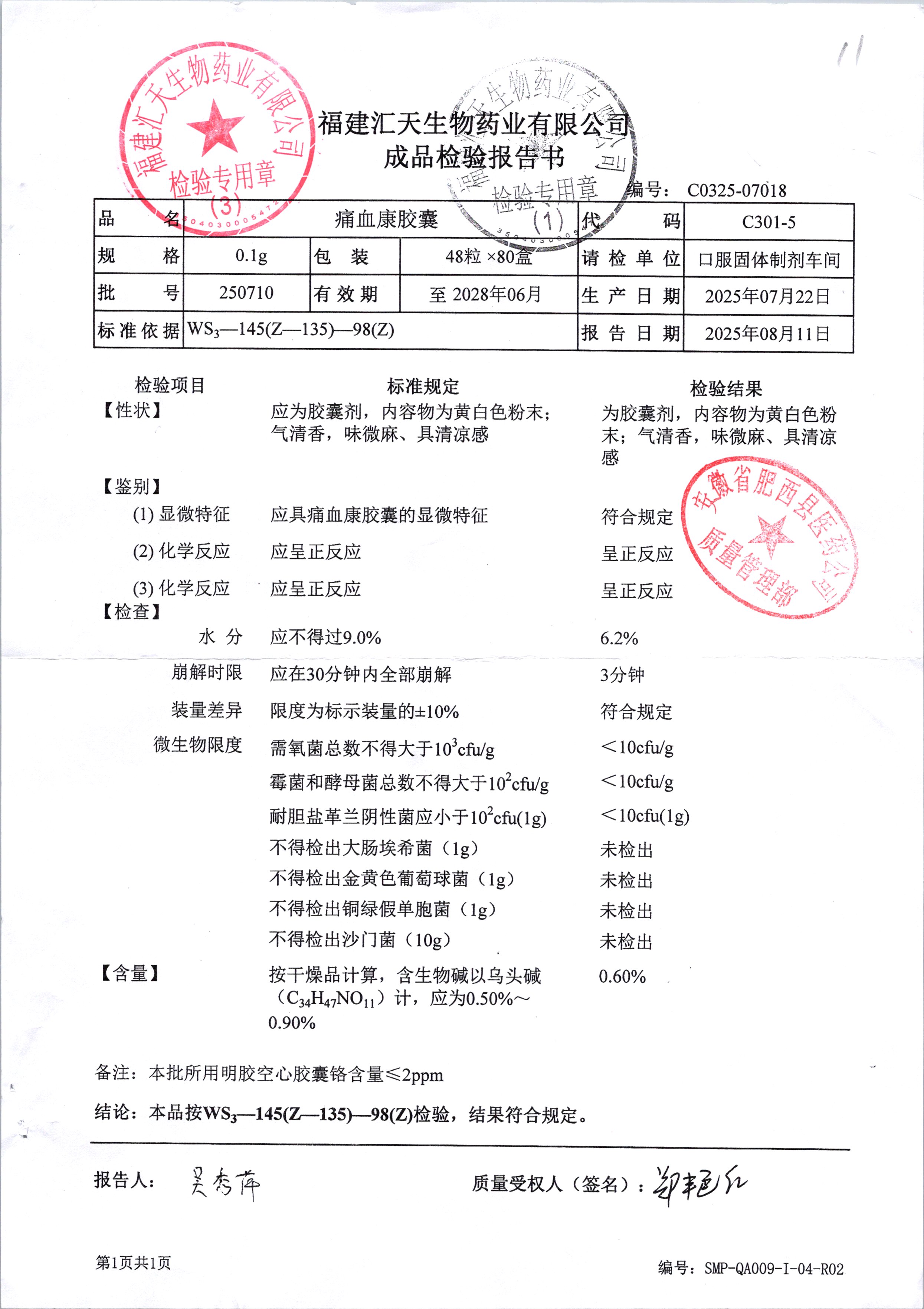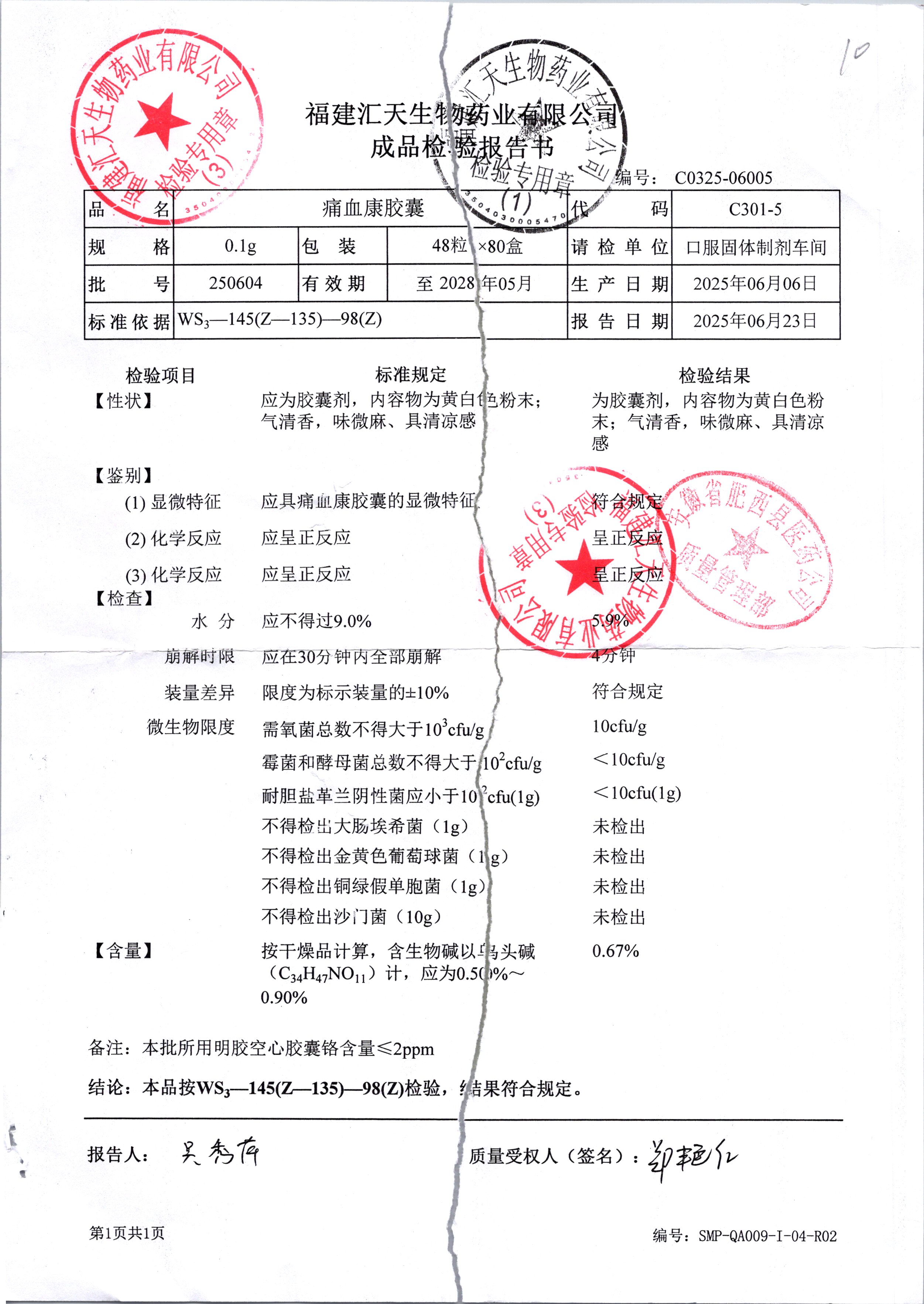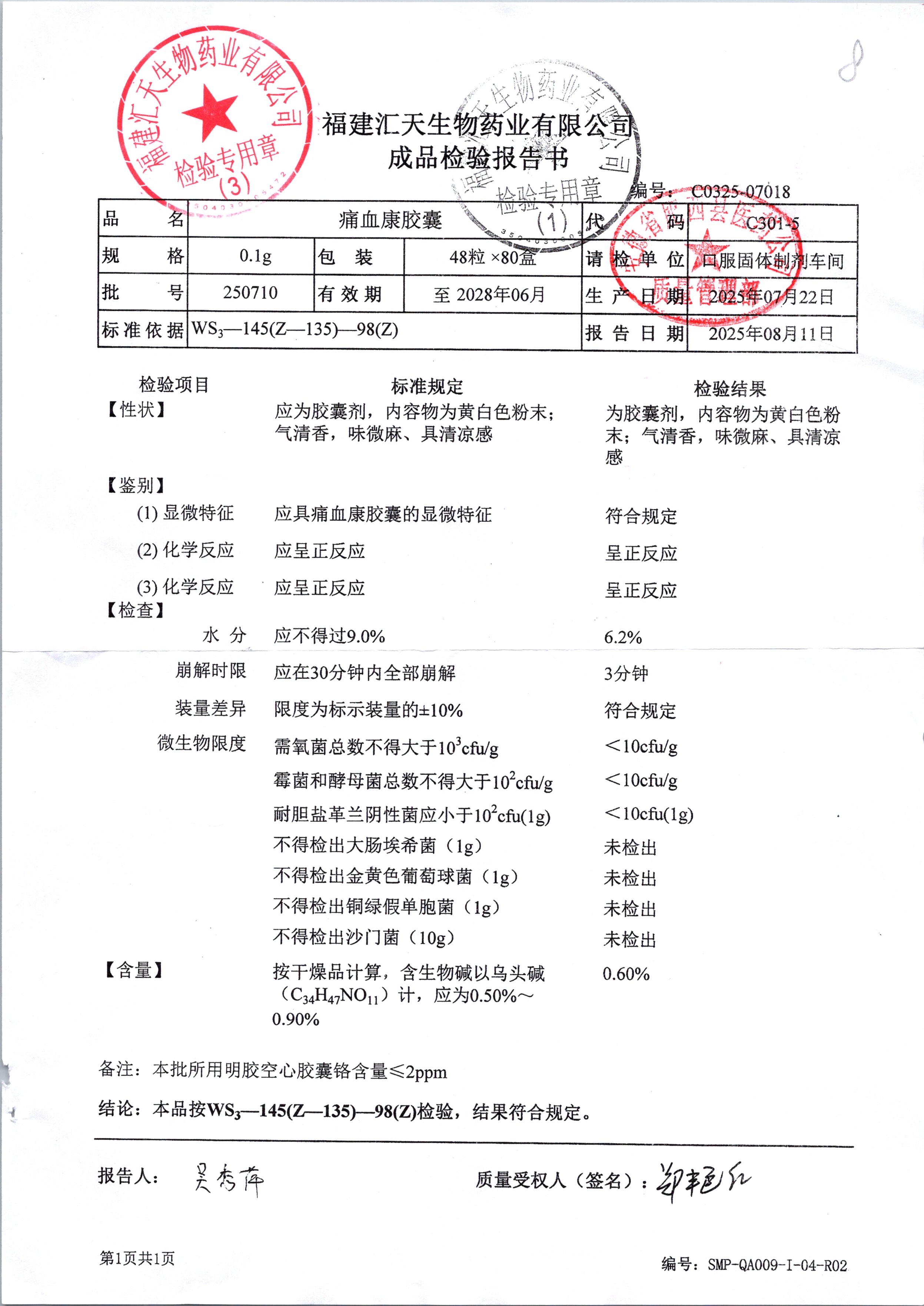 | 痛血康胶囊 | 0.1g*48粒 | 250501 | 查看详情 |