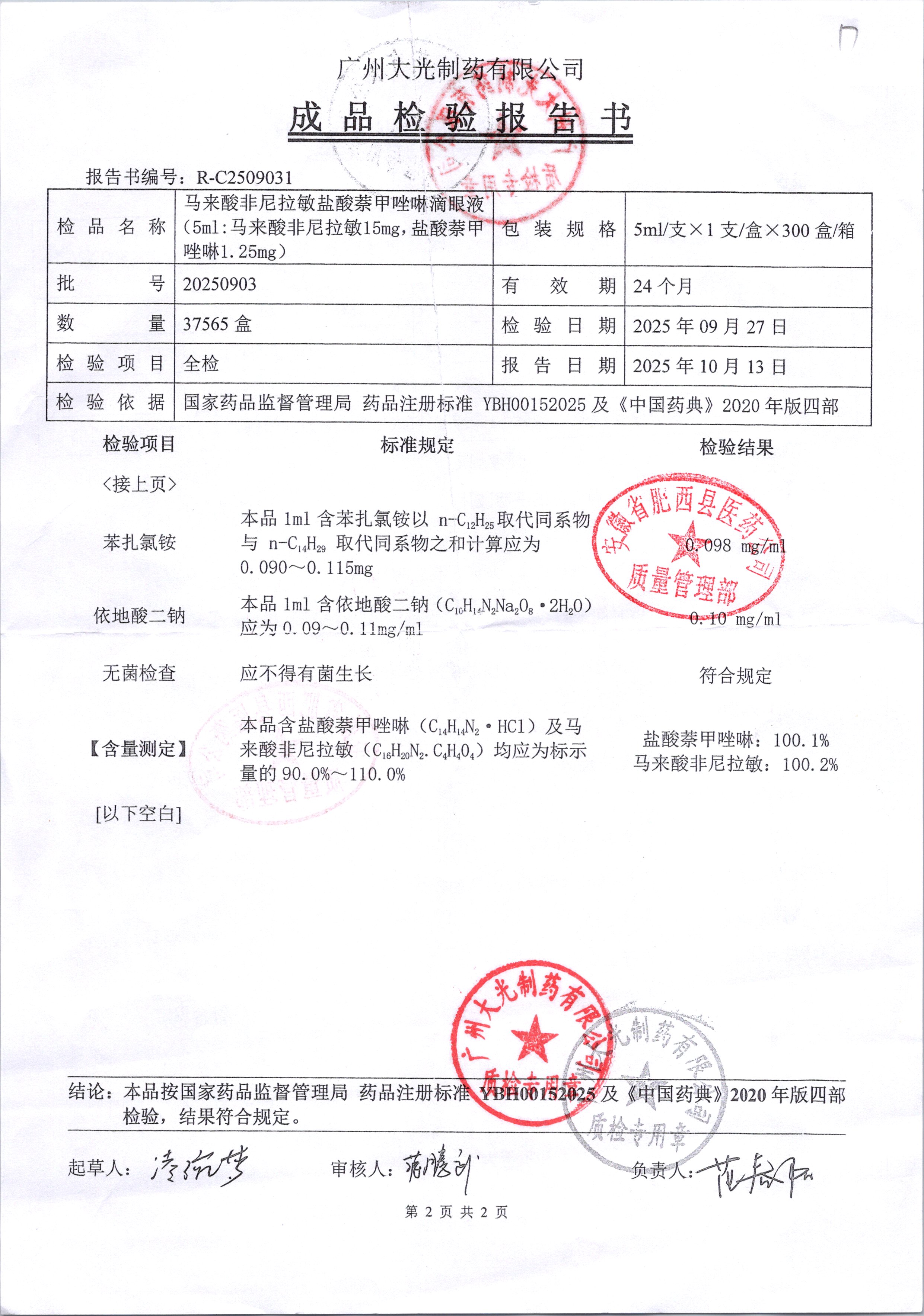 | 马来酸非尼拉敏盐酸萘甲唑啉滴眼液 | 5ml | 20250905/2 | 查看详情 |