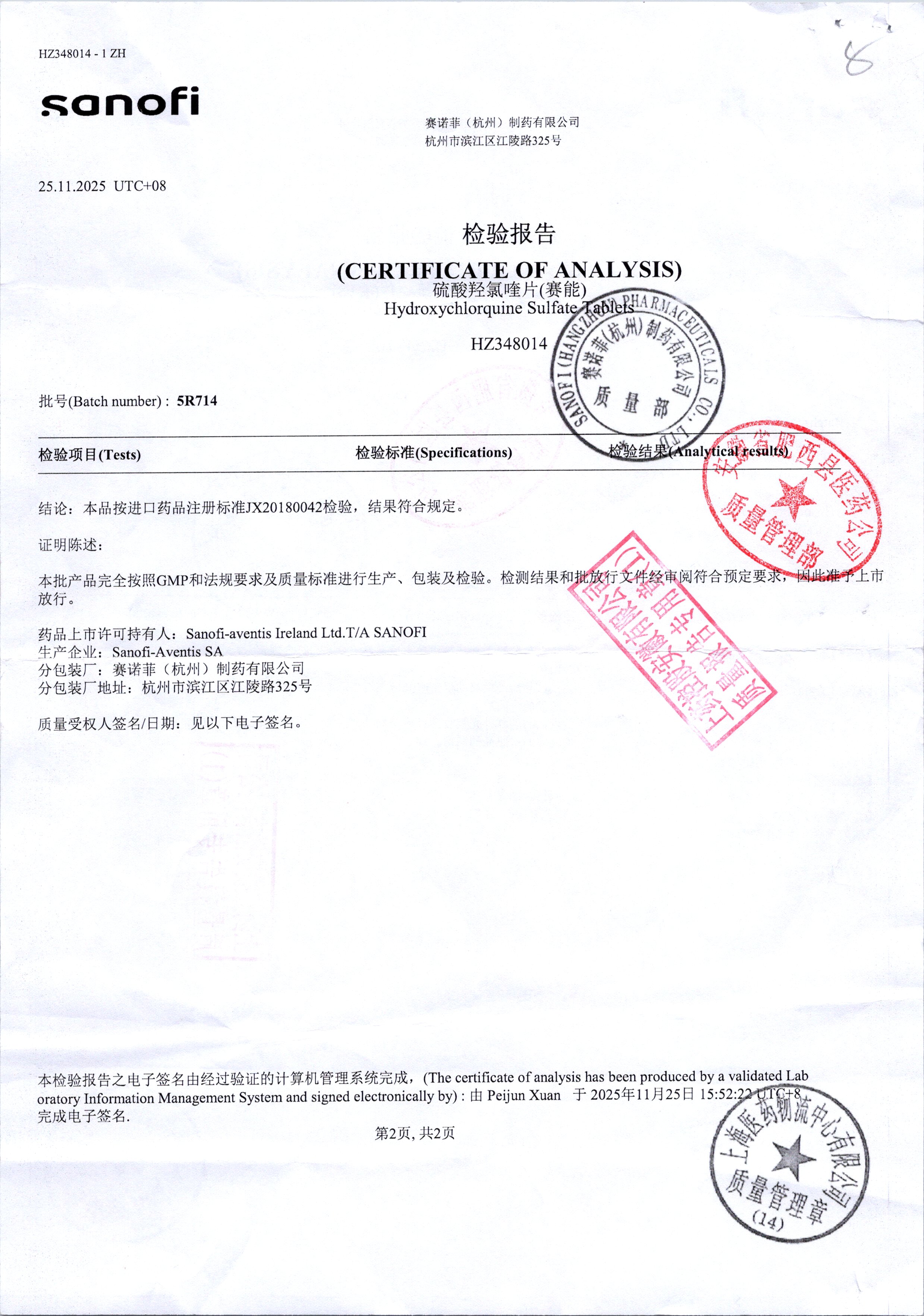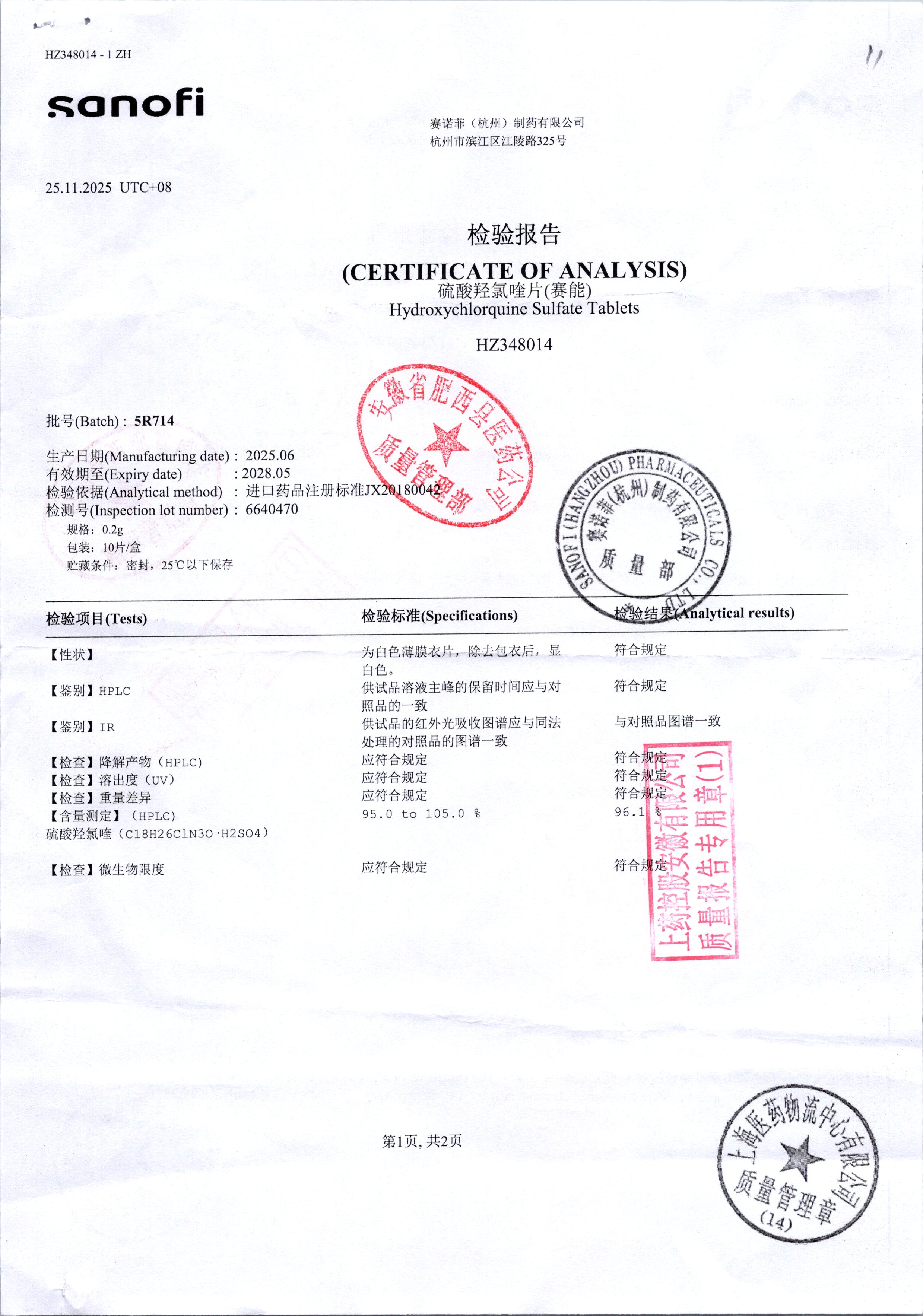 | 硫酸羟氯喹片 | 0.2*10s | 5R714/1 | 查看详情 |