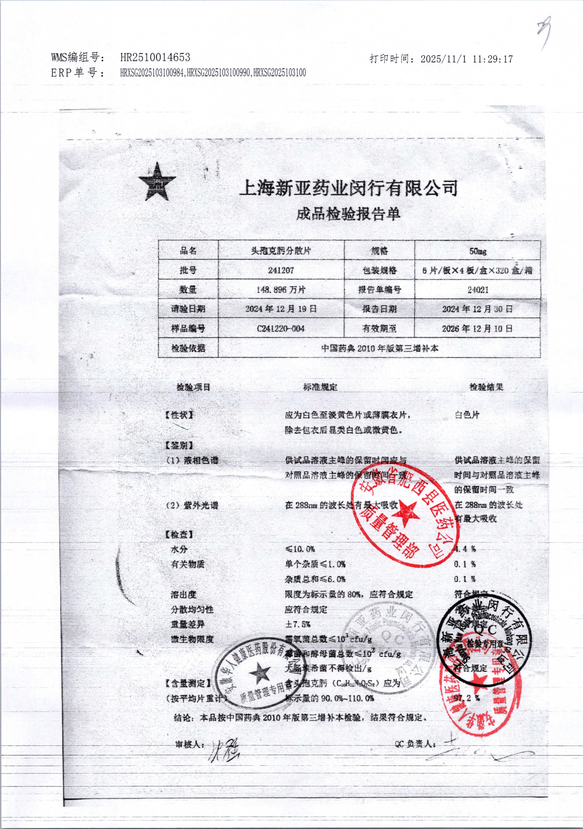 | 头孢克肟分散片 | 50mg*24s | 241203 | 查看详情 |