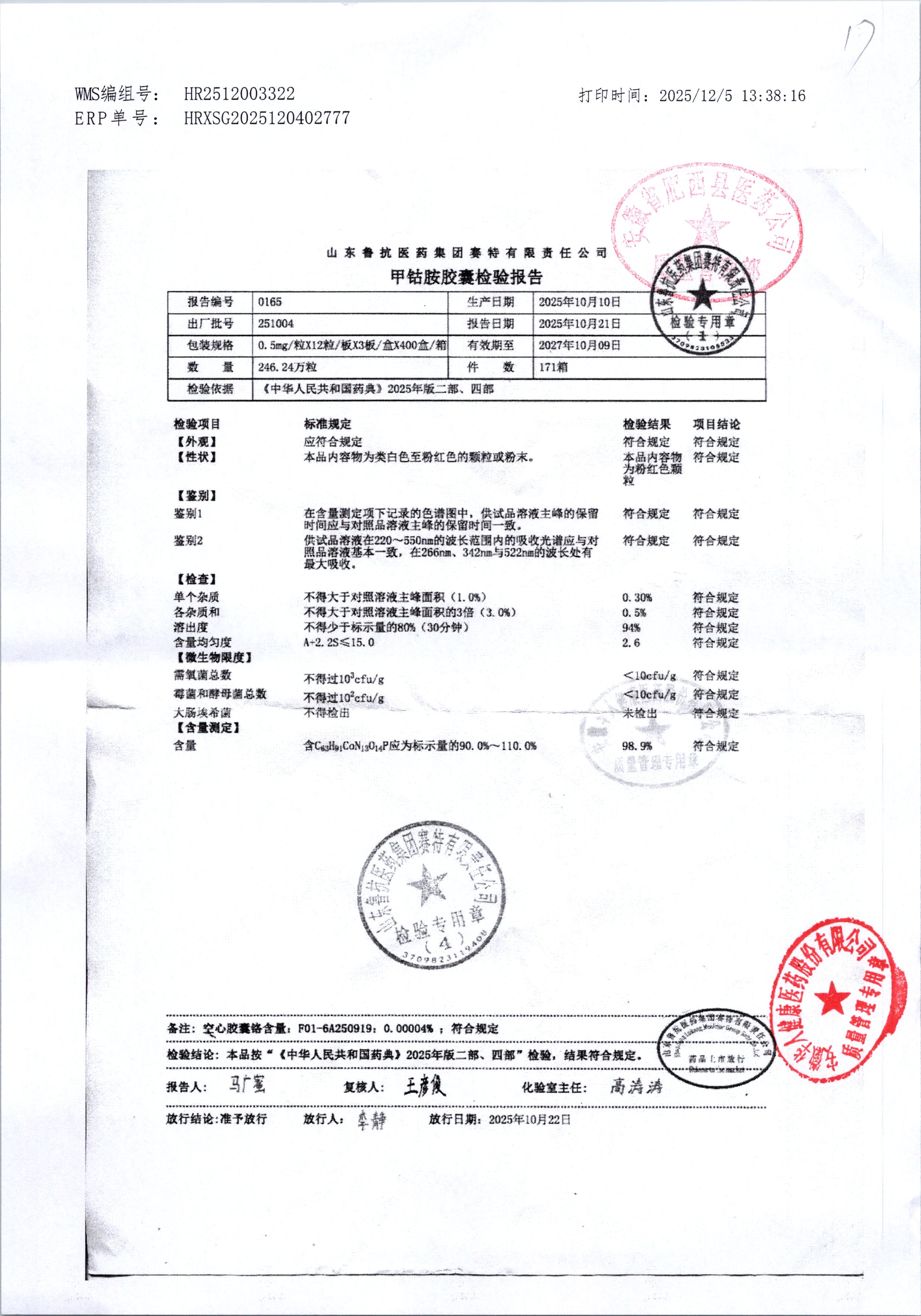| 甲钴胺胶囊 | 0.5mg*36粒 | 201007 | 查看详情 |