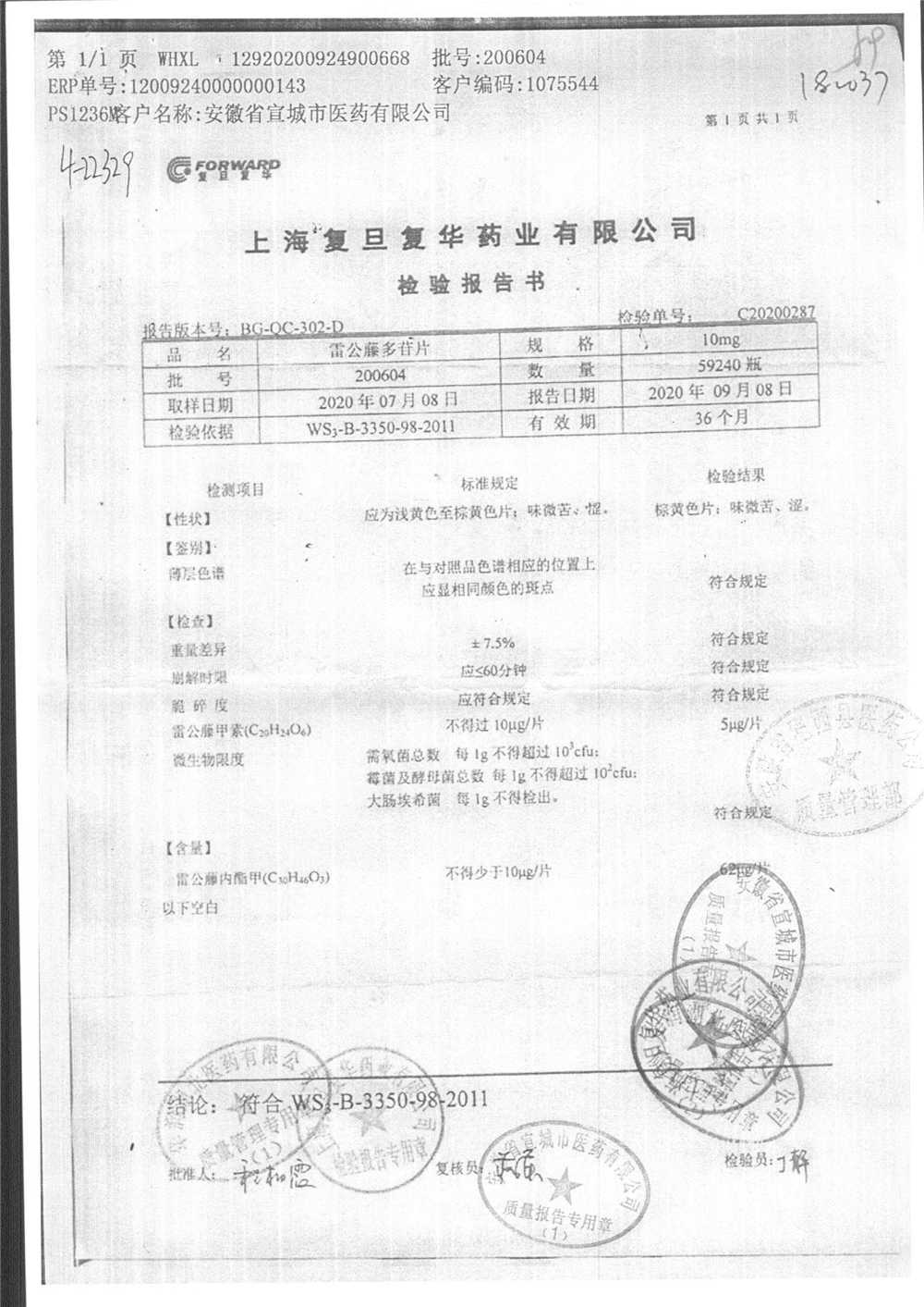 雷公藤多苷片 | 10mg | 200604 | 查看详情 |