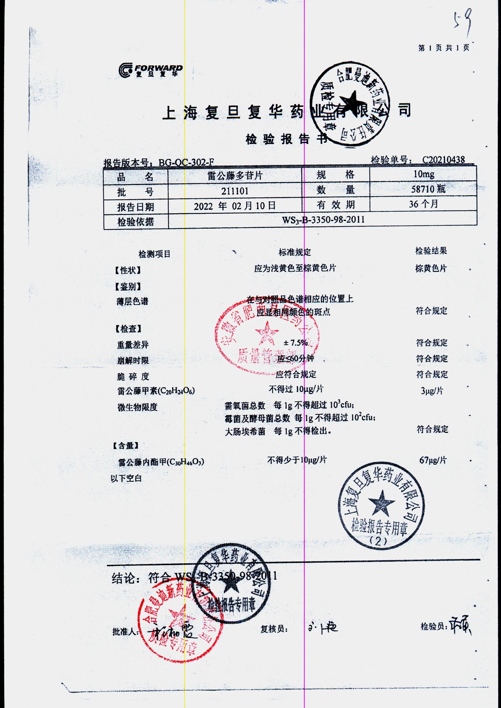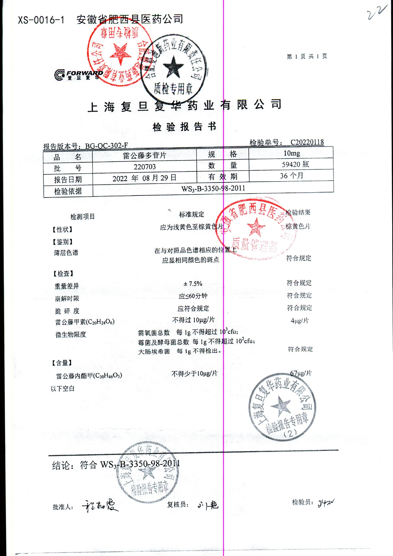雷公藤多苷片 | 10mg | 220703 | 查看详情 |