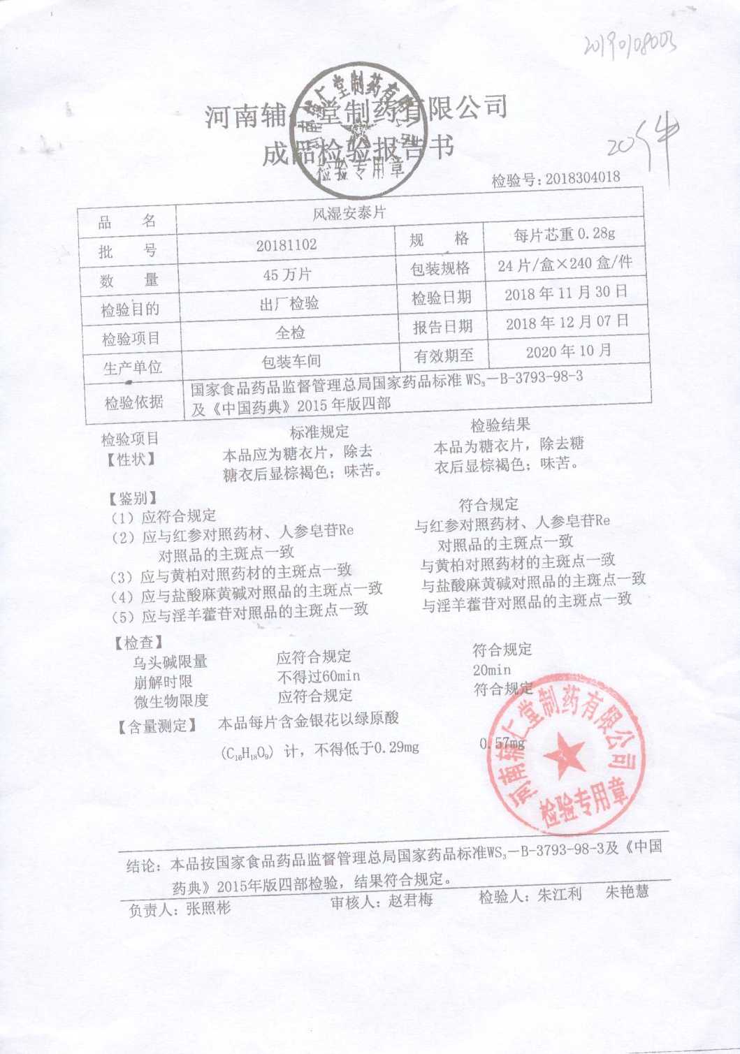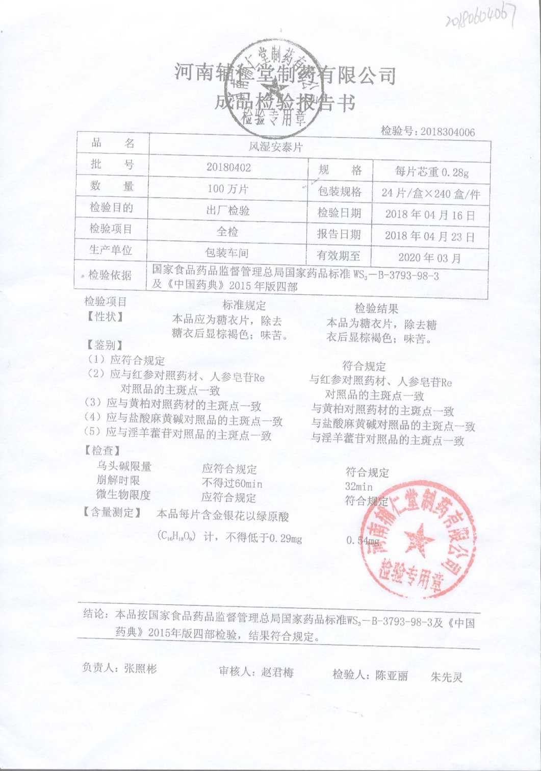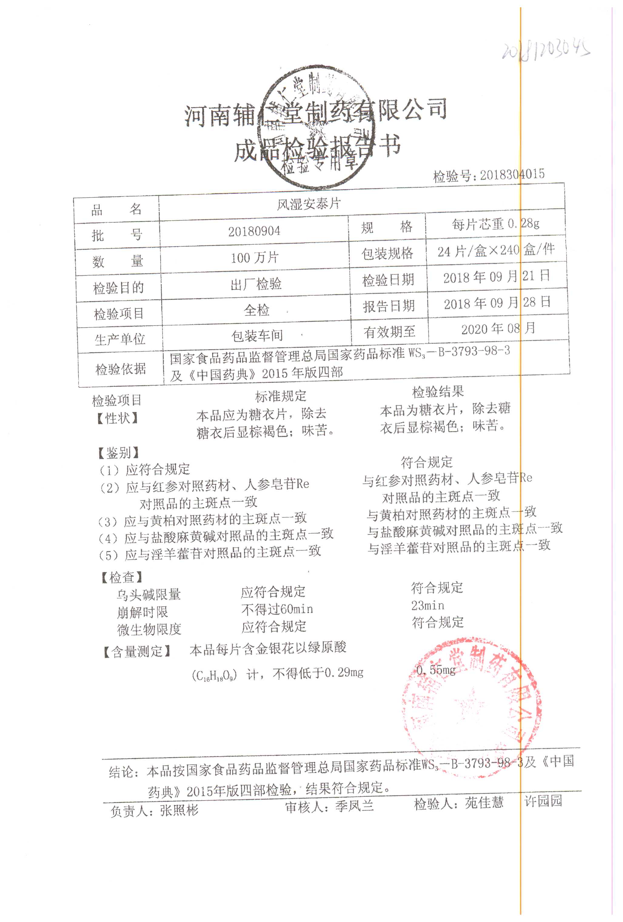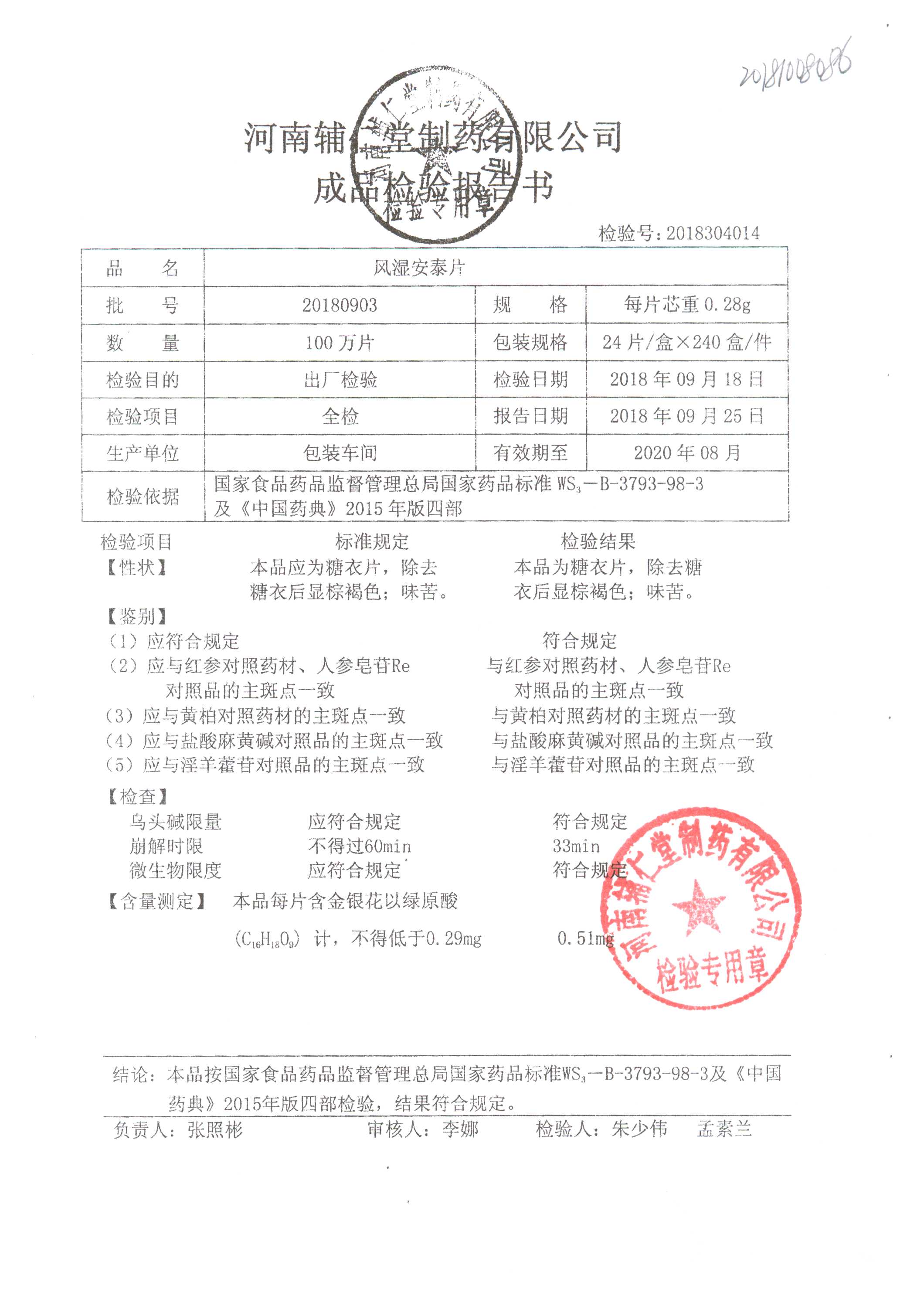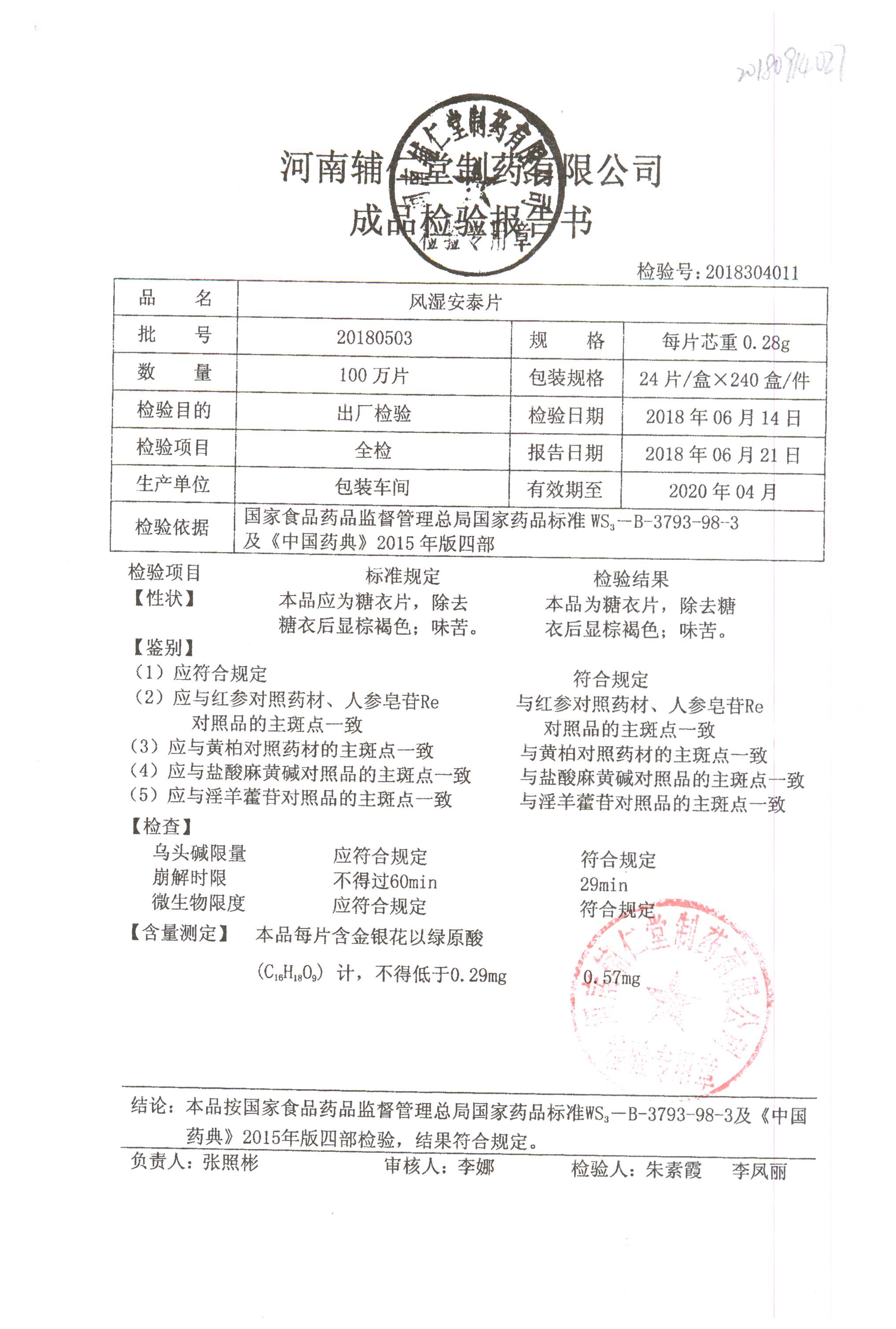 风湿安泰片 | 0.28g*24片 | 20180904 | 查看详情 |