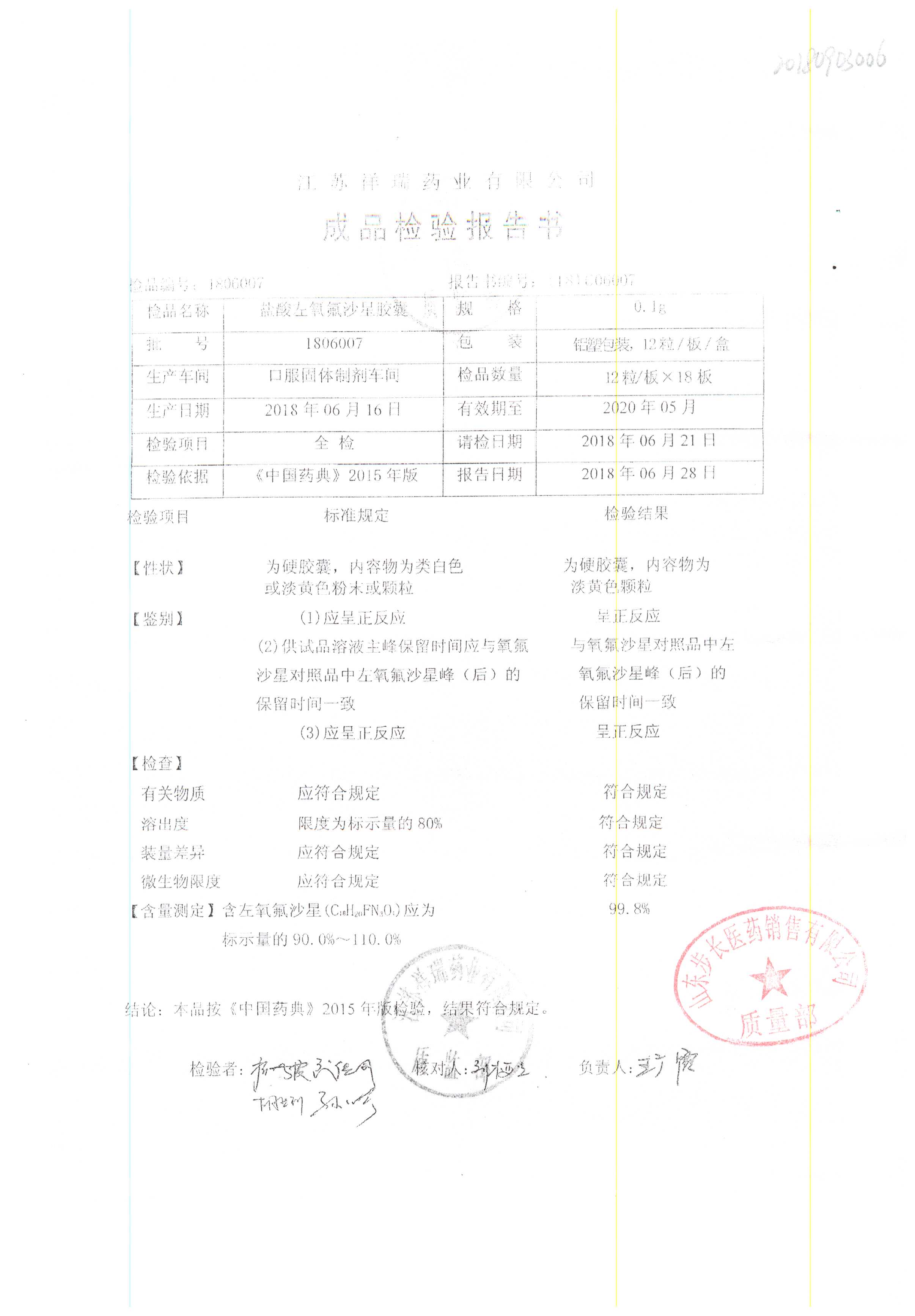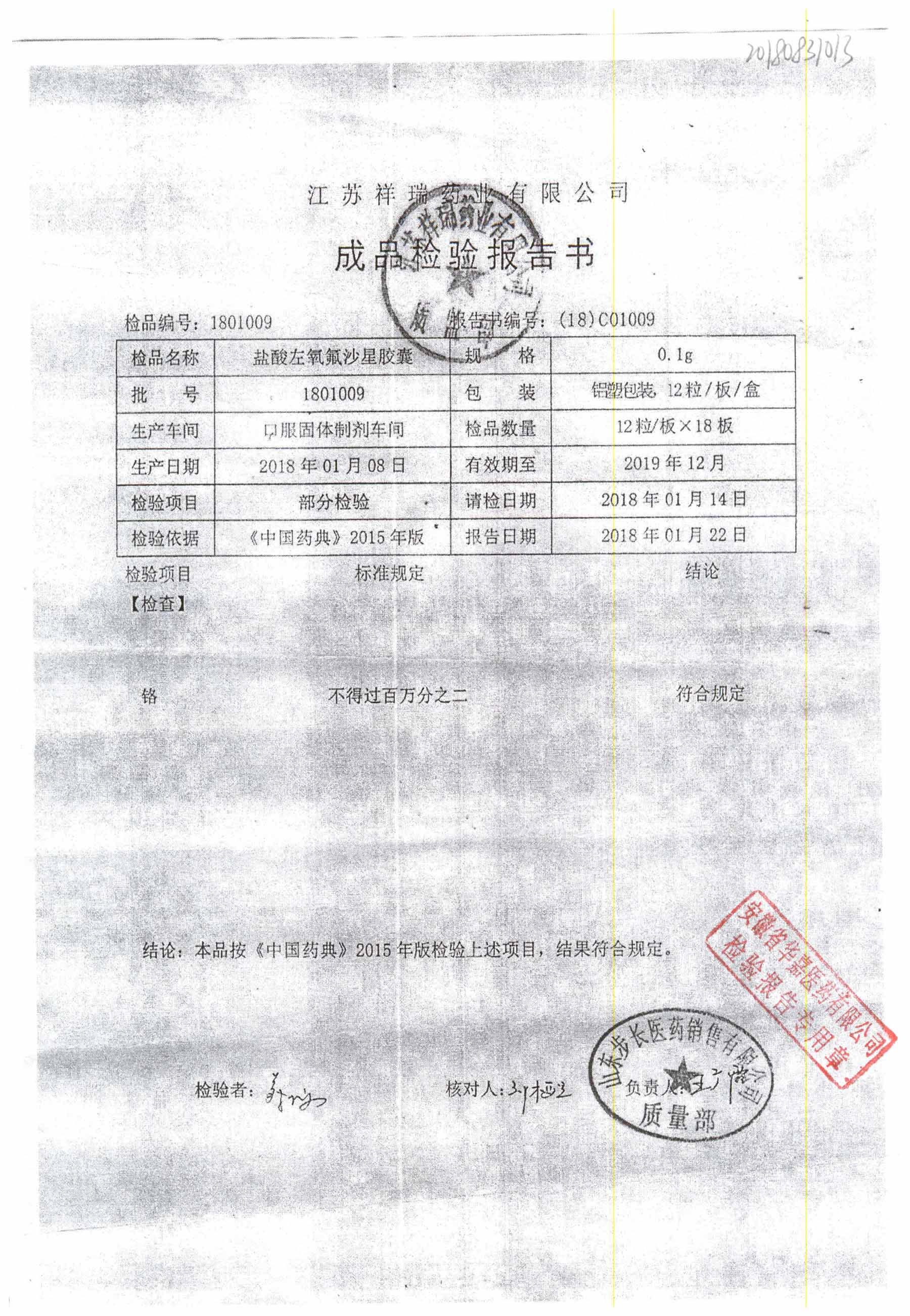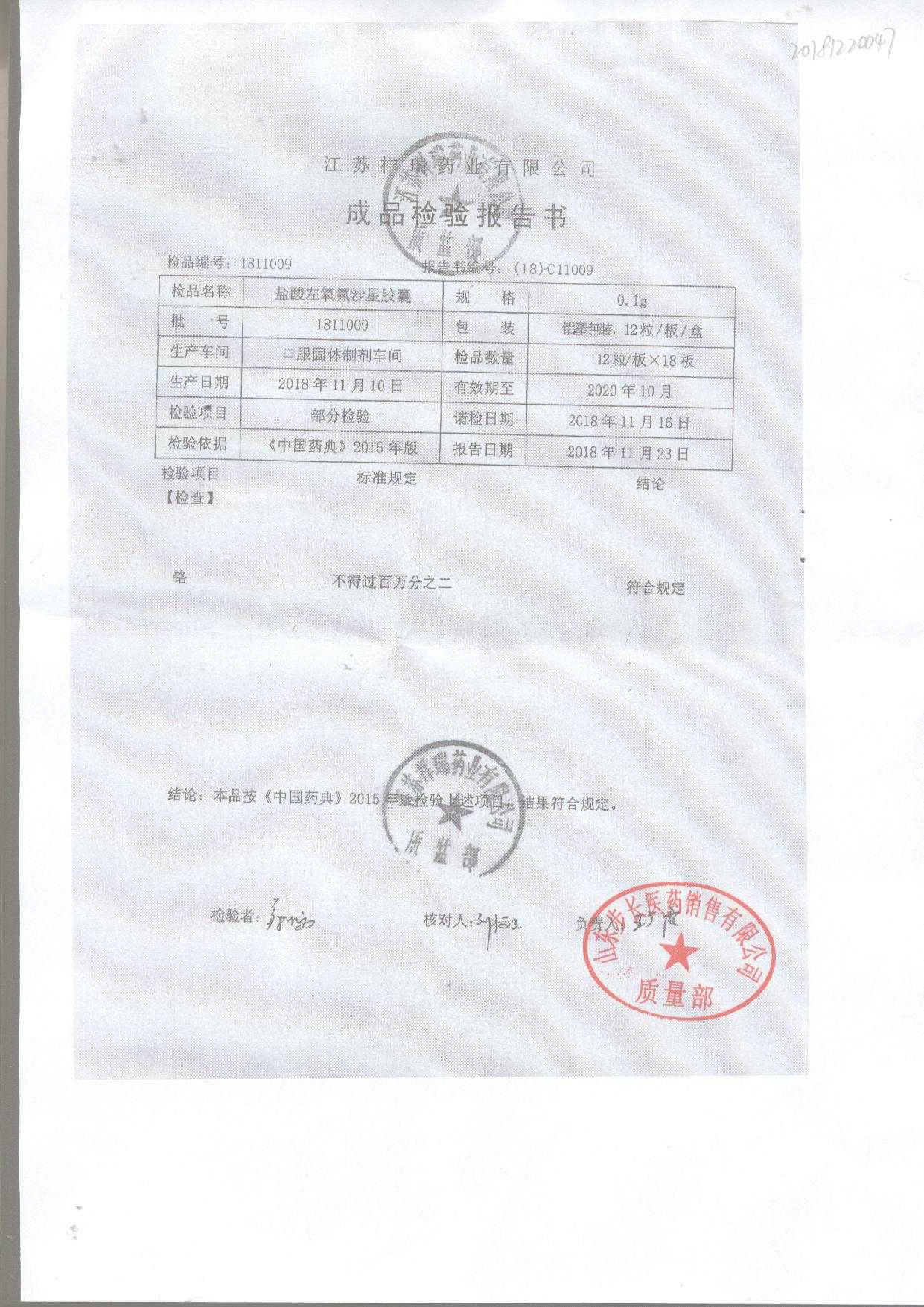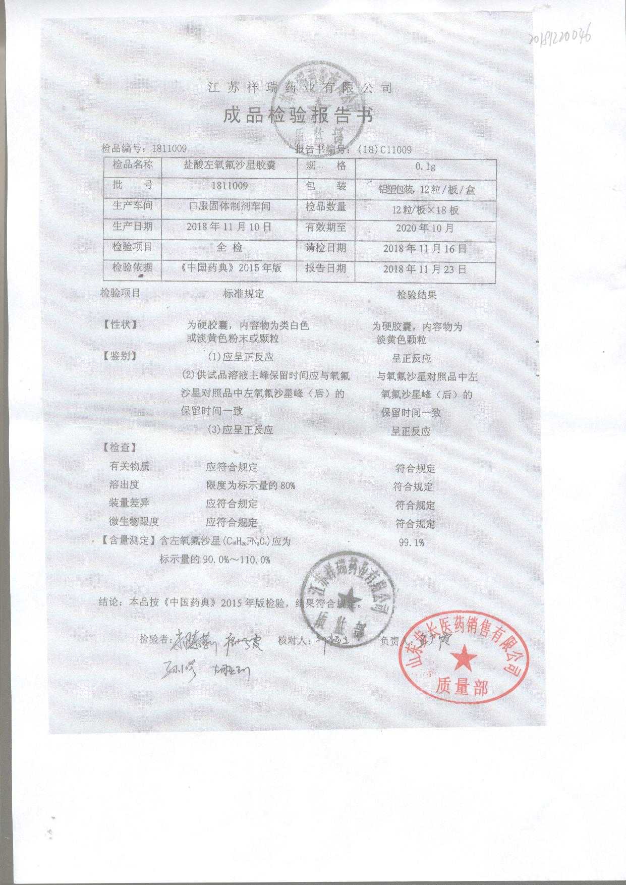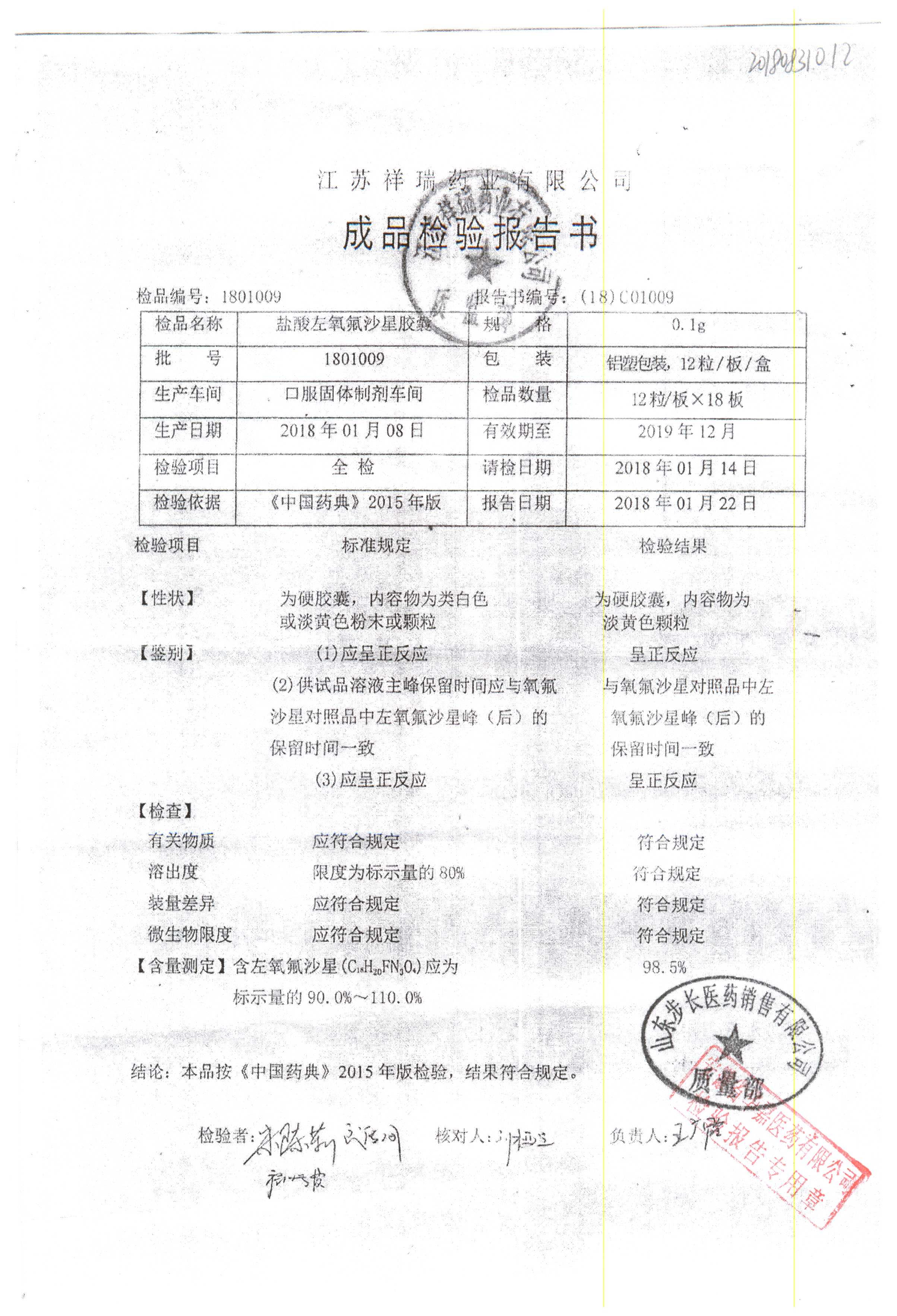 盐酸左氧氟沙星胶囊 | 0.1g*12粒 | 1811009(1/2) | 查看详情 |