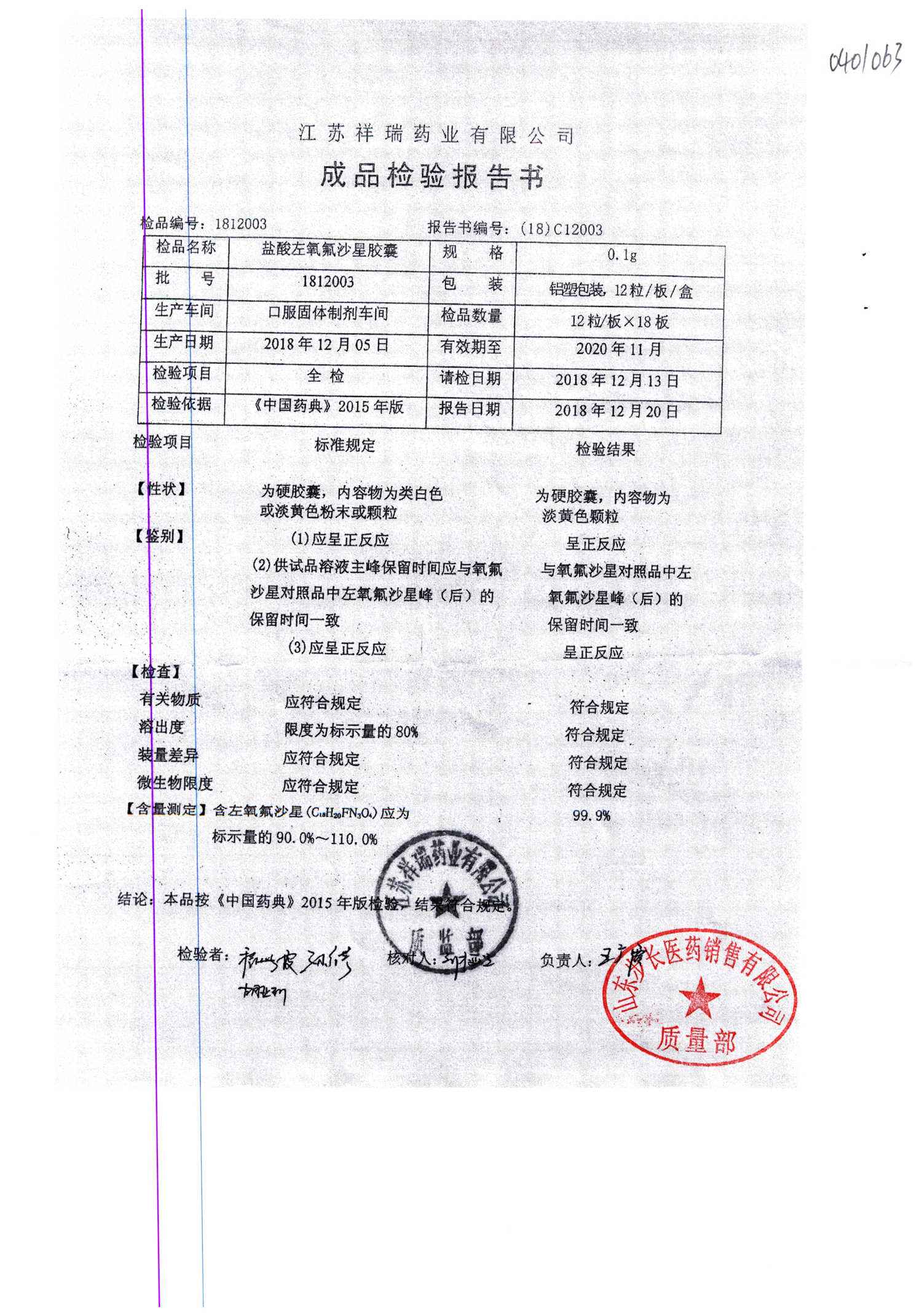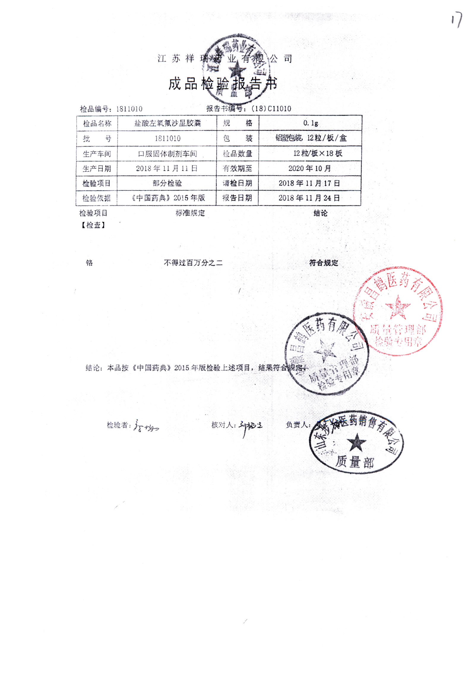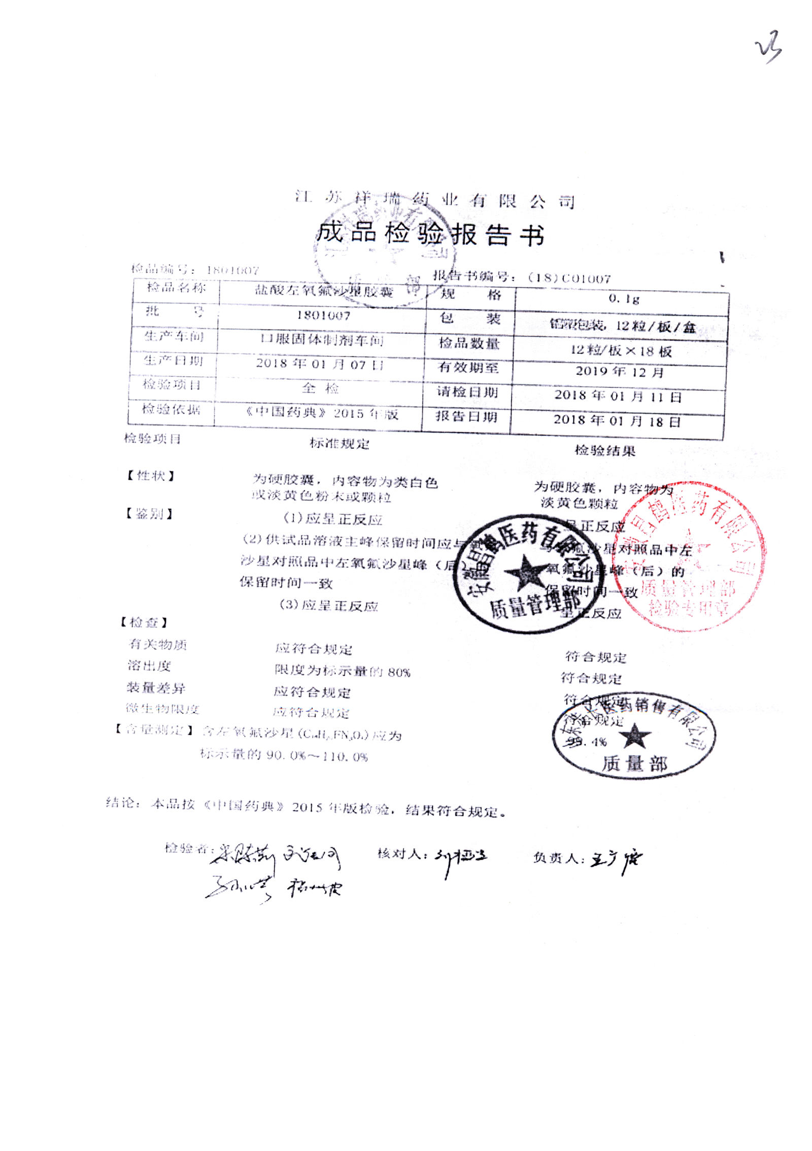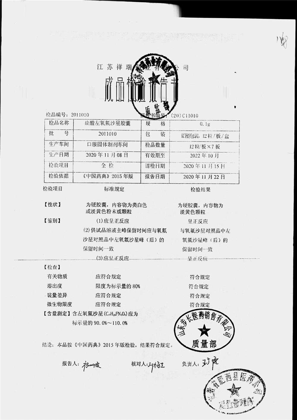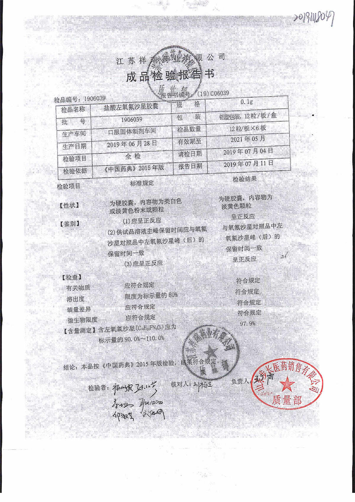 盐酸左氧氟沙星胶囊 | 0.1g*12粒 | 1811009(1/2) | 查看详情 |