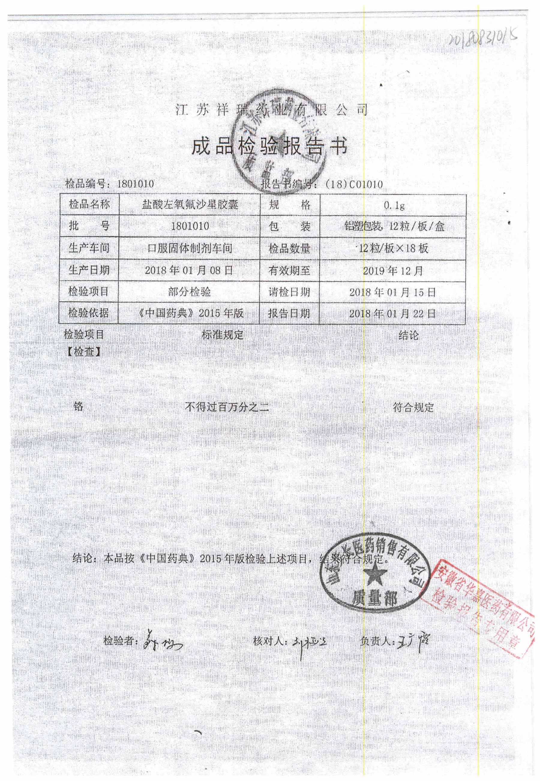 盐酸左氧氟沙星胶囊 | 0.1g*12粒 | 1811010(1/2) | 查看详情 |