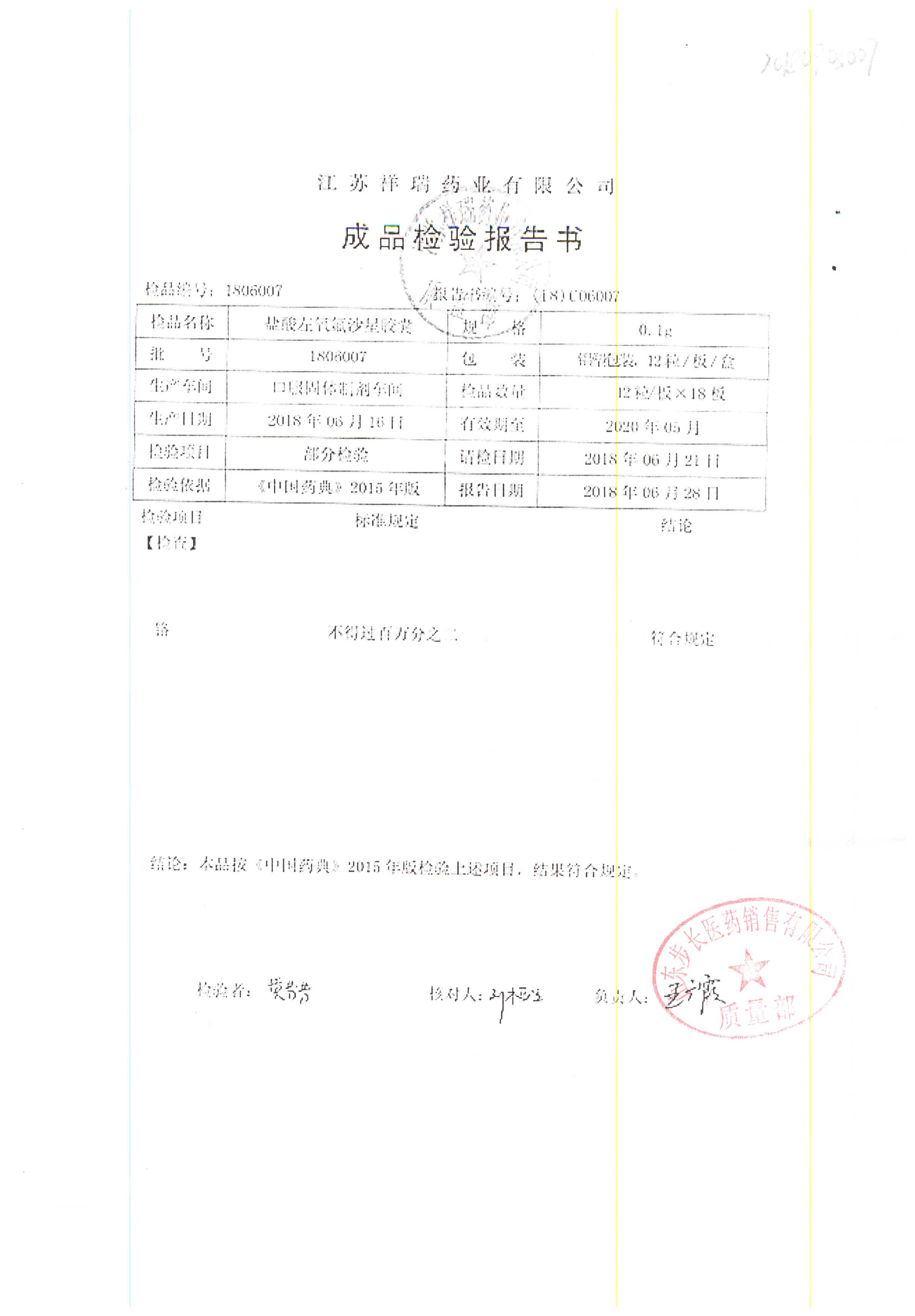 盐酸左氧氟沙星胶囊 | 0.1g*12粒 | 1806007(1/2) | 查看详情 |