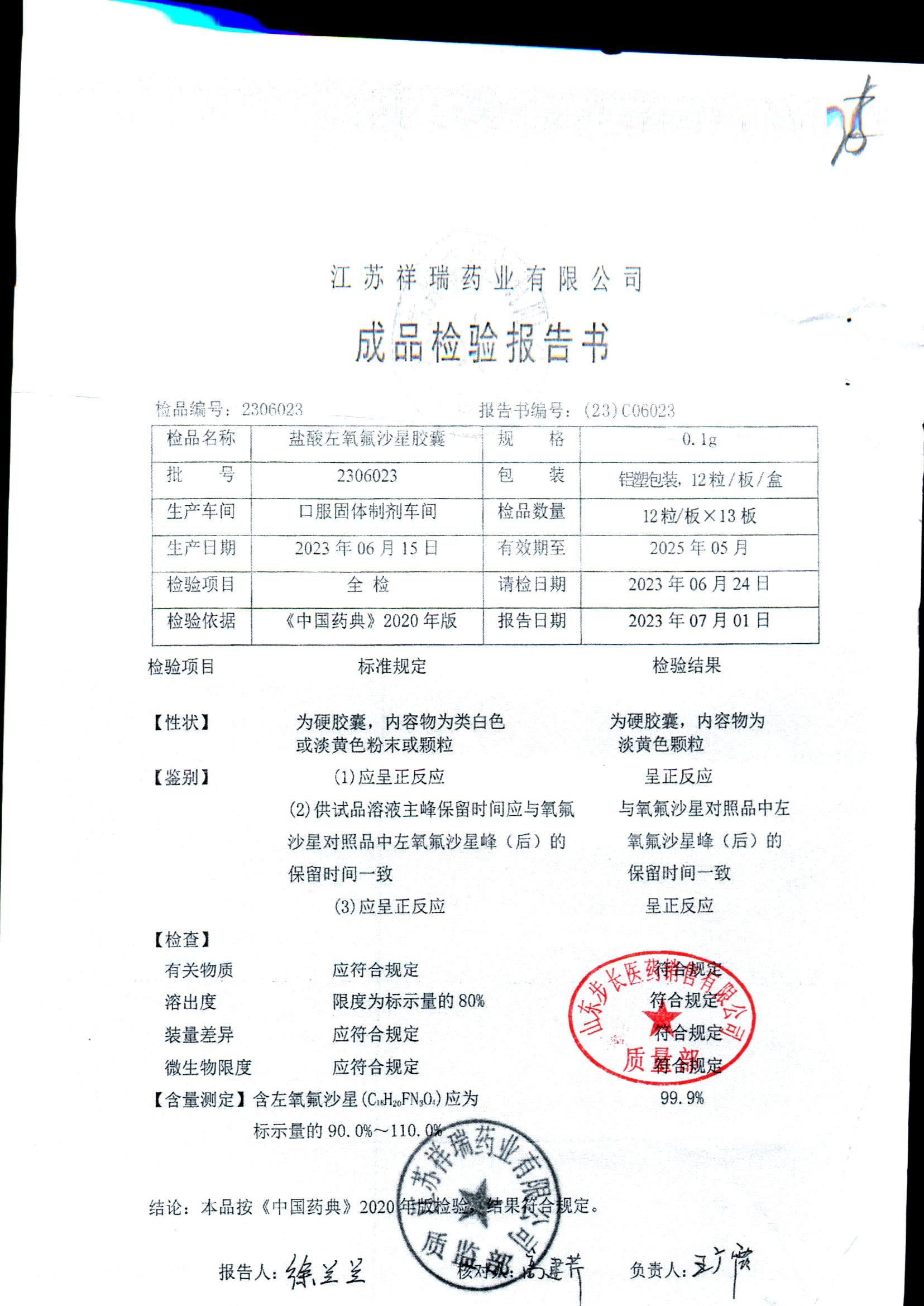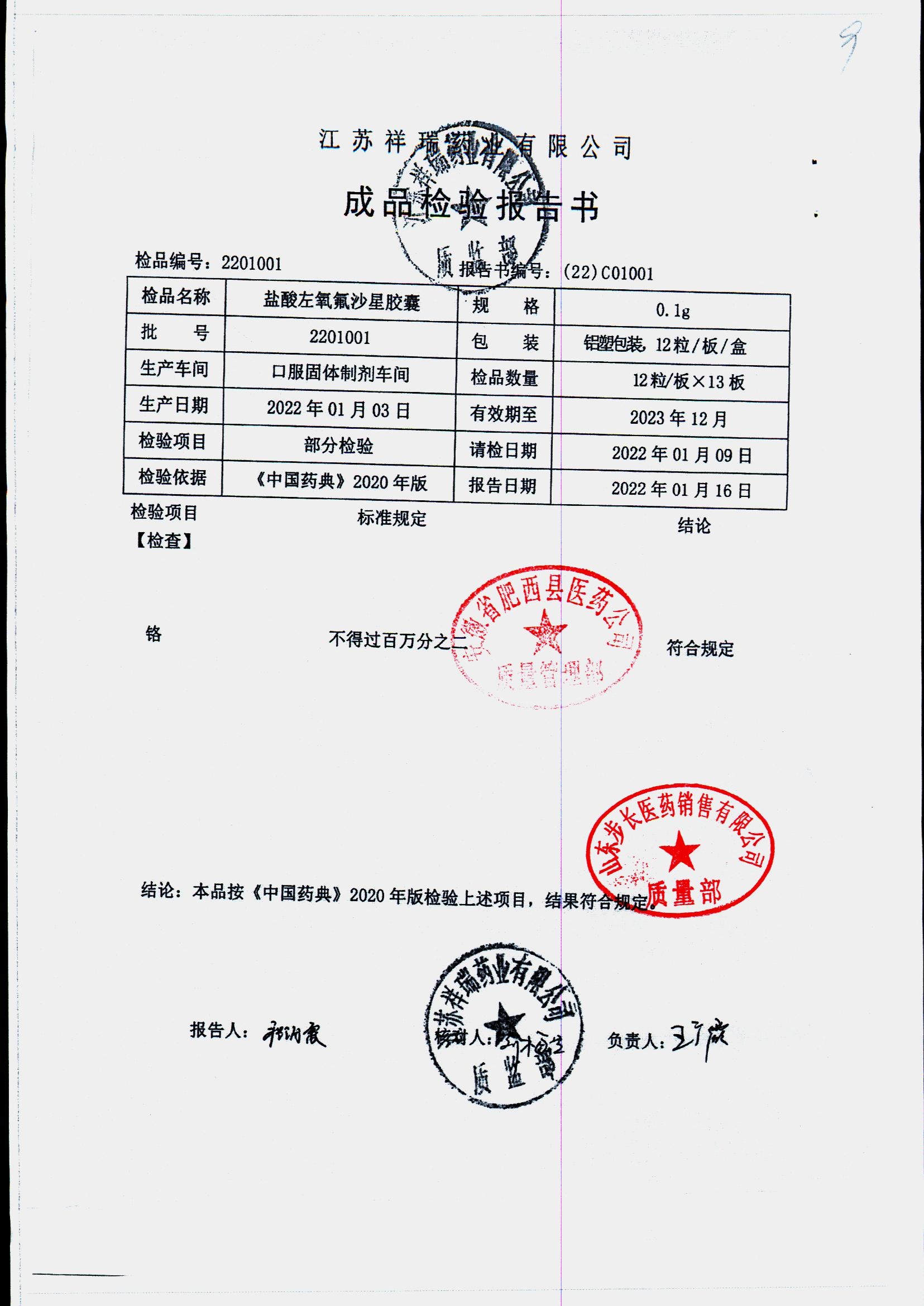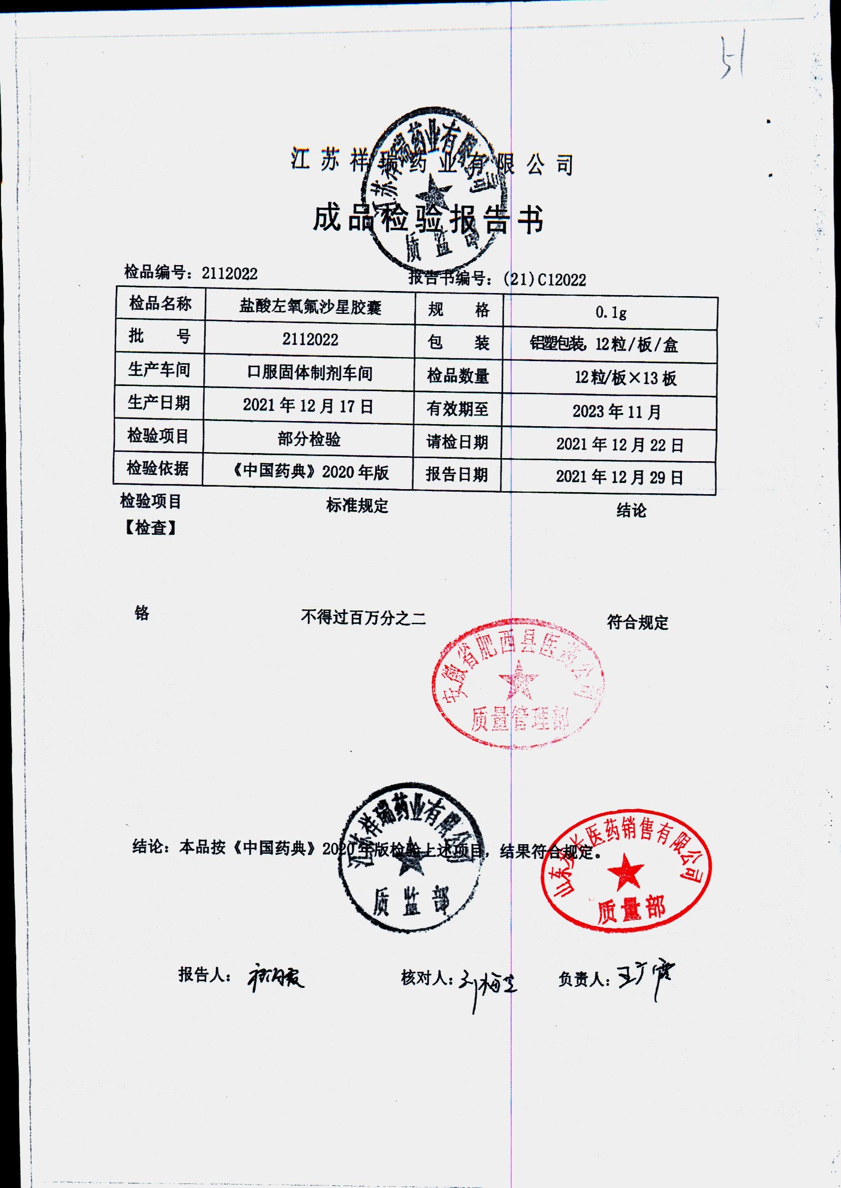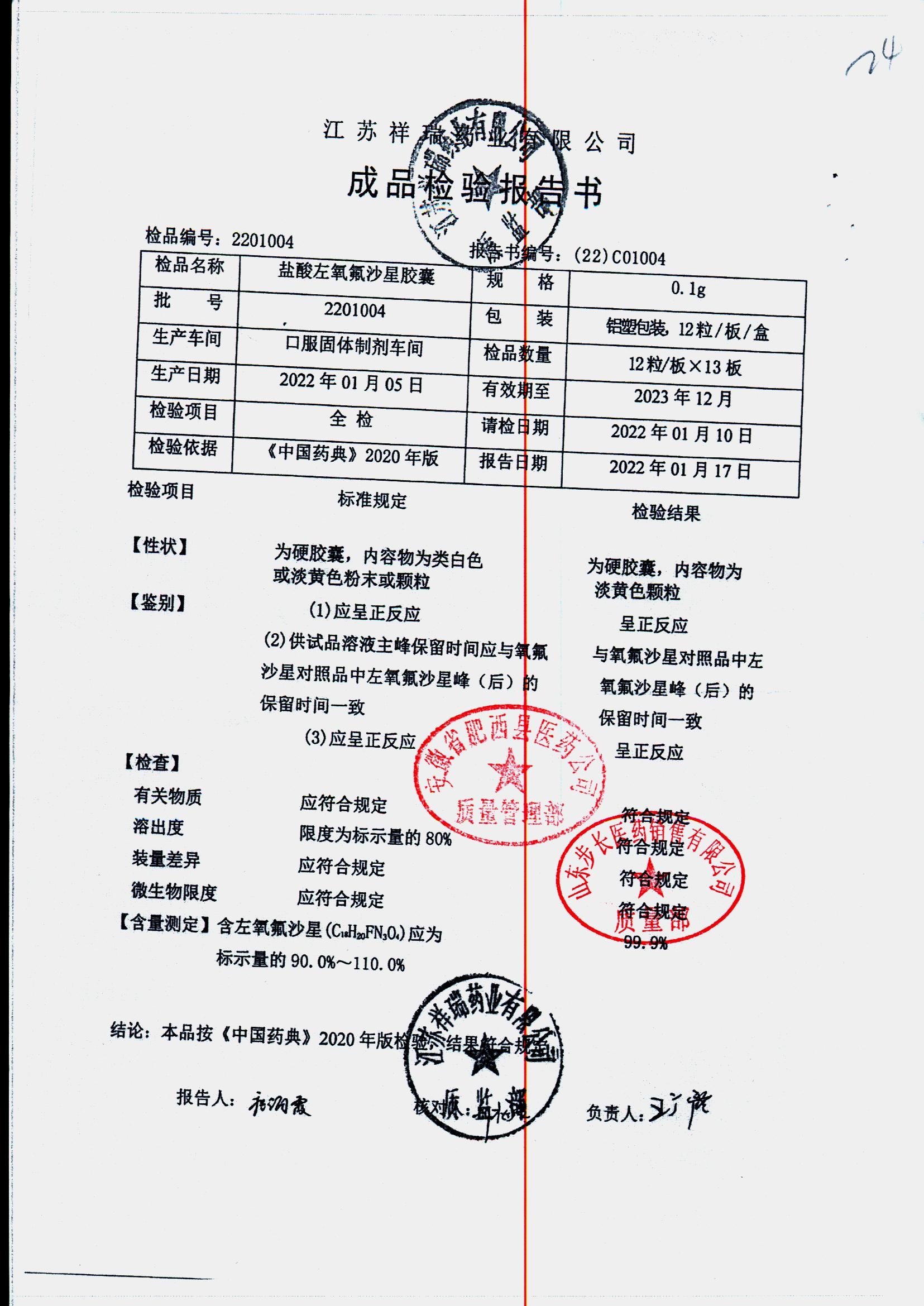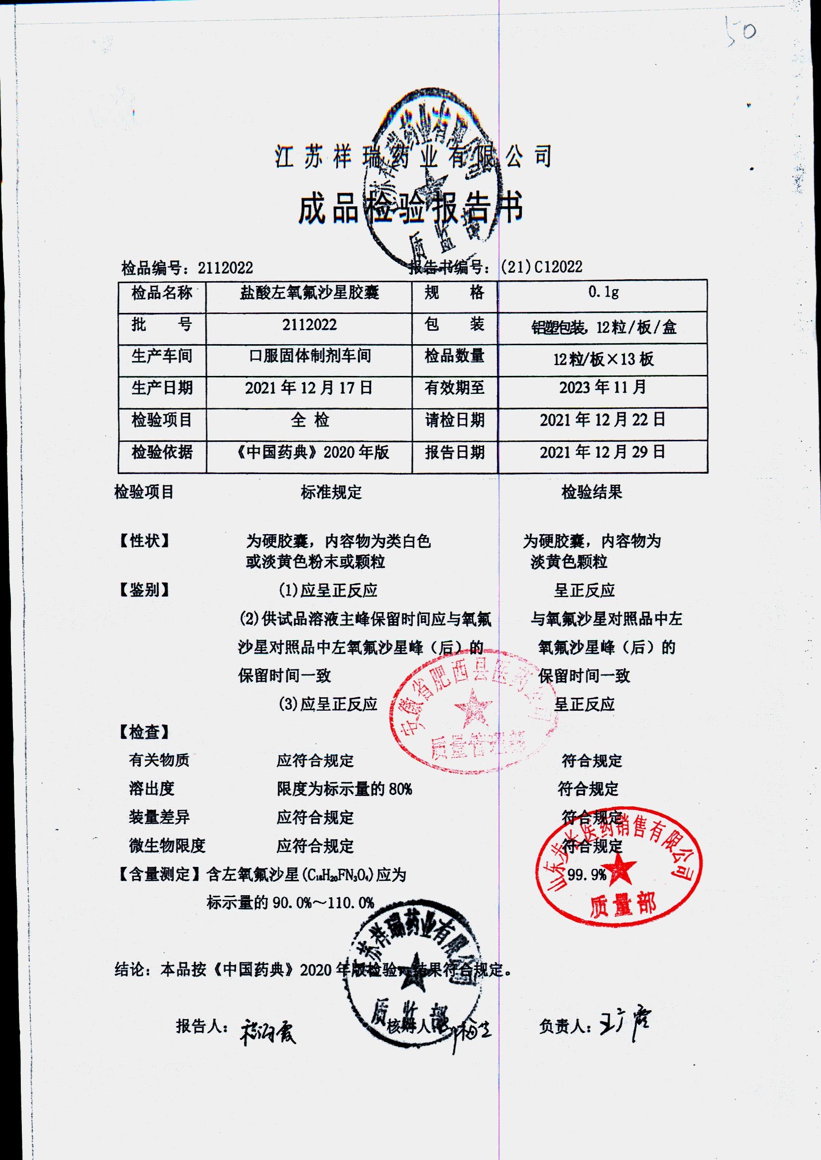 盐酸左氧氟沙星胶囊 | 0.1g*12粒 | 2009012(2/2) | 查看详情 |