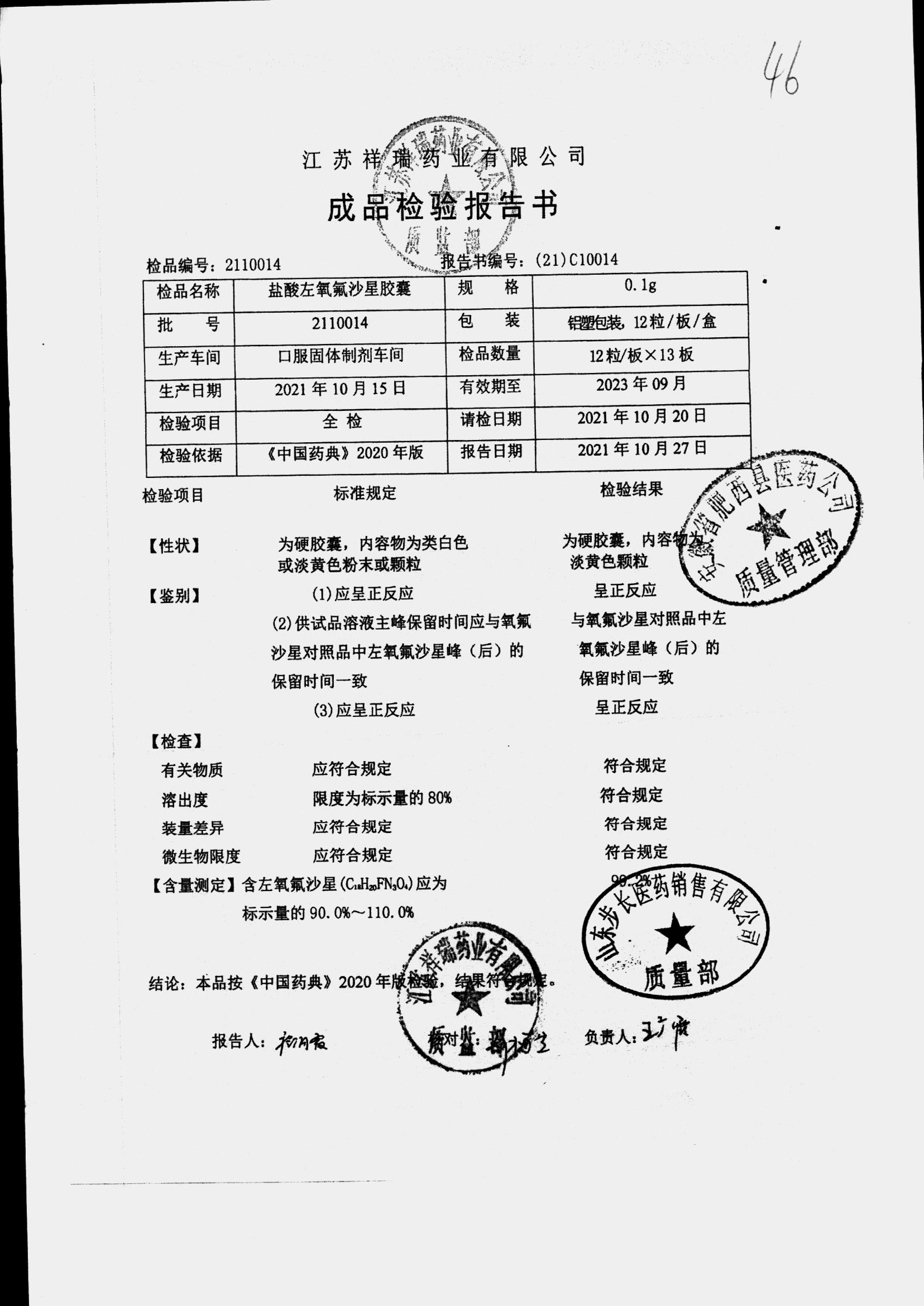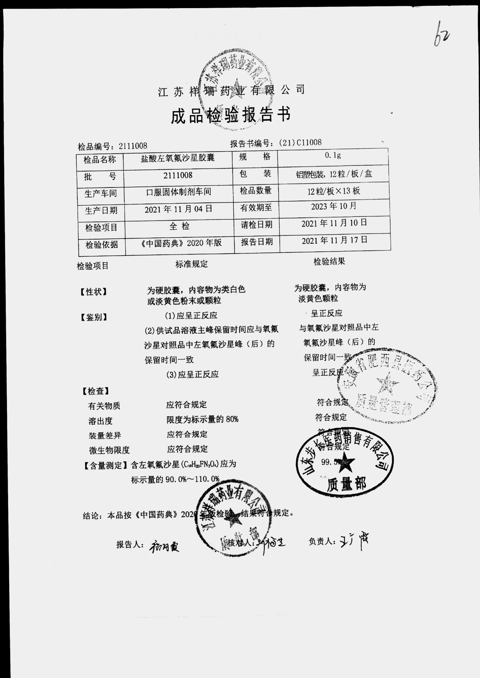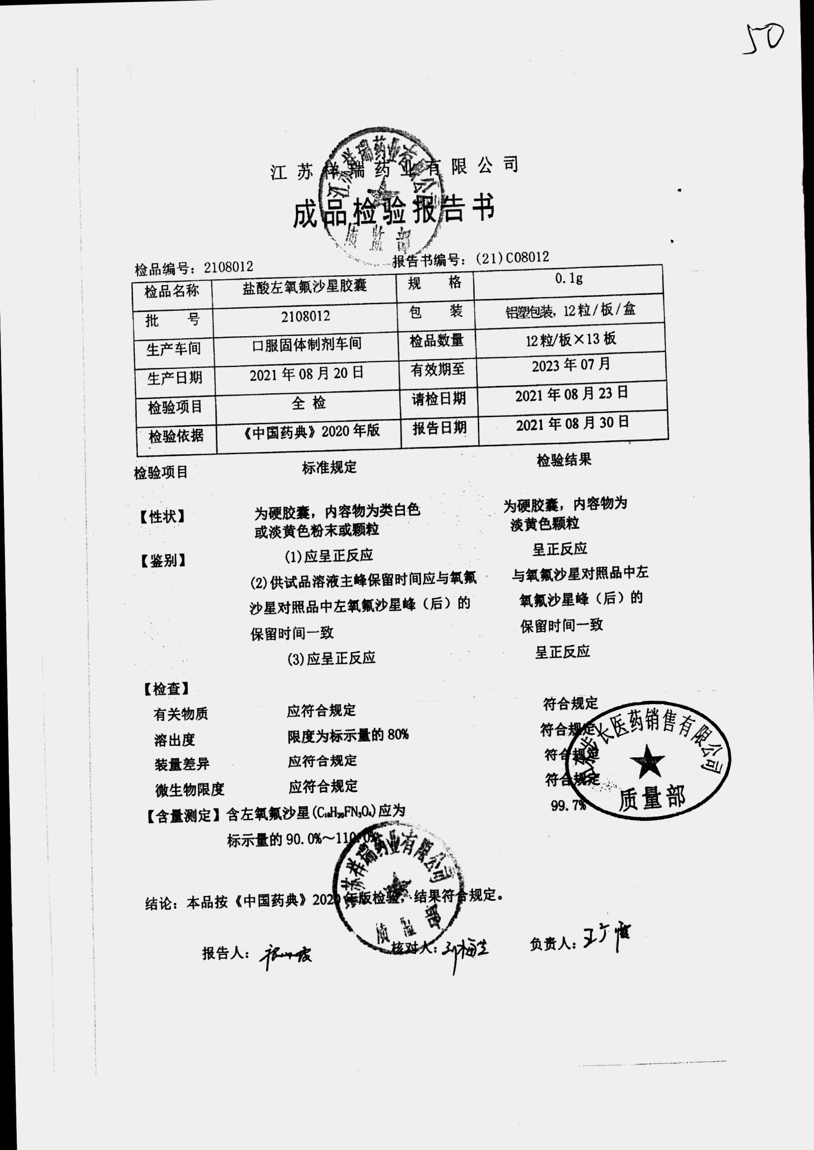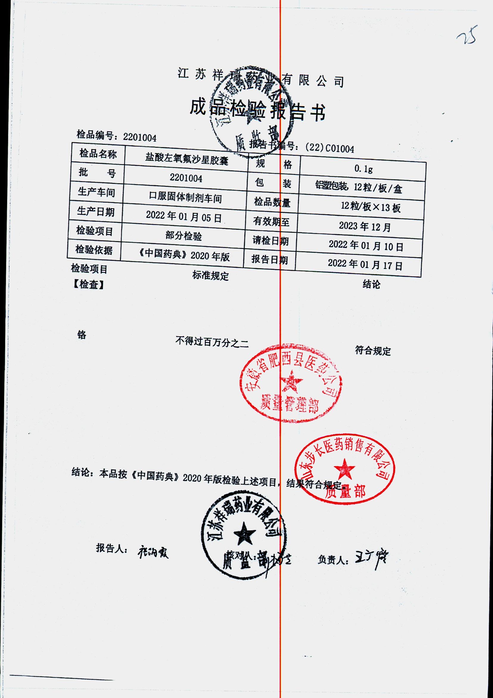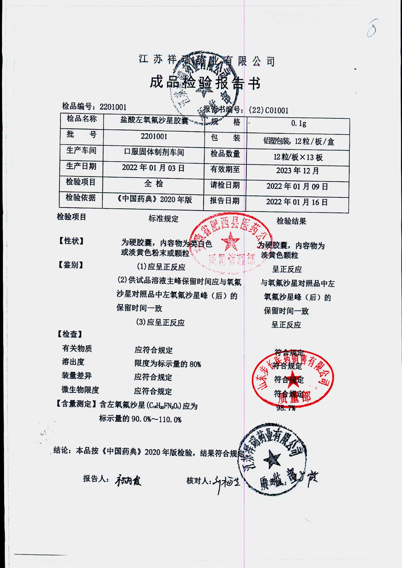 盐酸左氧氟沙星胶囊 | 0.1g*12粒 | 2009012(2/2) | 查看详情 |