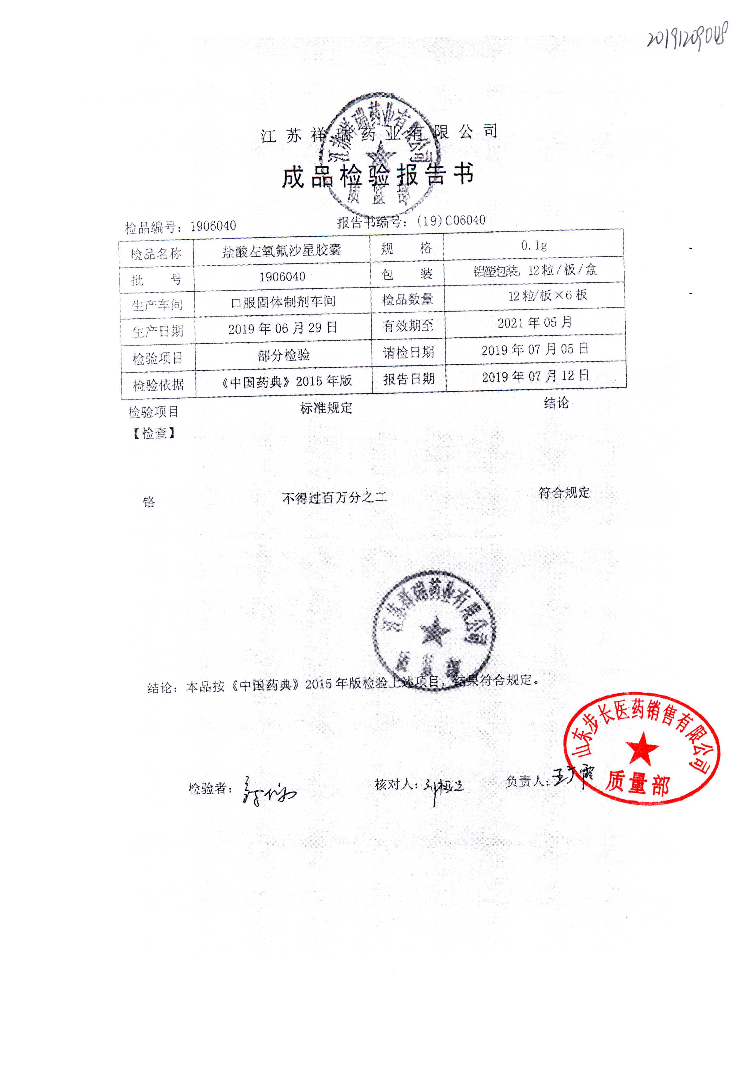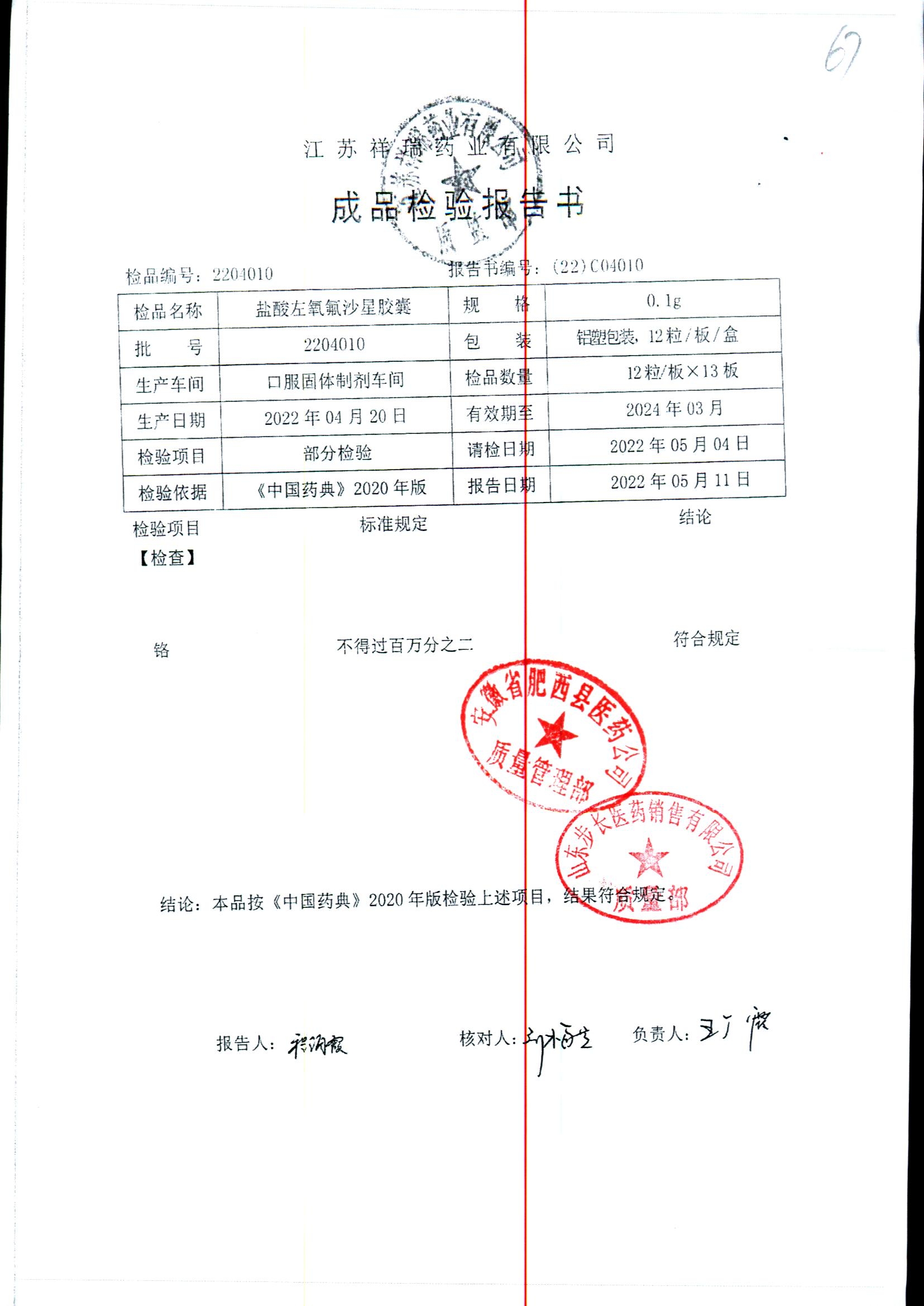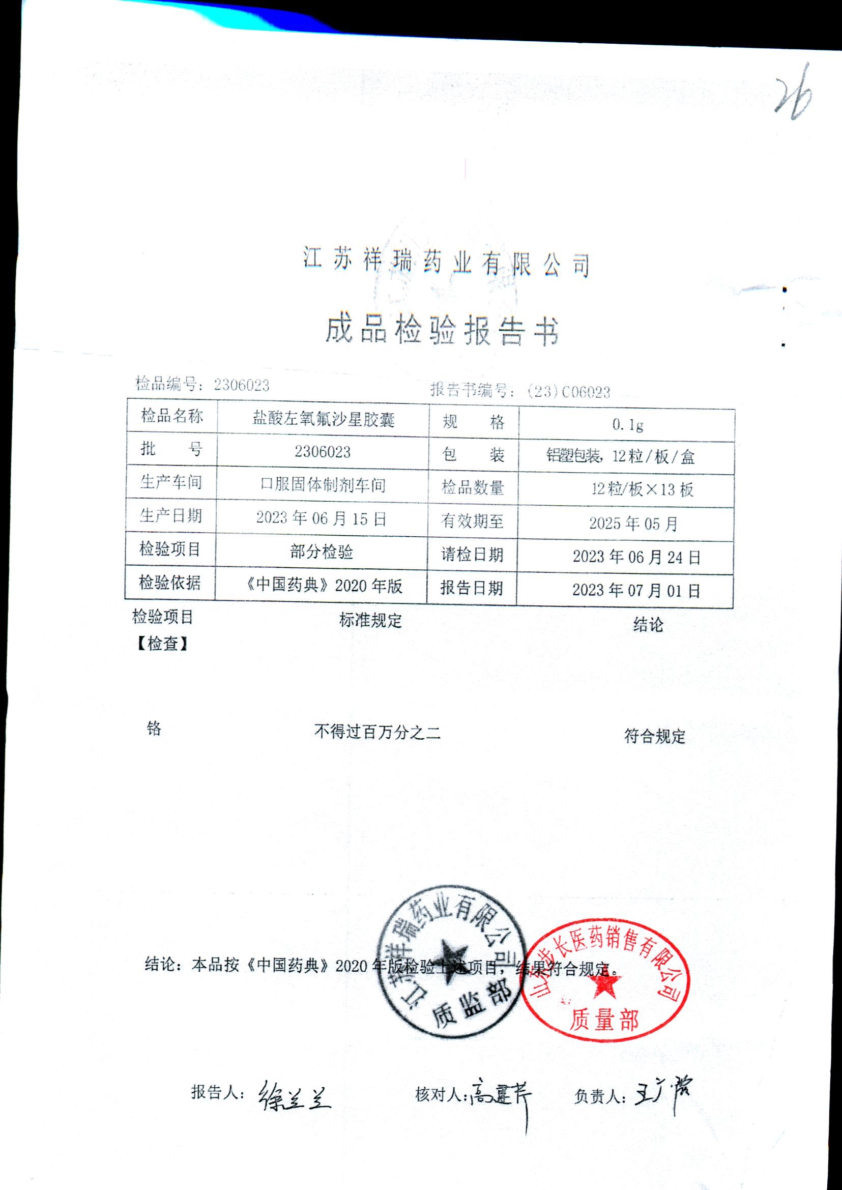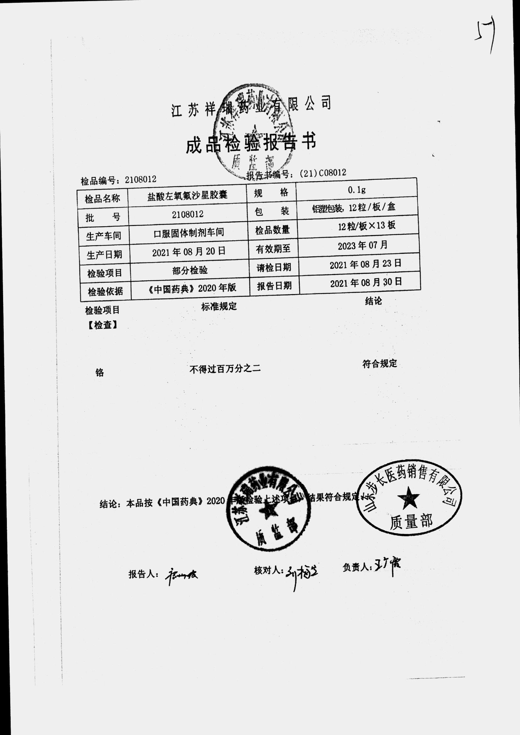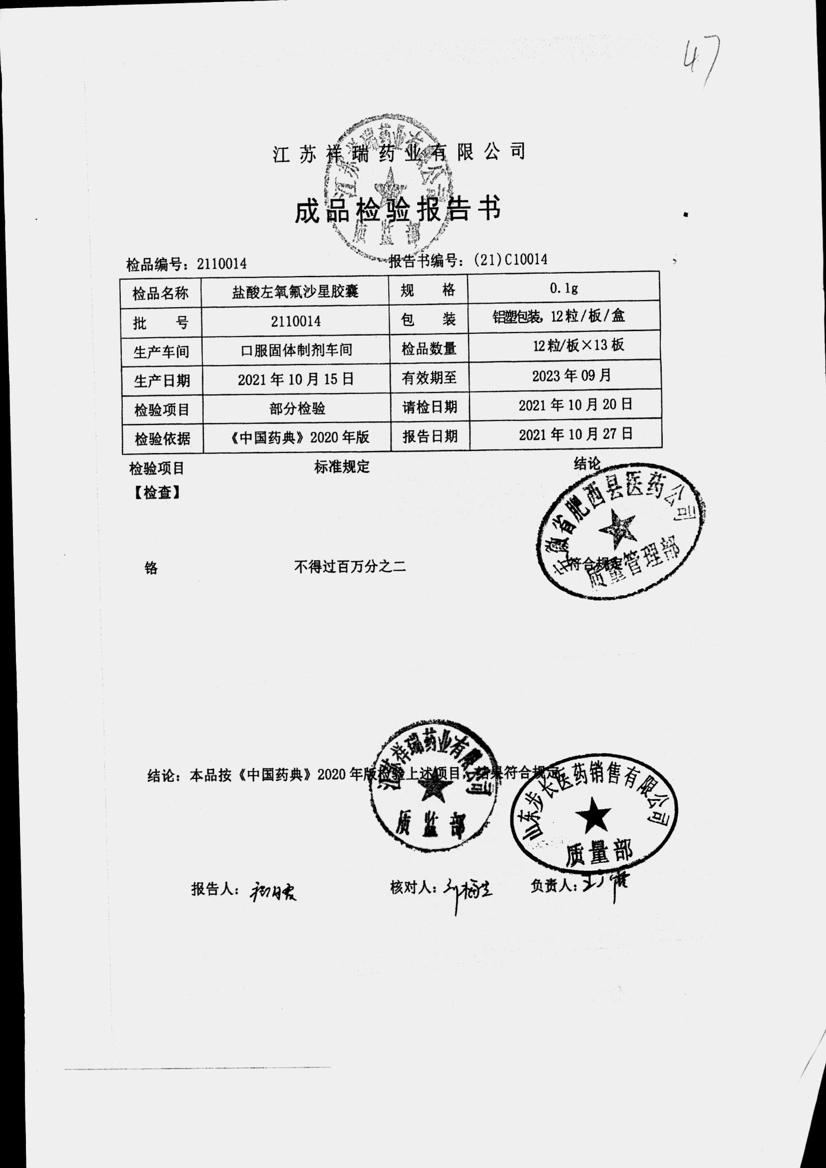 盐酸左氧氟沙星胶囊 | 0.1g*12粒 | 2009012(2/2) | 查看详情 |