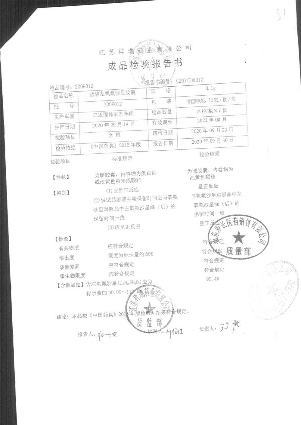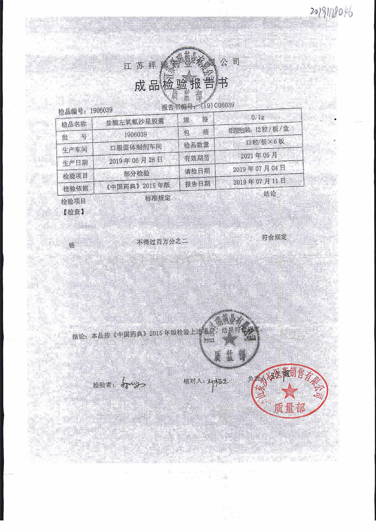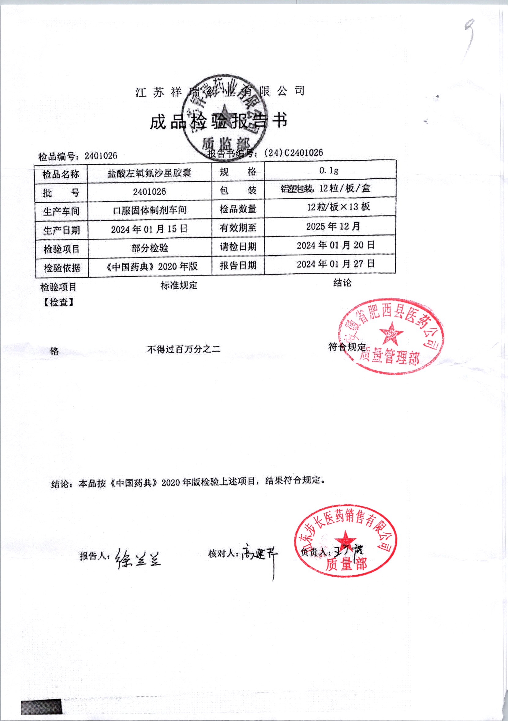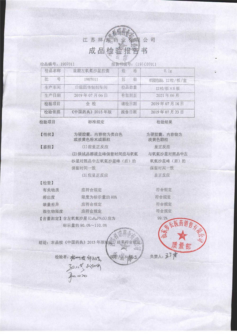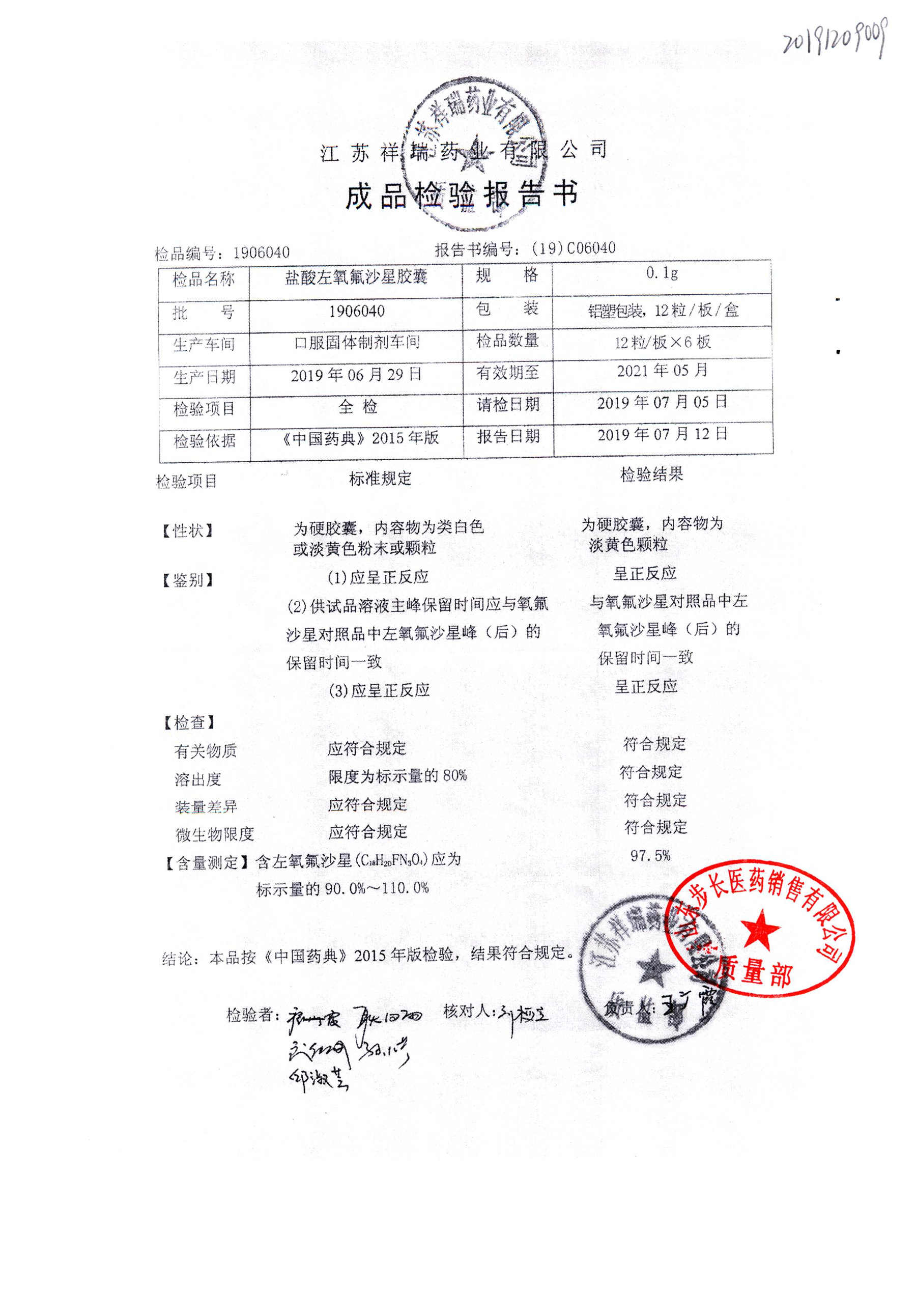 盐酸左氧氟沙星胶囊 | 0.1g*12粒 | 2009012(2/2) | 查看详情 |