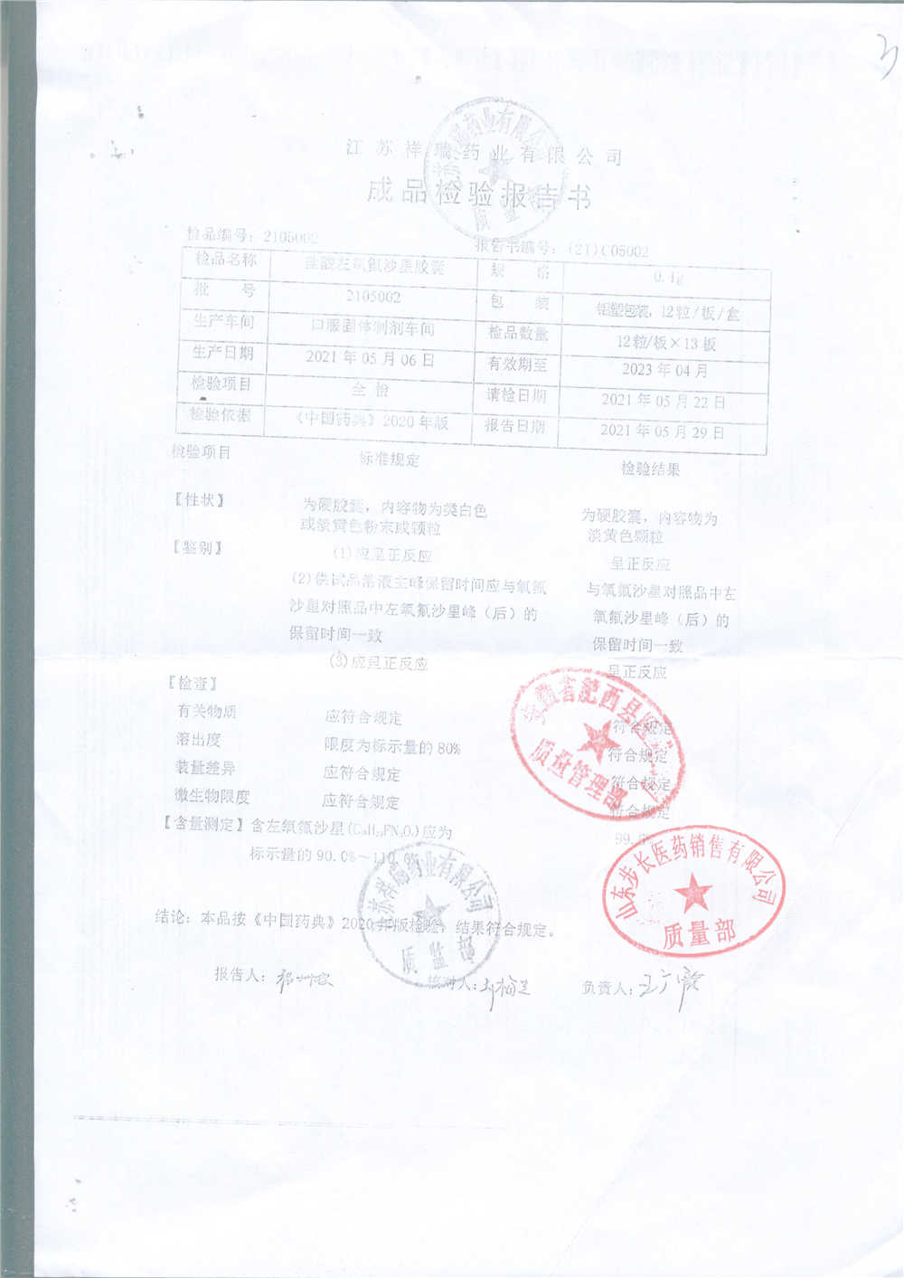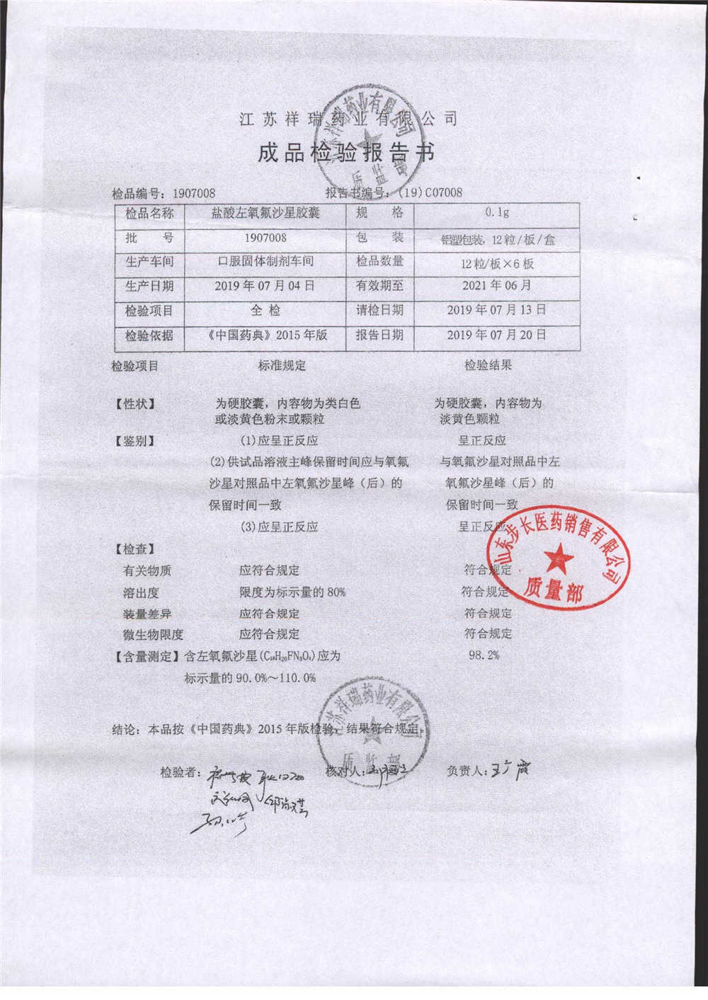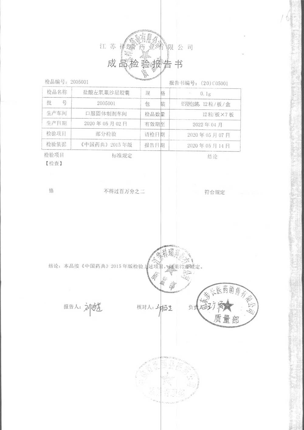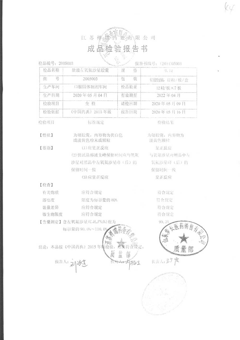盐酸左氧氟沙星胶囊 | 0.1g*12粒 | 2009012(2/2) | 查看详情 |