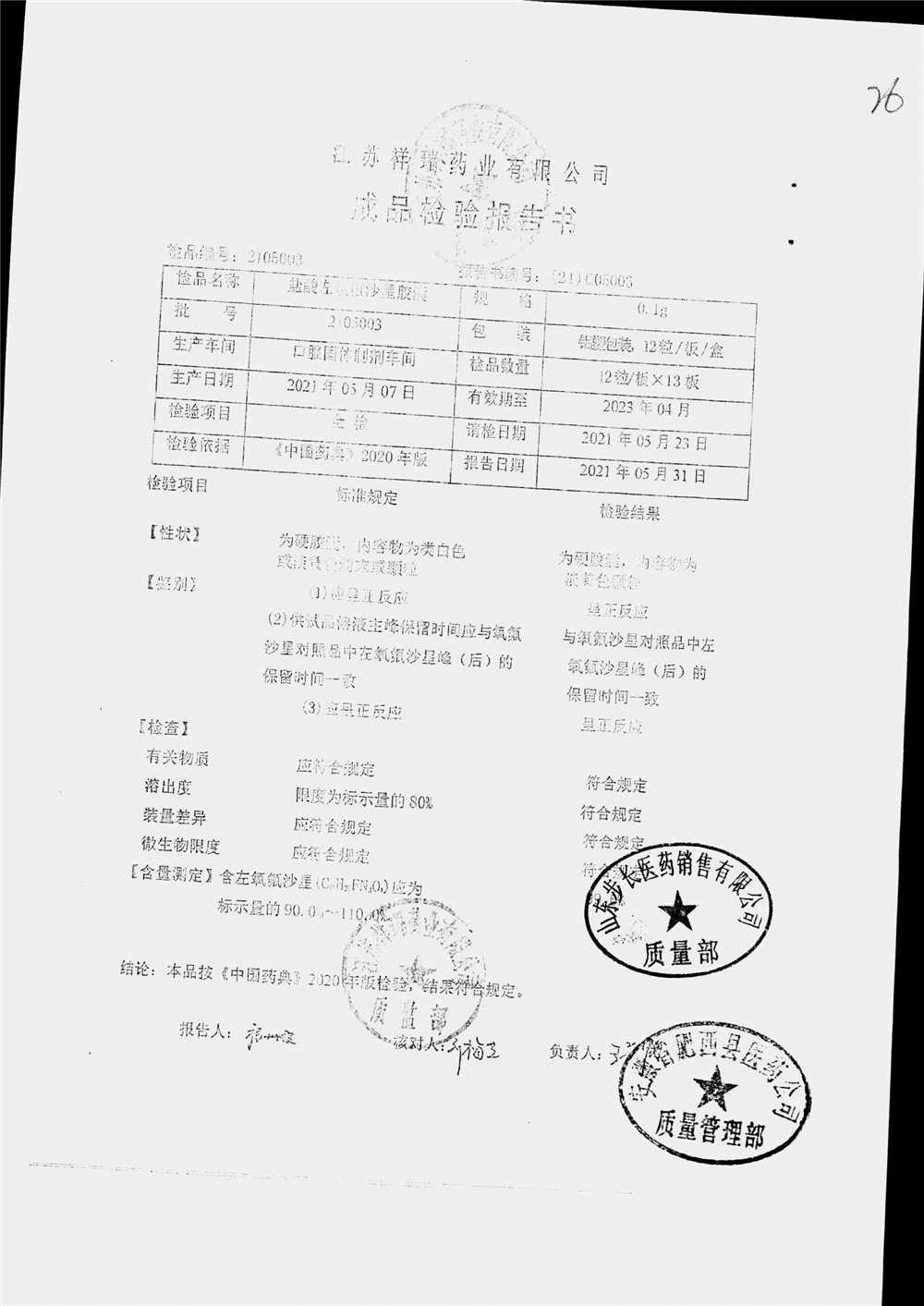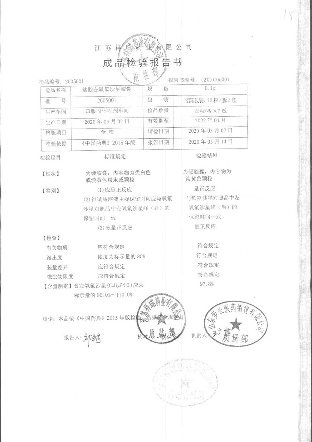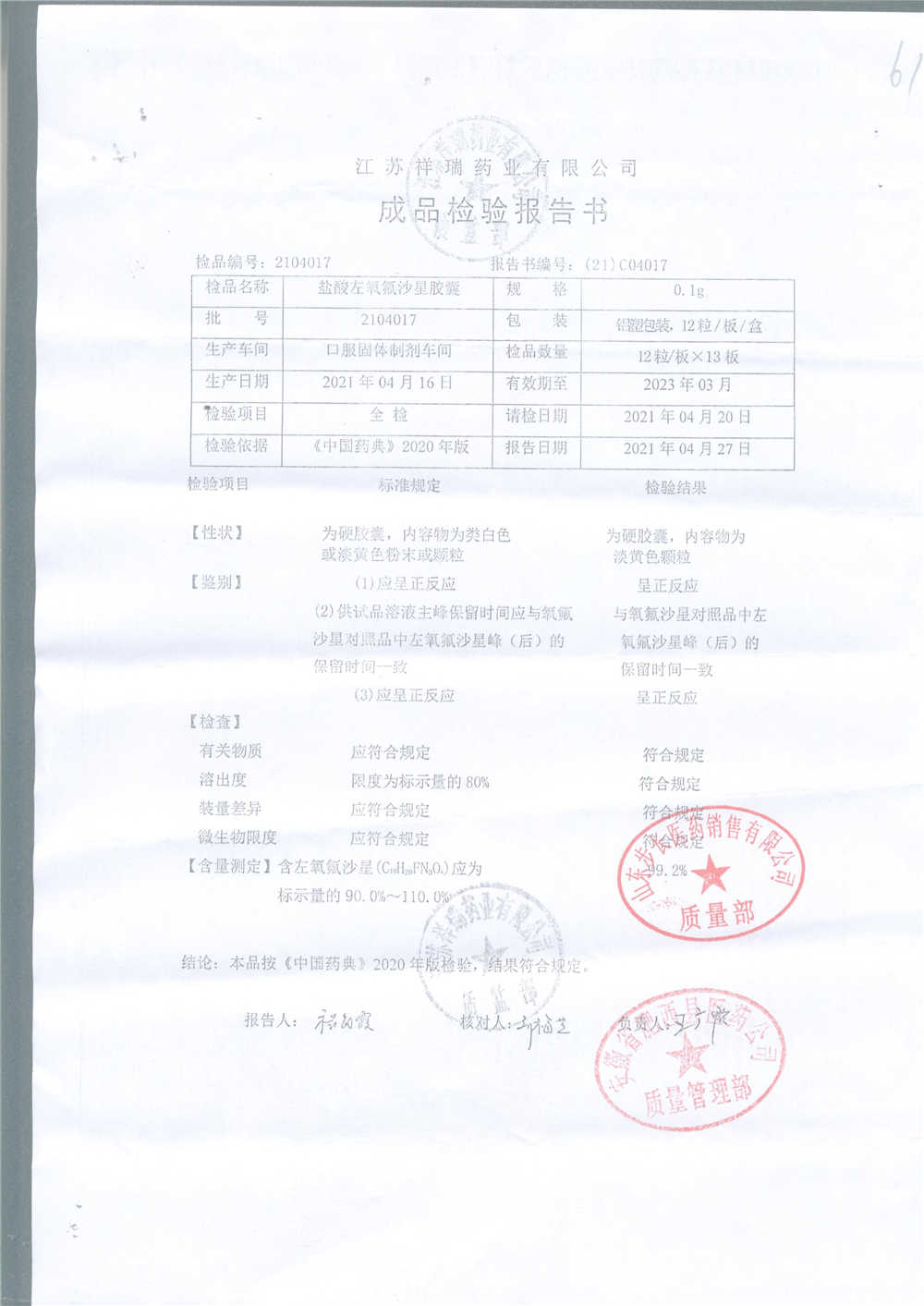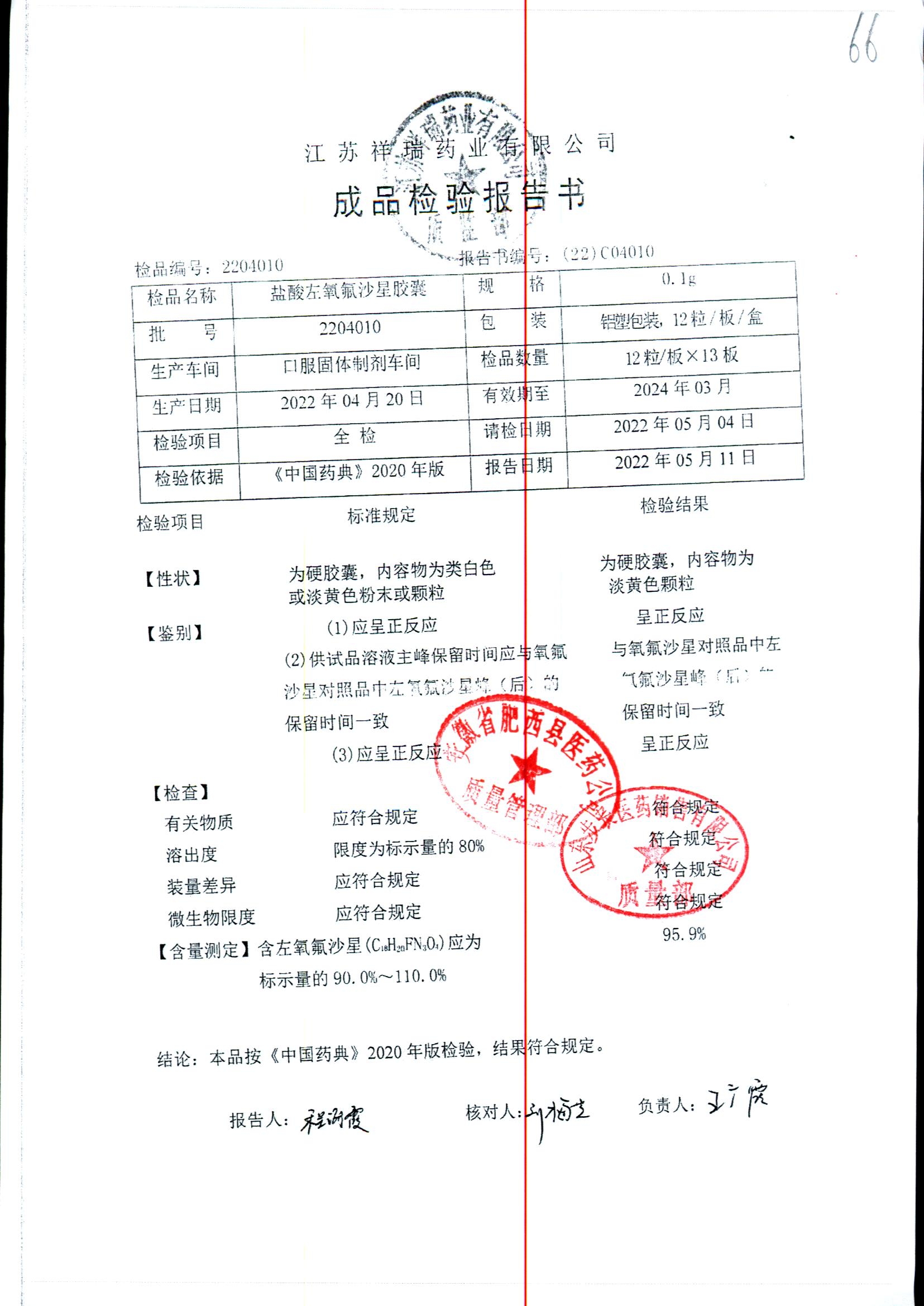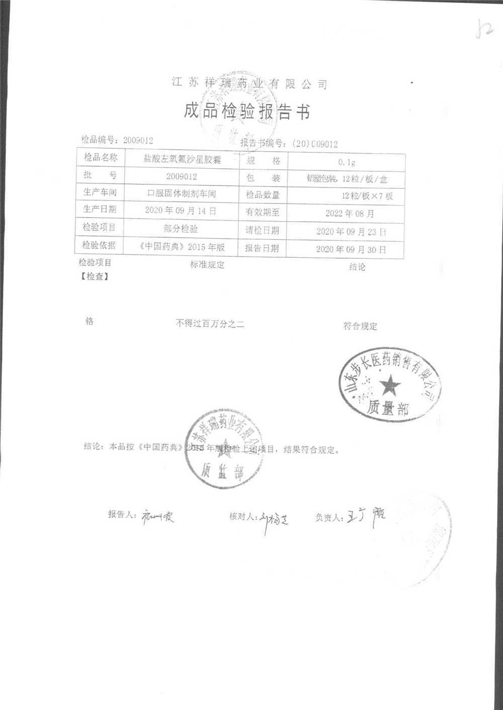 盐酸左氧氟沙星胶囊 | 0.1g*12粒 | 2009012(2/2) | 查看详情 |