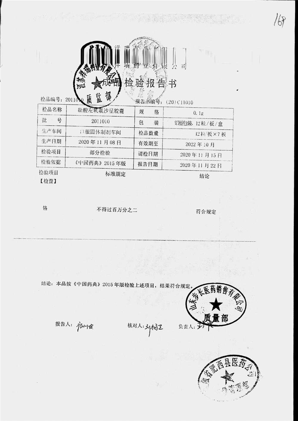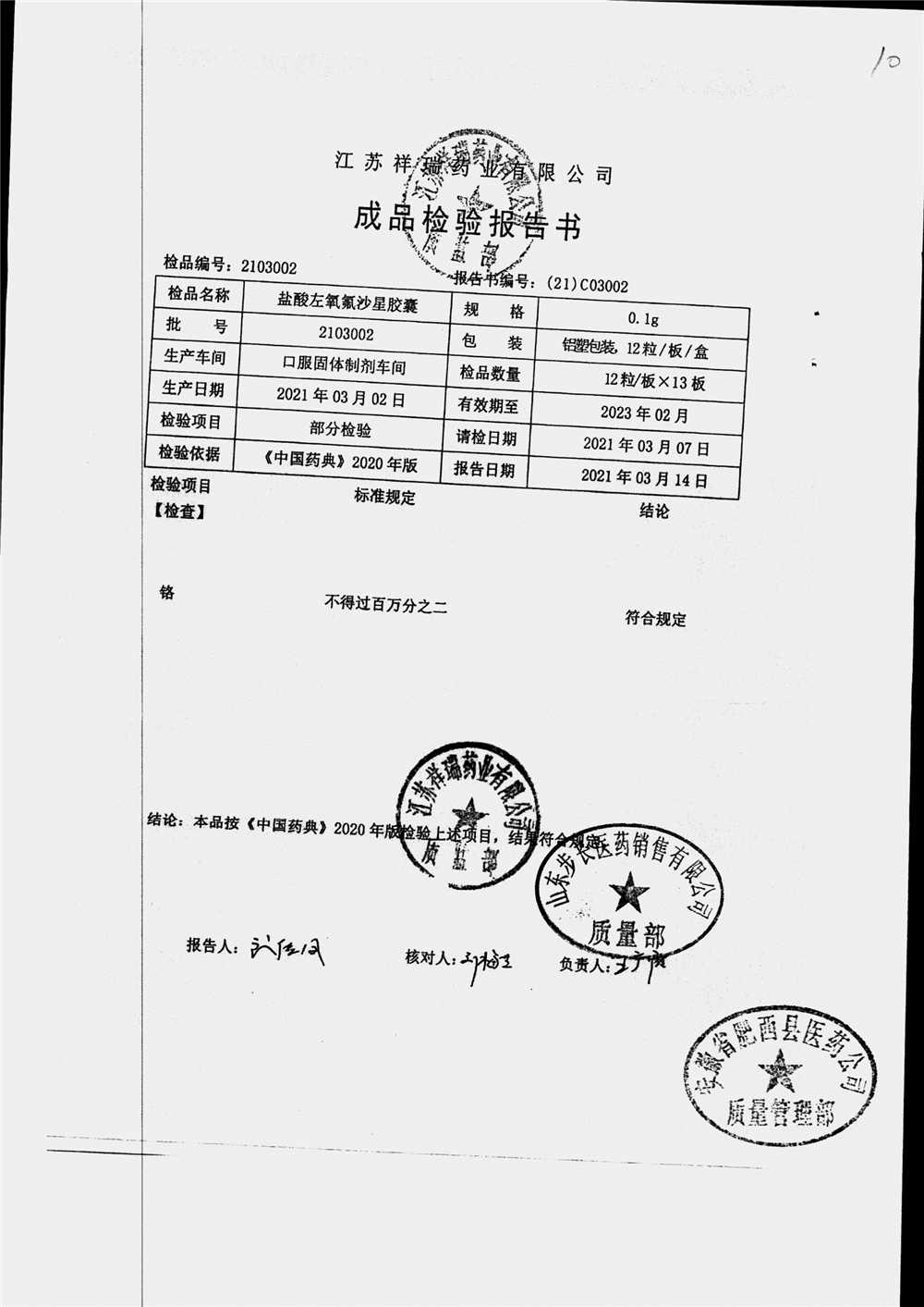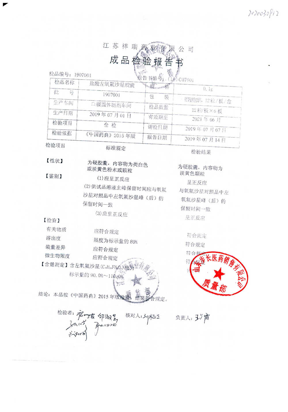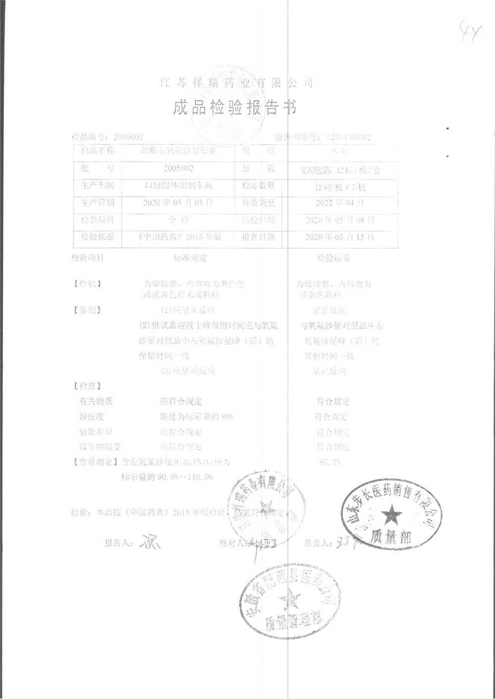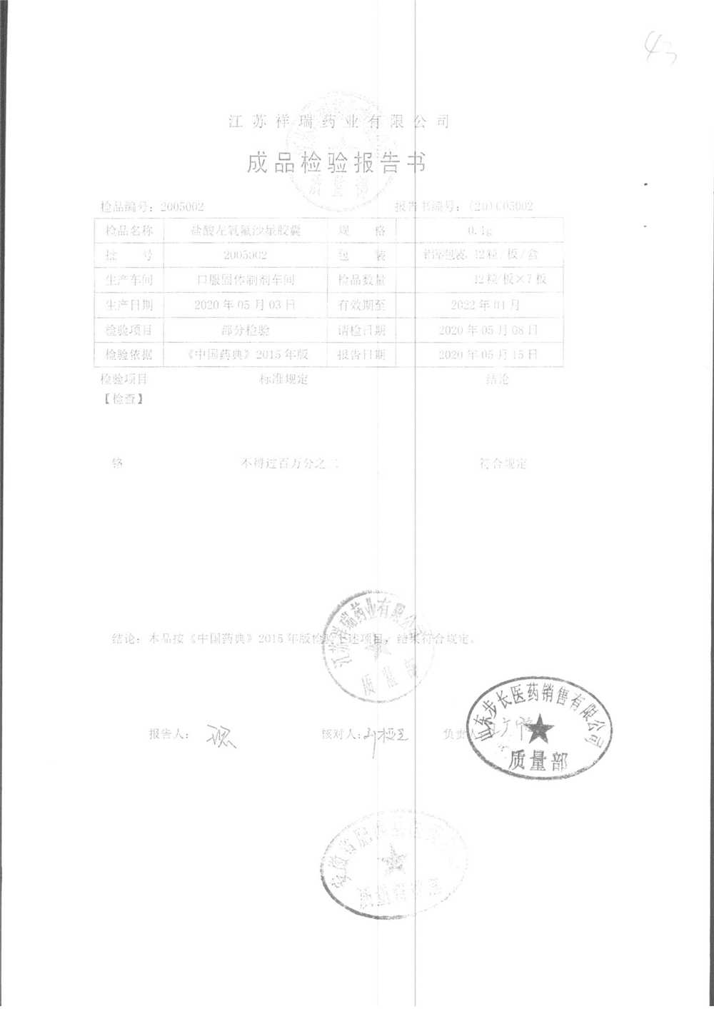 盐酸左氧氟沙星胶囊 | 0.1g*12粒 | 2009012(2/2) | 查看详情 |