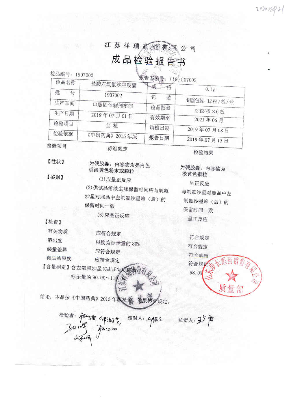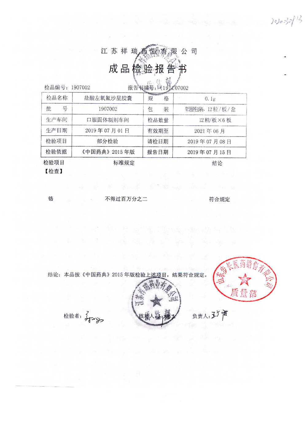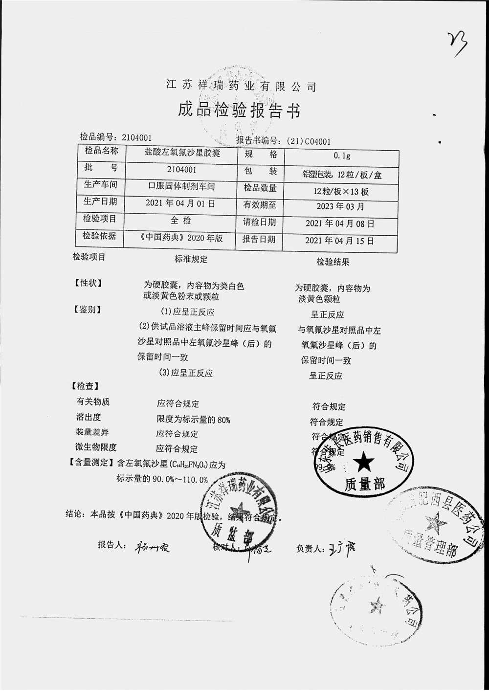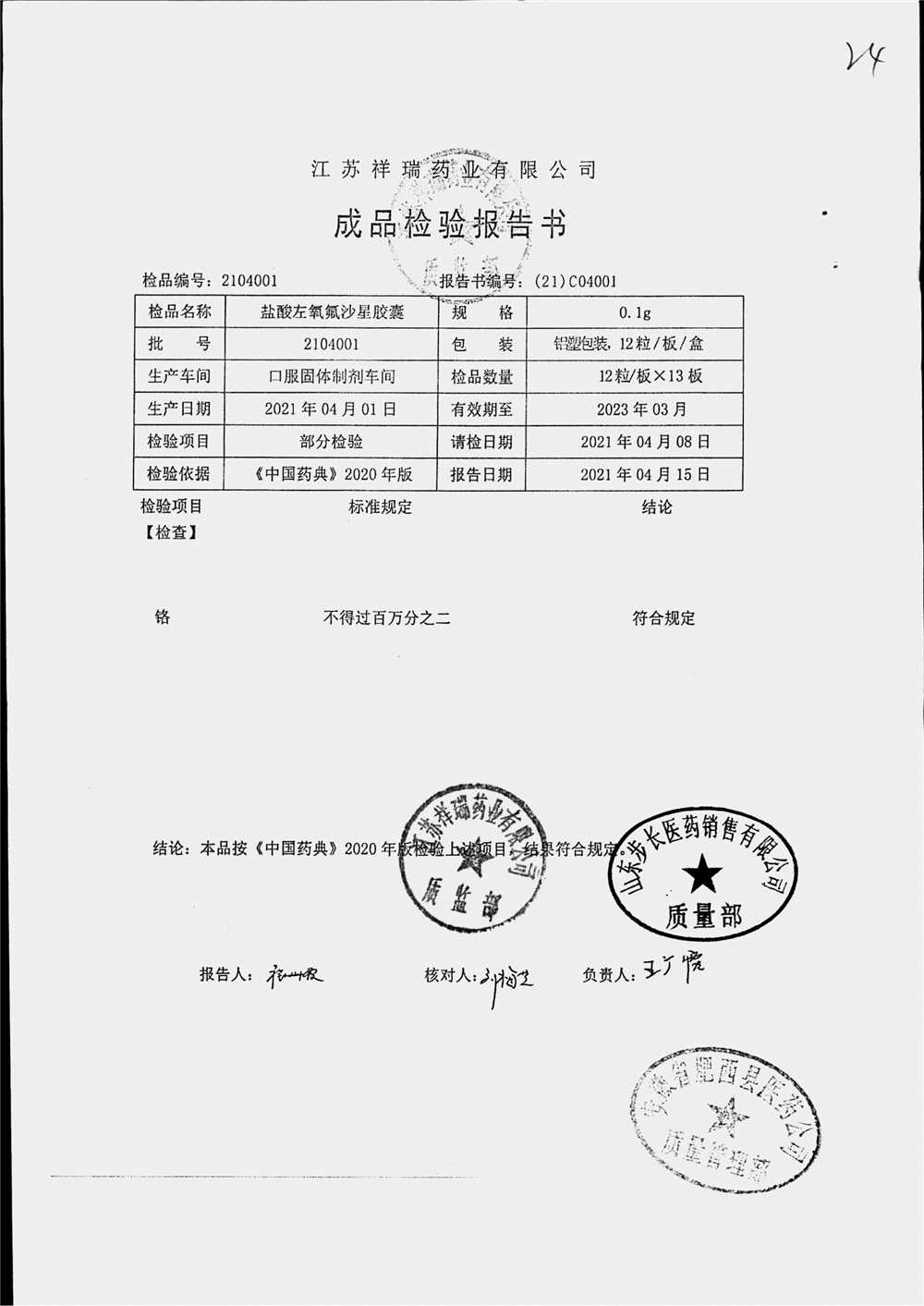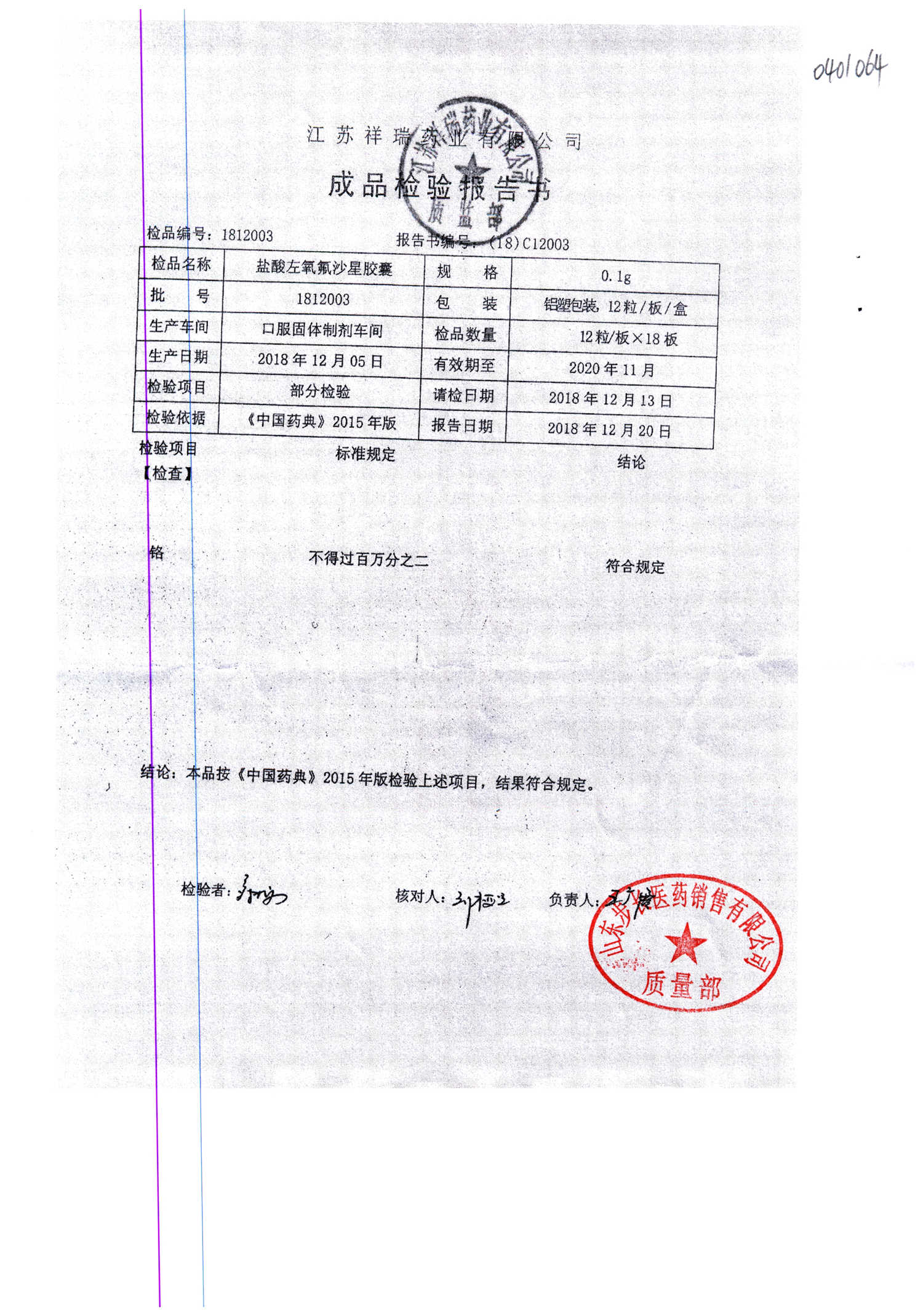 盐酸左氧氟沙星胶囊 | 0.1g*12粒 | 2009012(2/2) | 查看详情 |