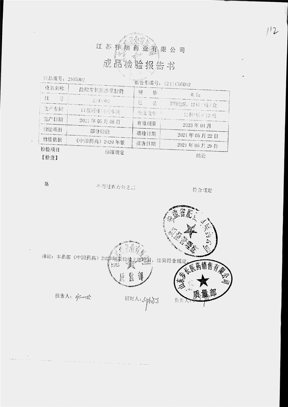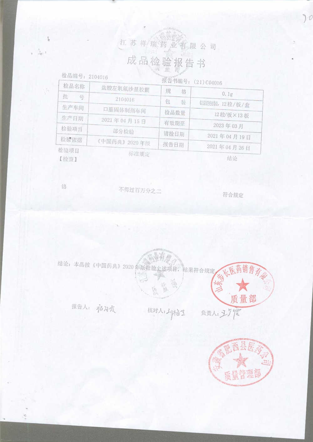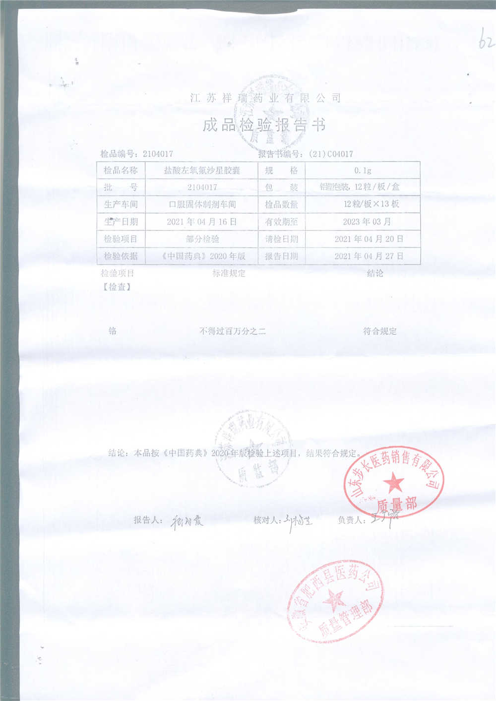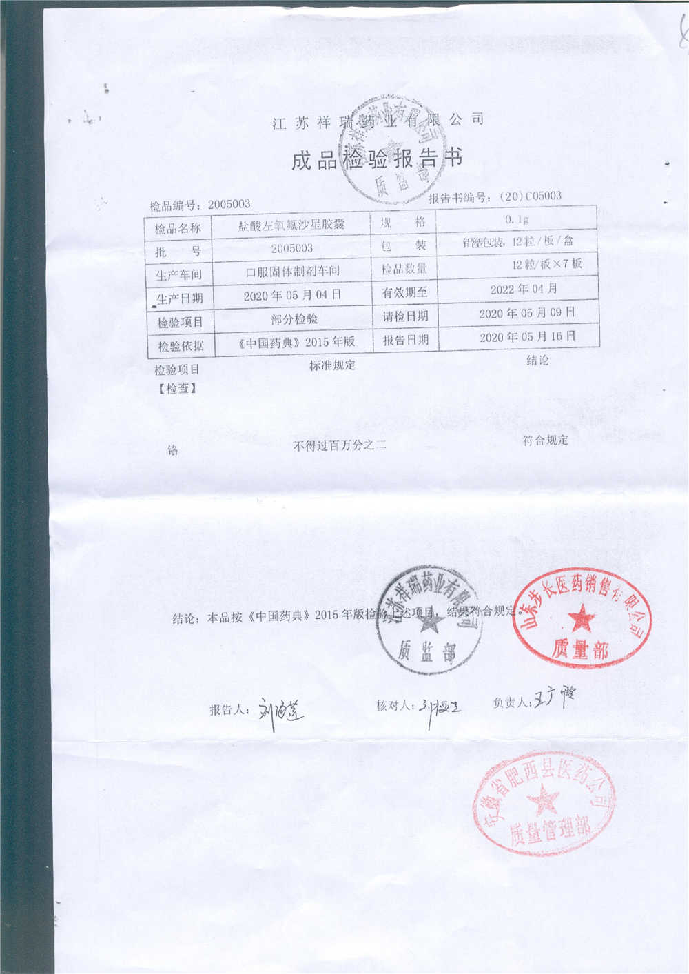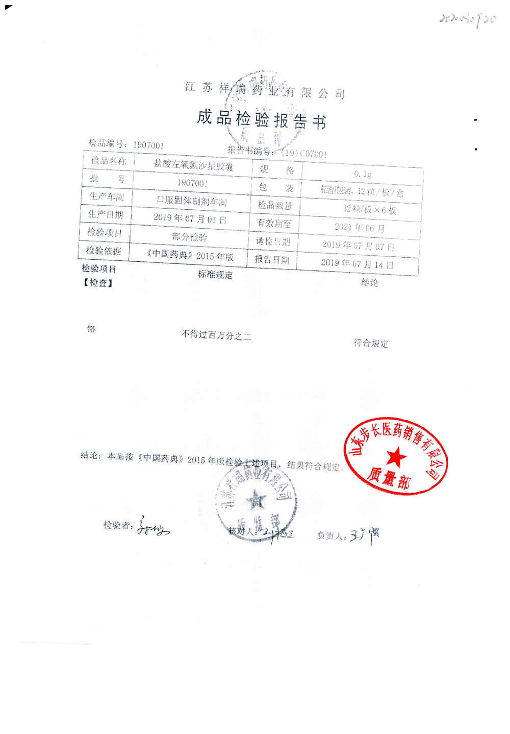 盐酸左氧氟沙星胶囊 | 0.1g*12粒 | 2009012(2/2) | 查看详情 |