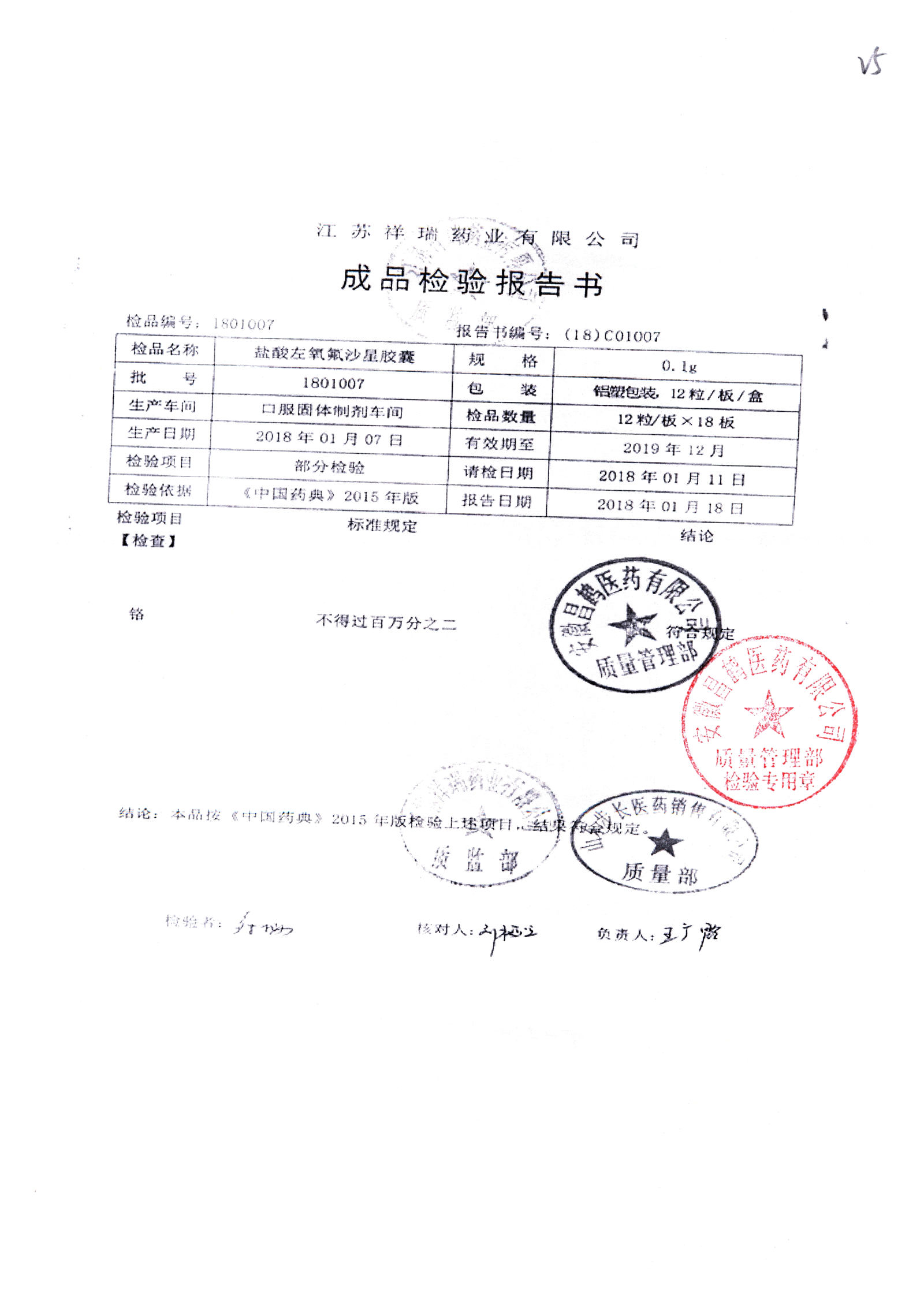 盐酸左氧氟沙星胶囊 | 0.1g*12粒 | 1801007(1/2) | 查看详情 |