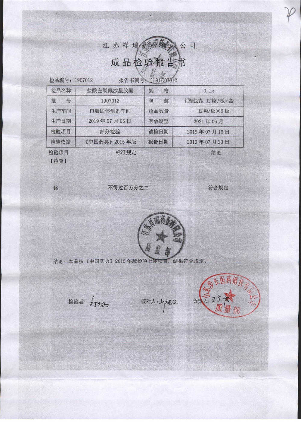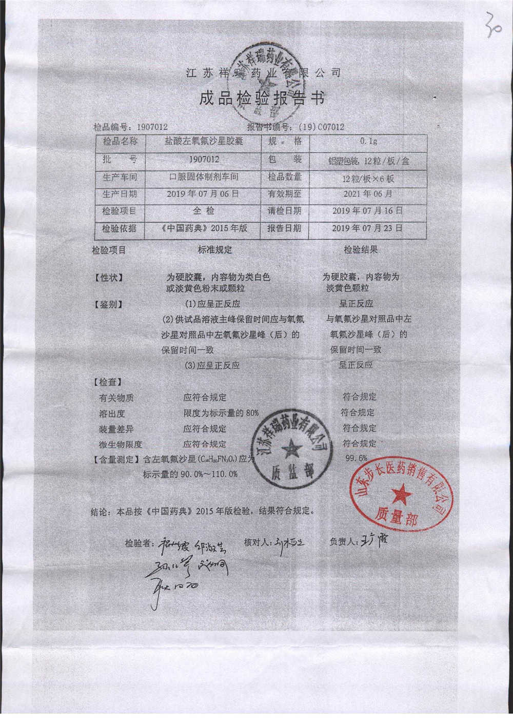 盐酸左氧氟沙星胶囊 | 0.1g*12粒 | 1907012(2/2) | 查看详情 |
