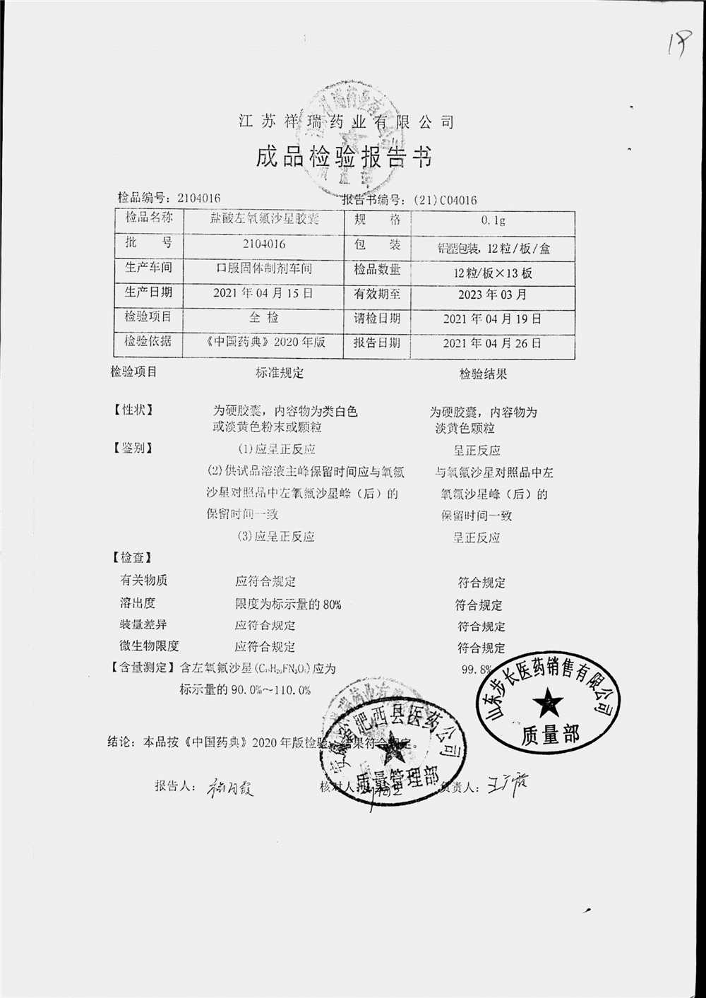 盐酸左氧氟沙星胶囊 | 0.1g*12粒 | 1801007(2/2) | 查看详情 |