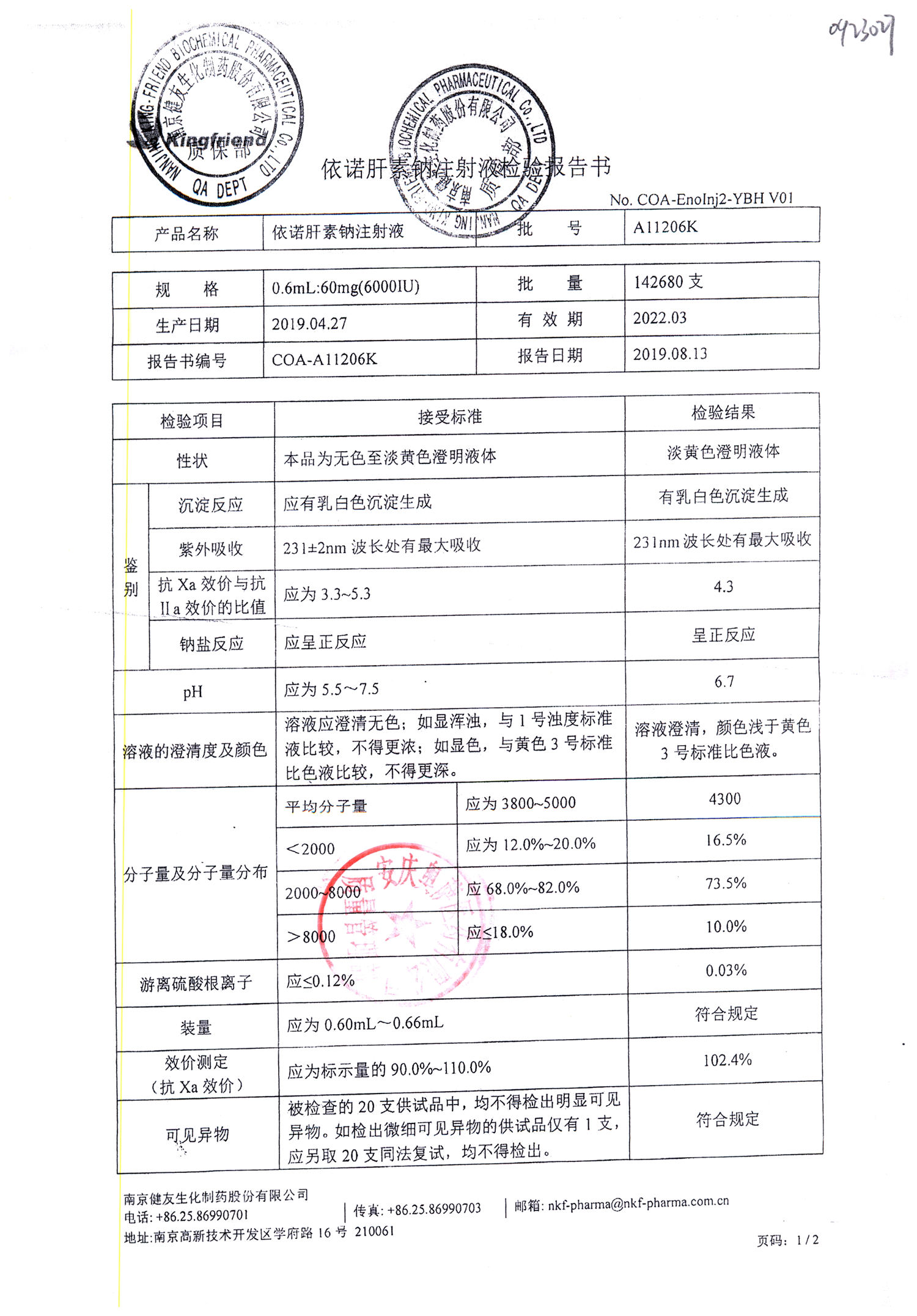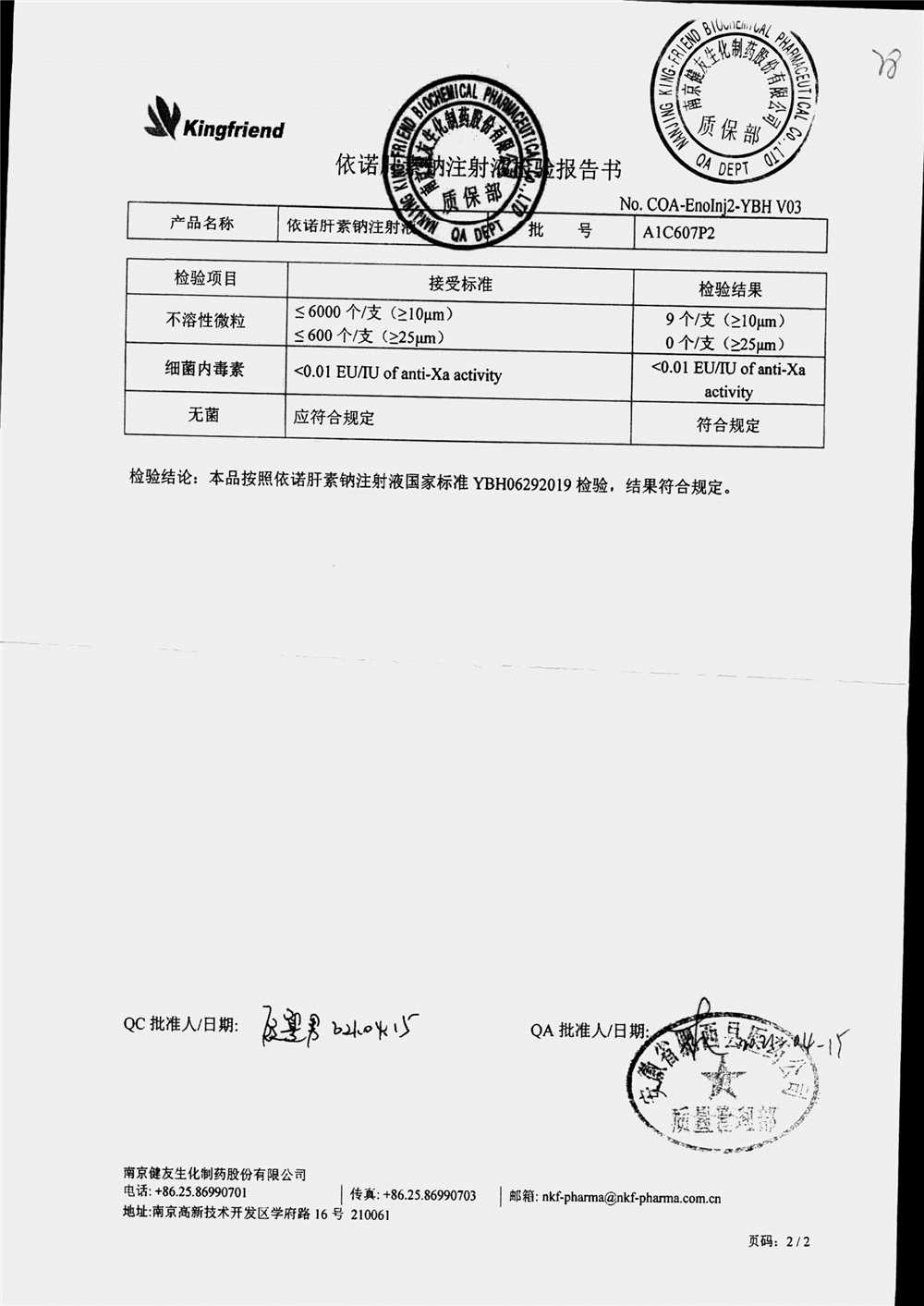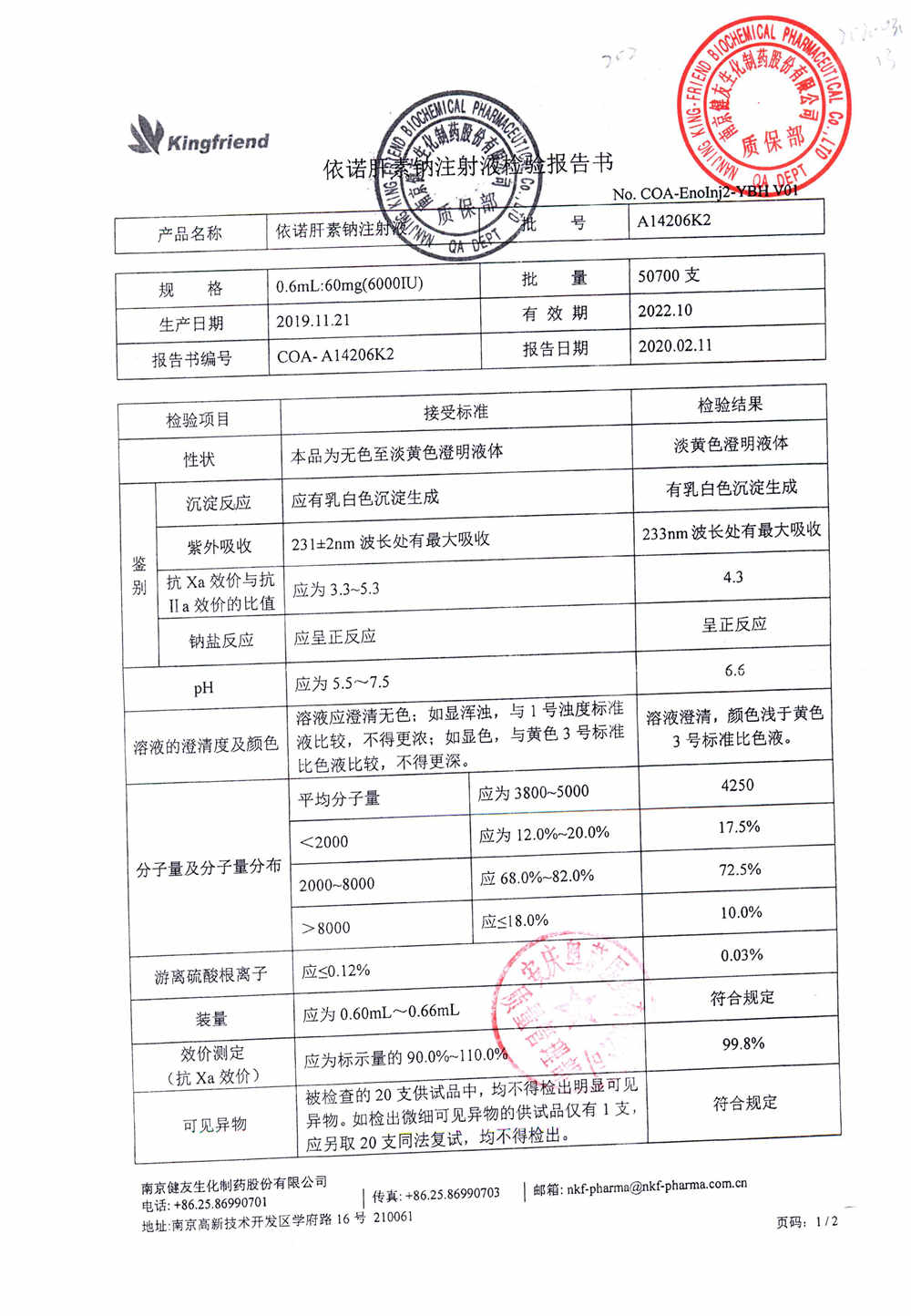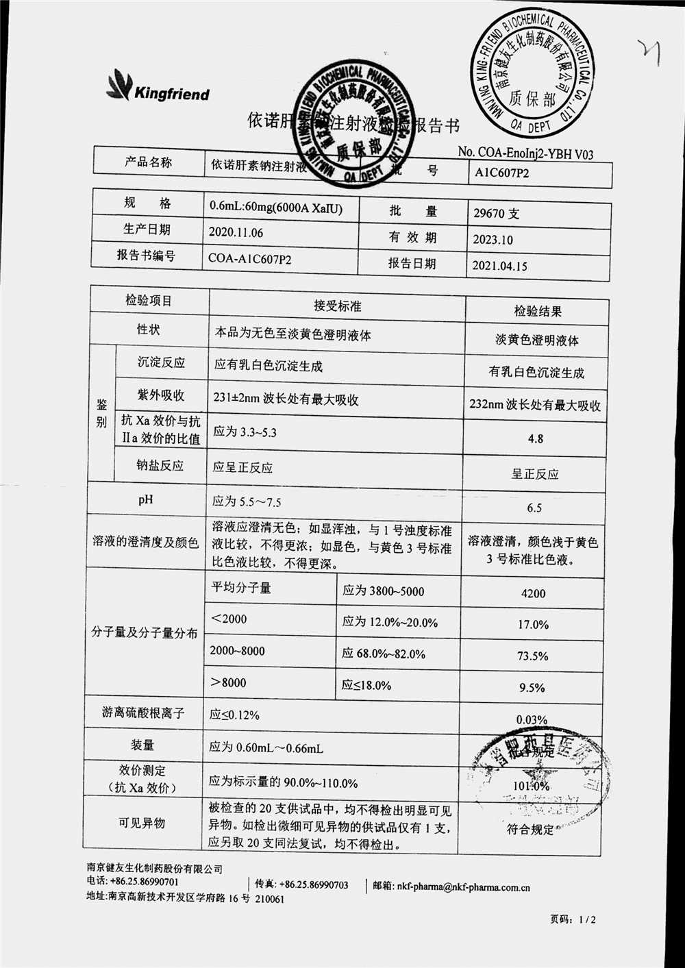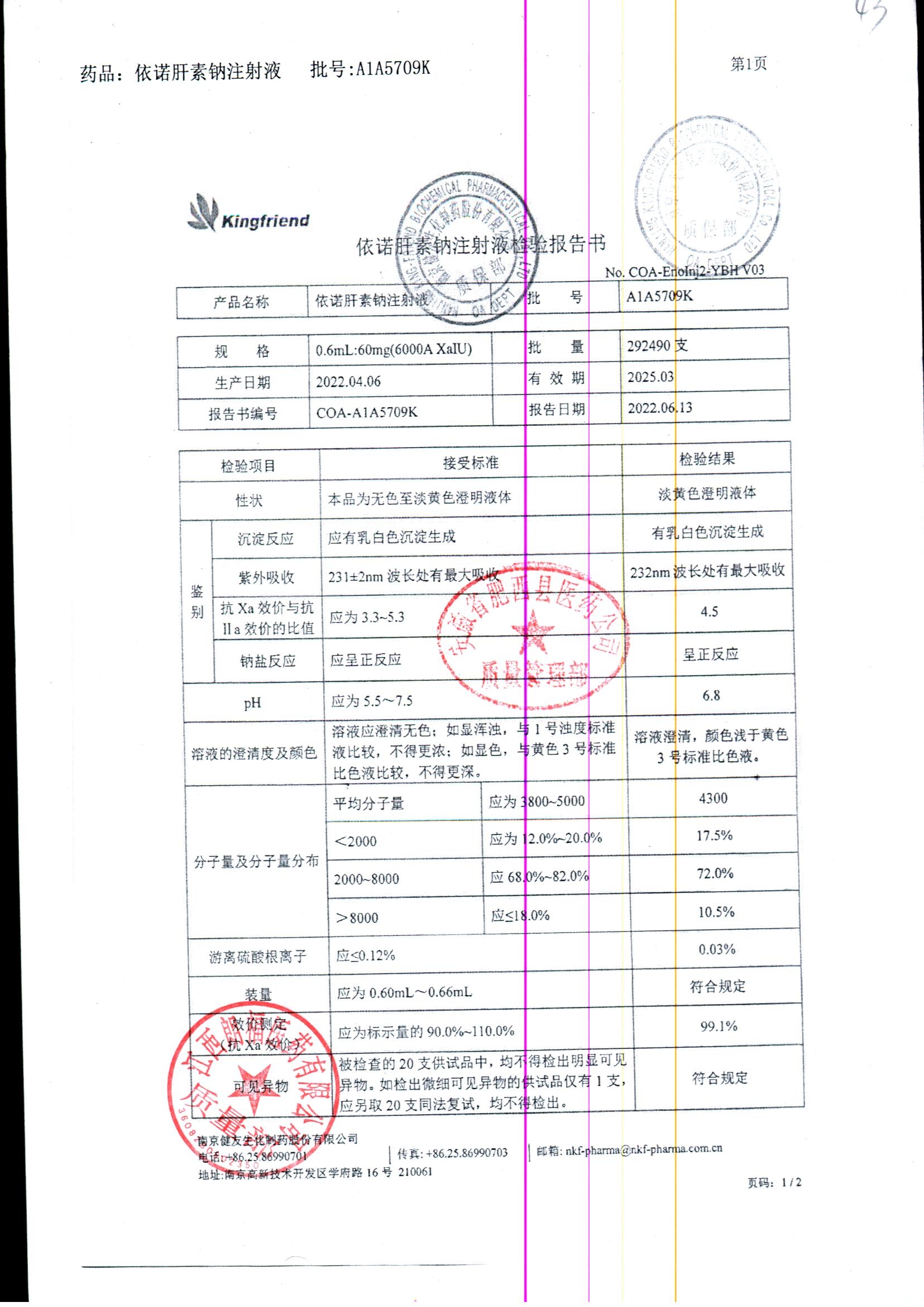 依诺肝素钠注射液 | 0.6ml:60mg | A1C607P2(2/2) | 查看详情 |