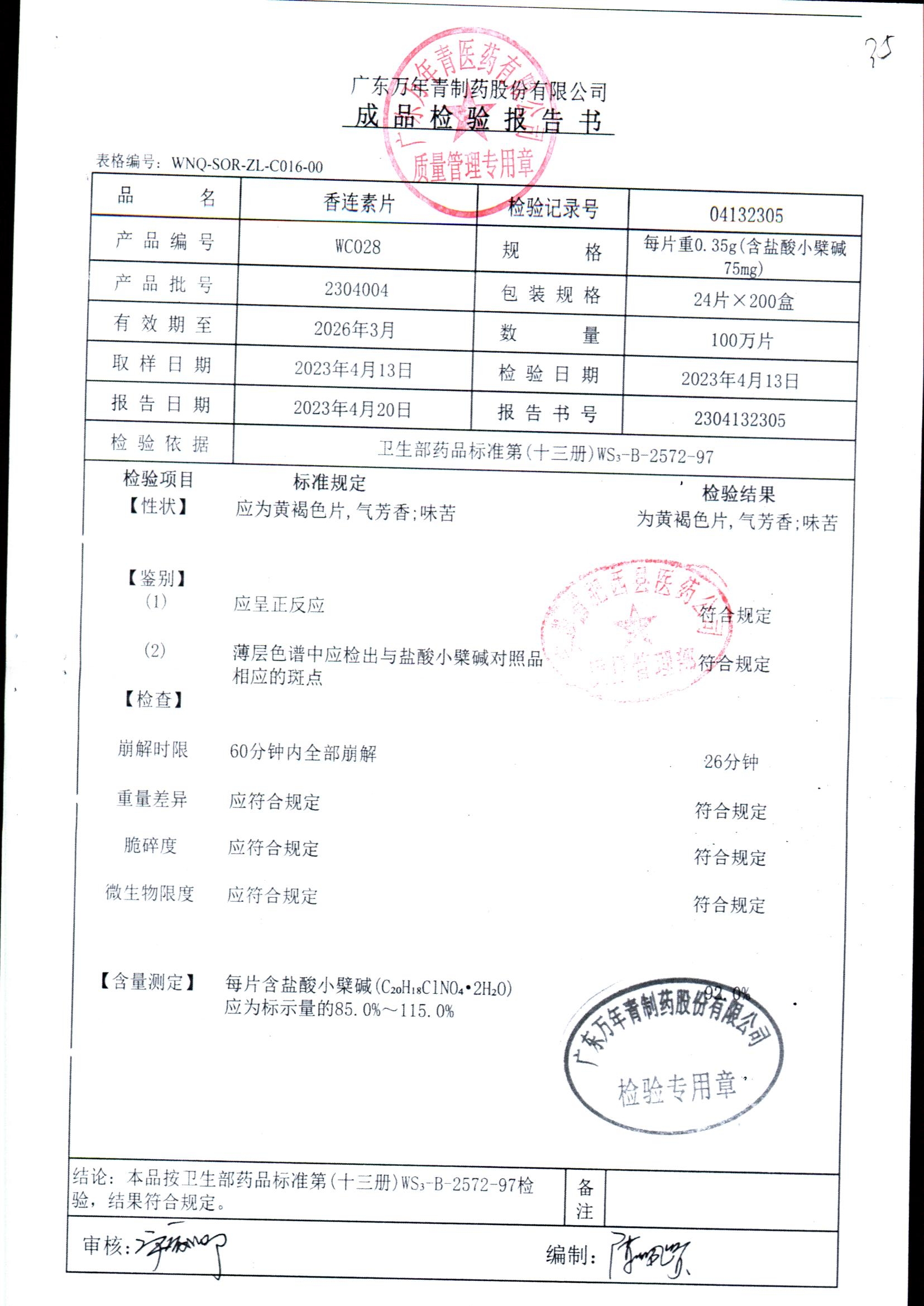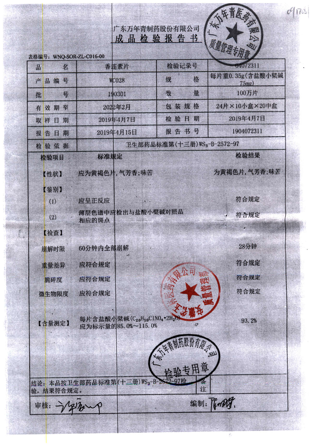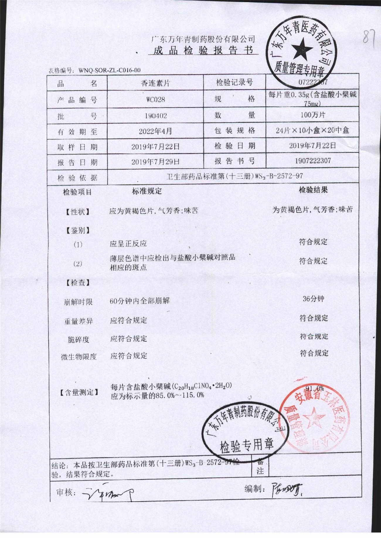 香连素片 | 0.35g*24片 | 190402 | 查看详情 |