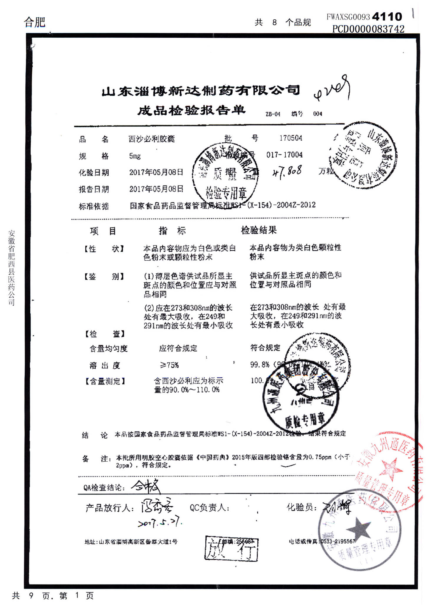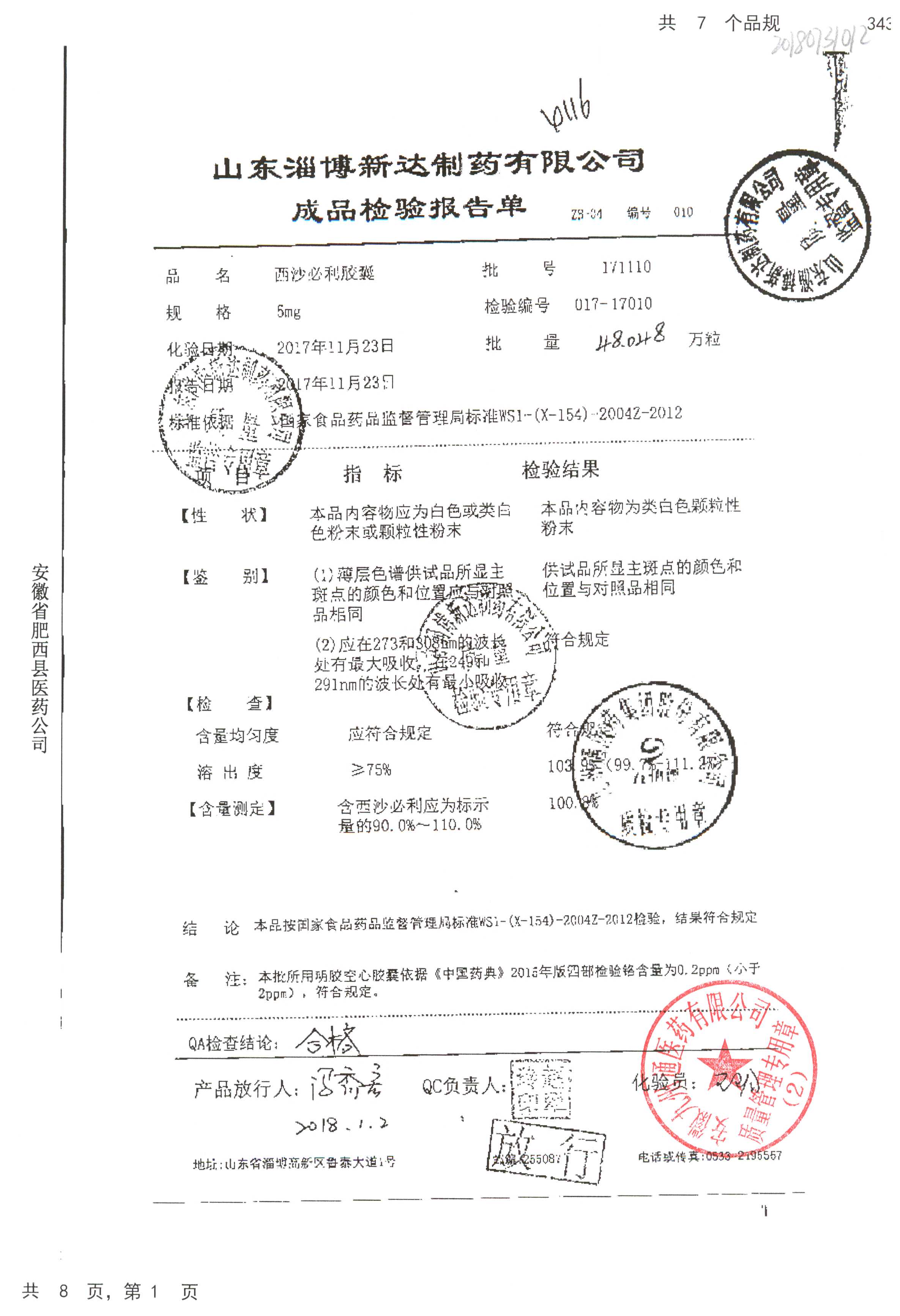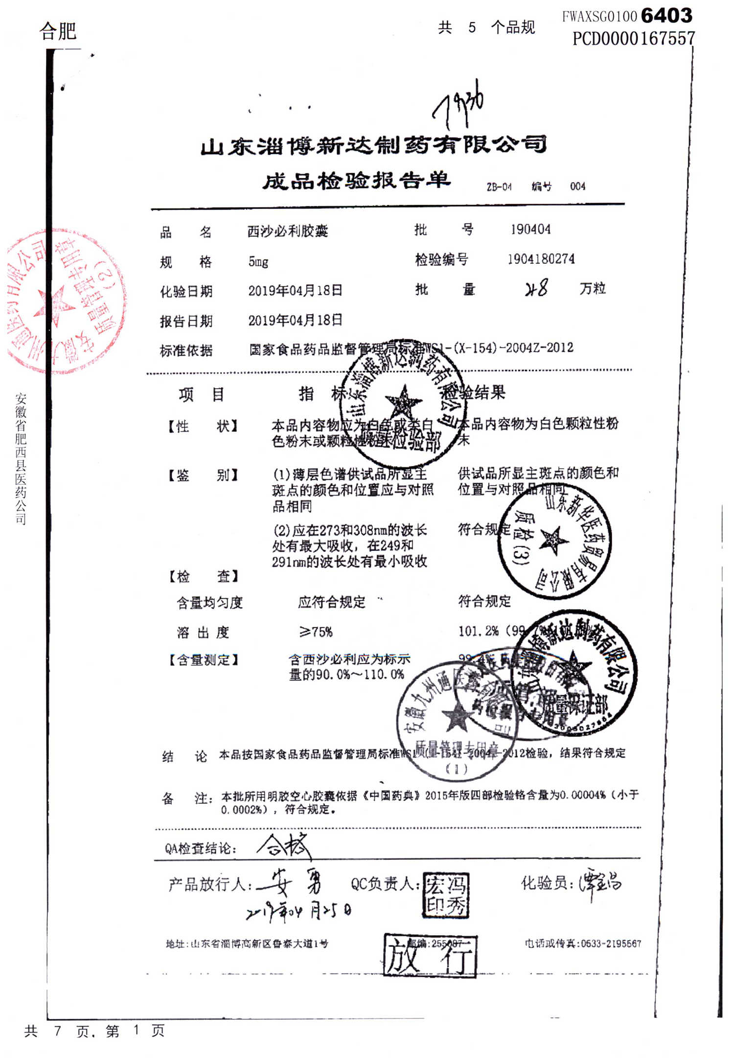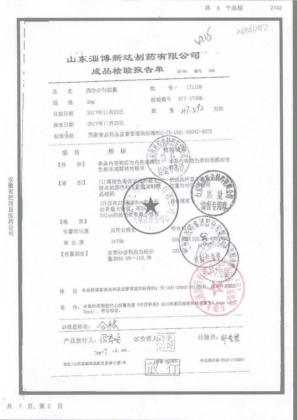 西沙必利胶囊 | 5mg | 180704 | 查看详情 |