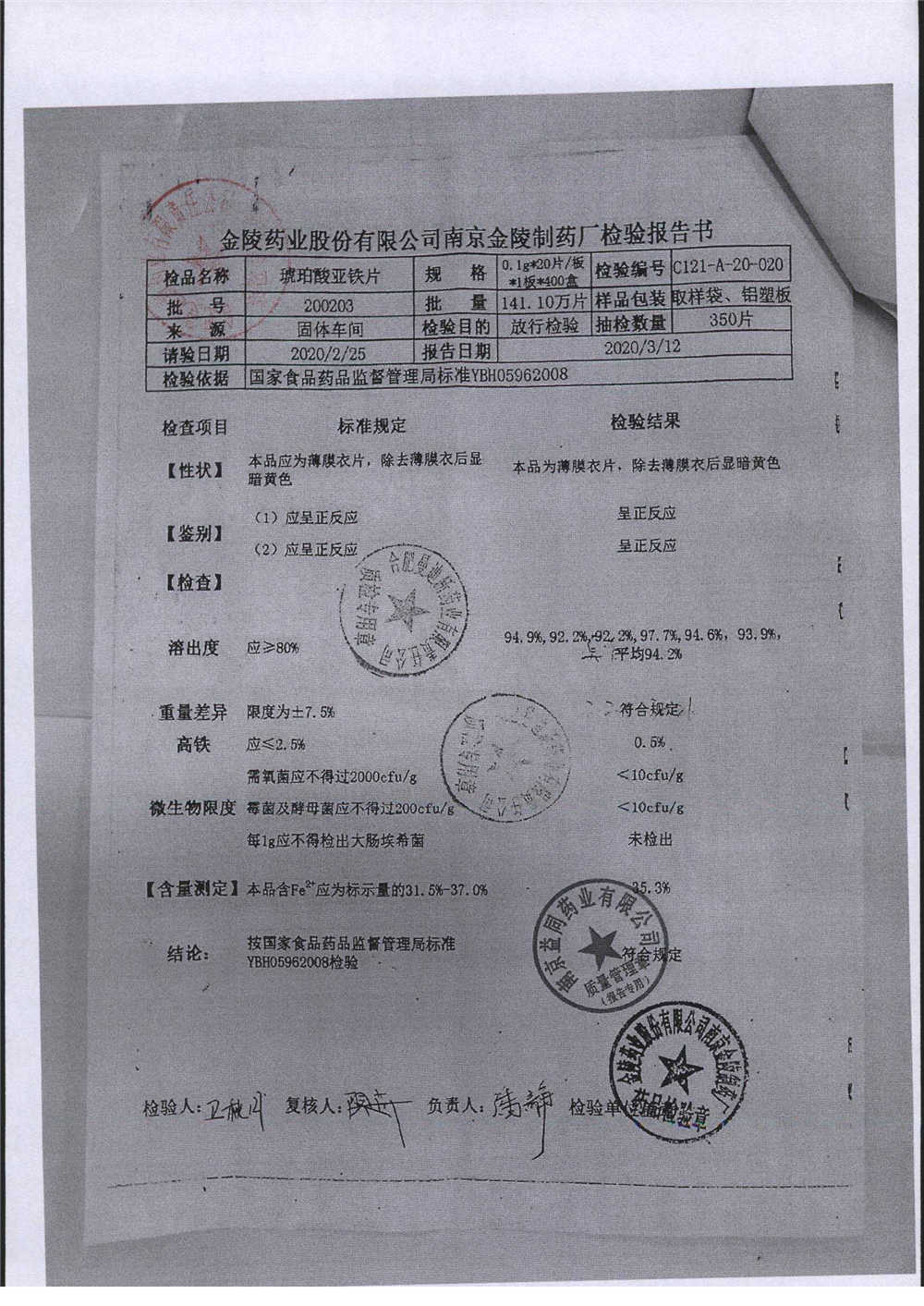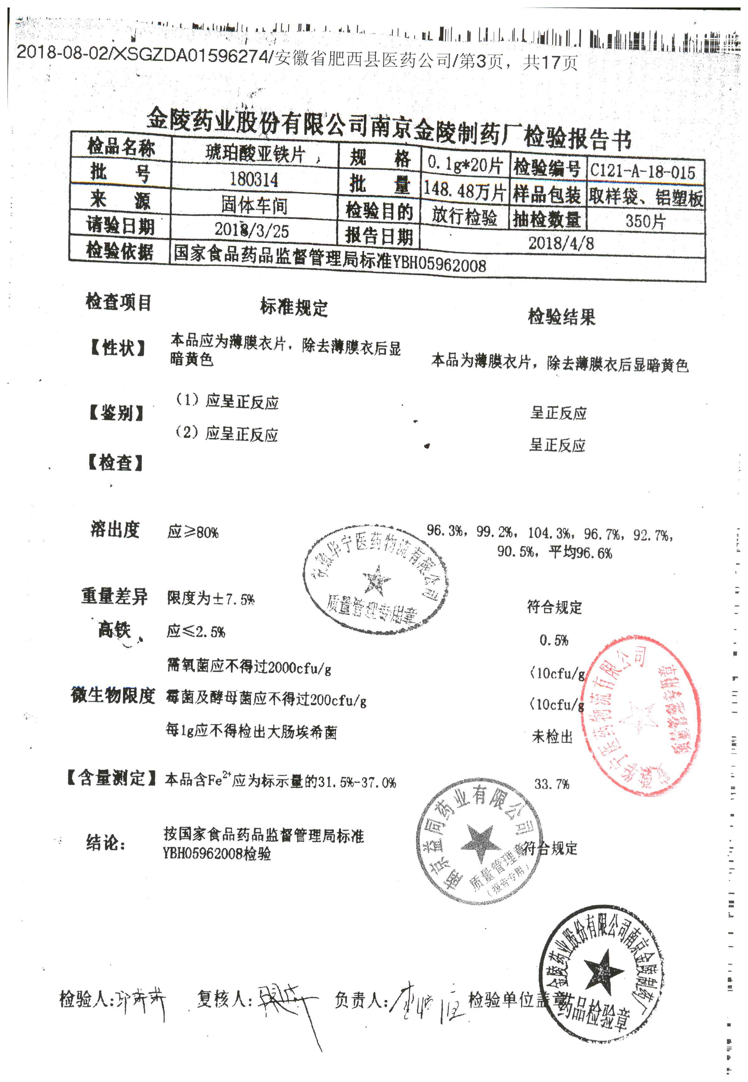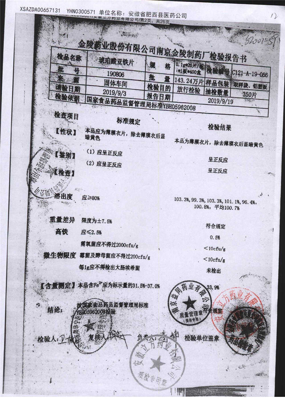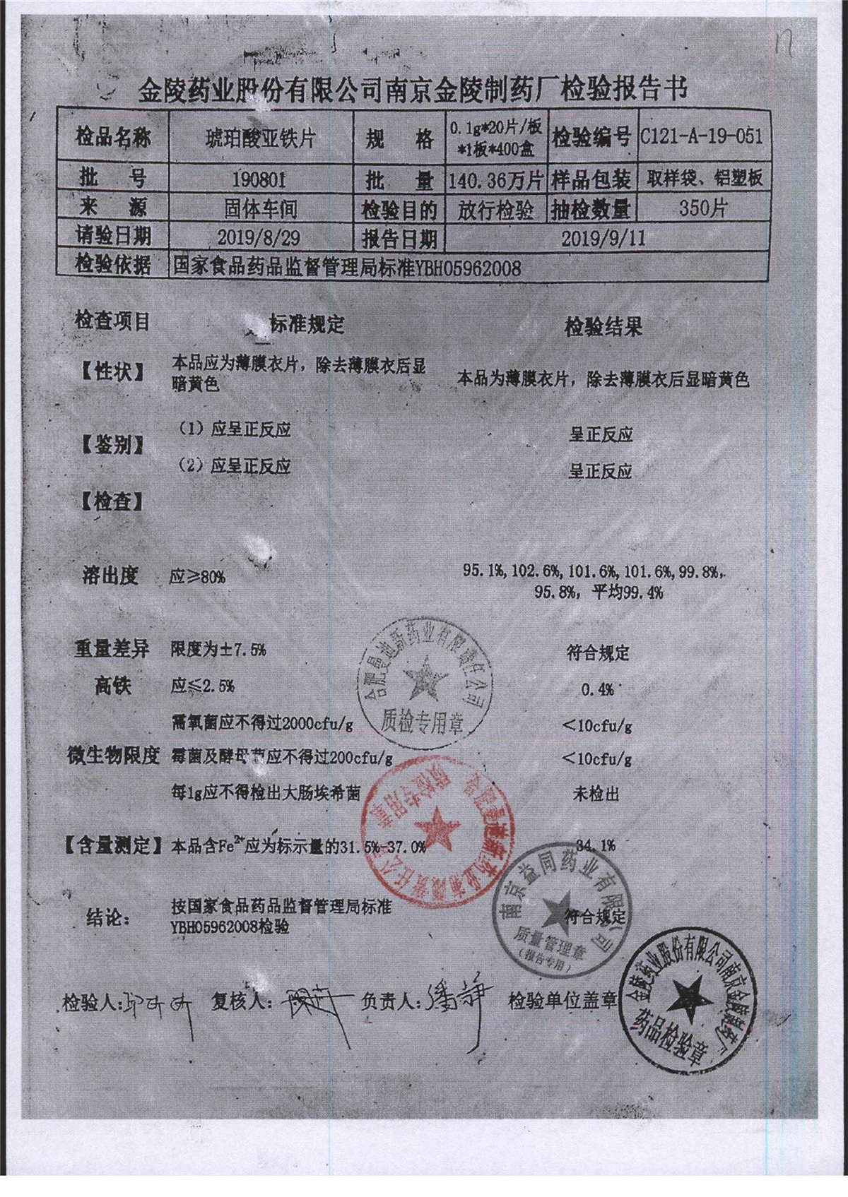 琥珀酸亚铁片 | 0.1g*20片 | 190806 | 查看详情 |