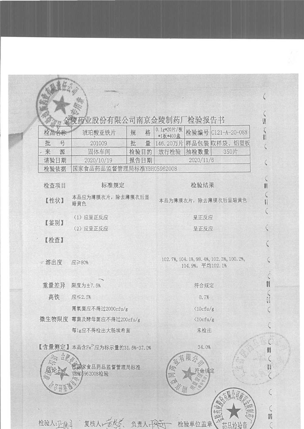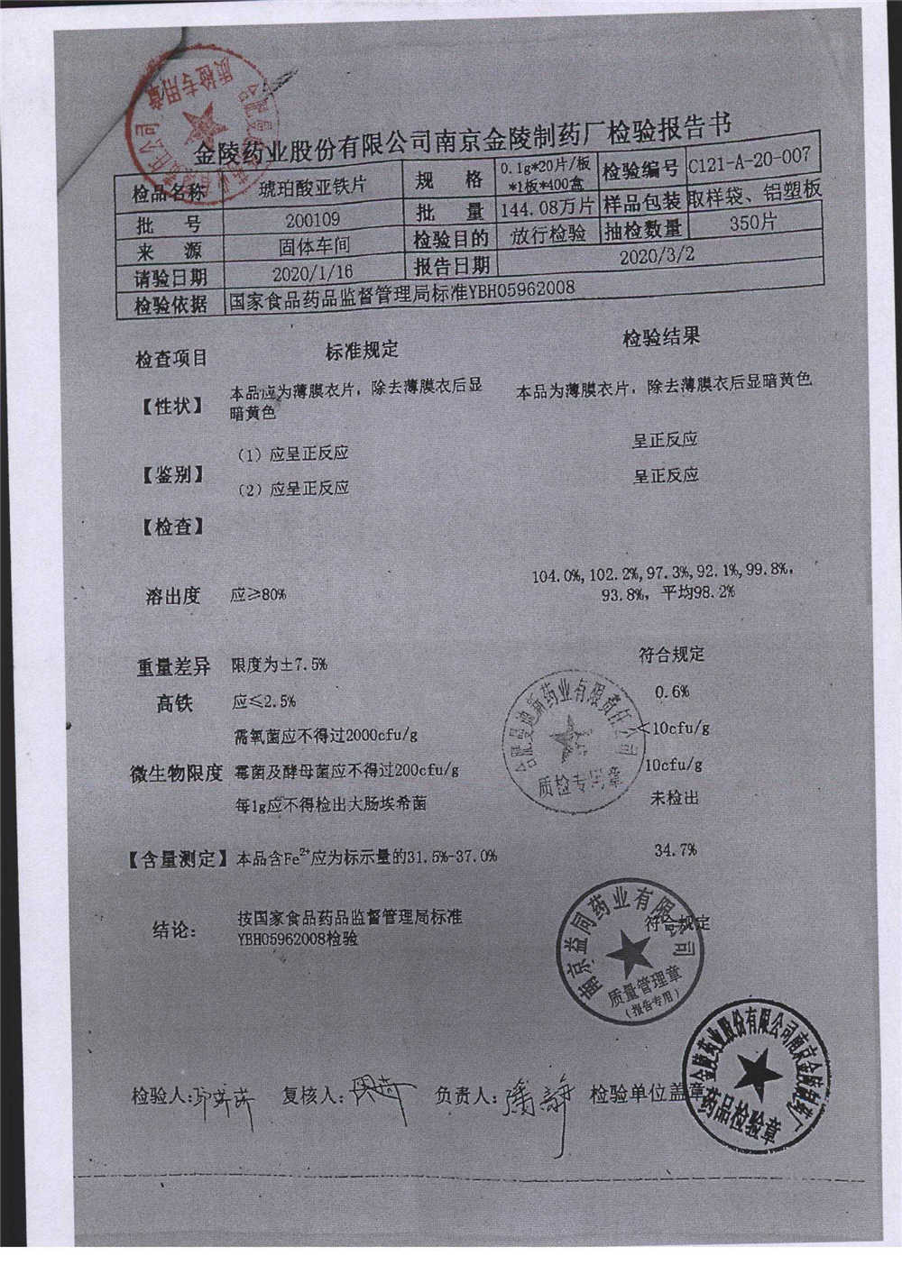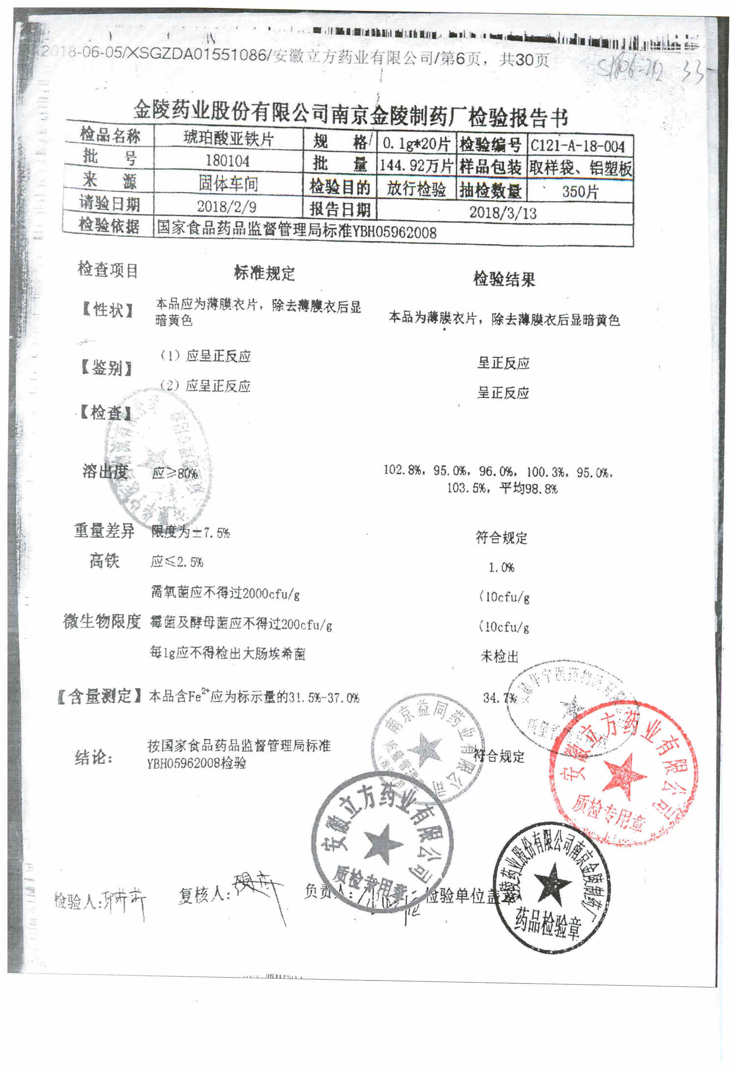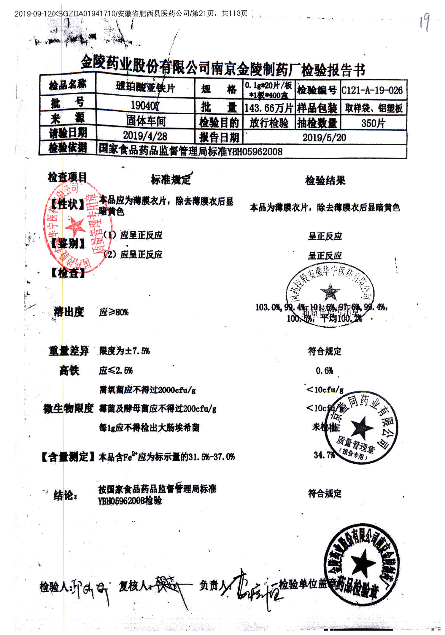 琥珀酸亚铁片 | 0.1g*20片 | 190806 | 查看详情 |