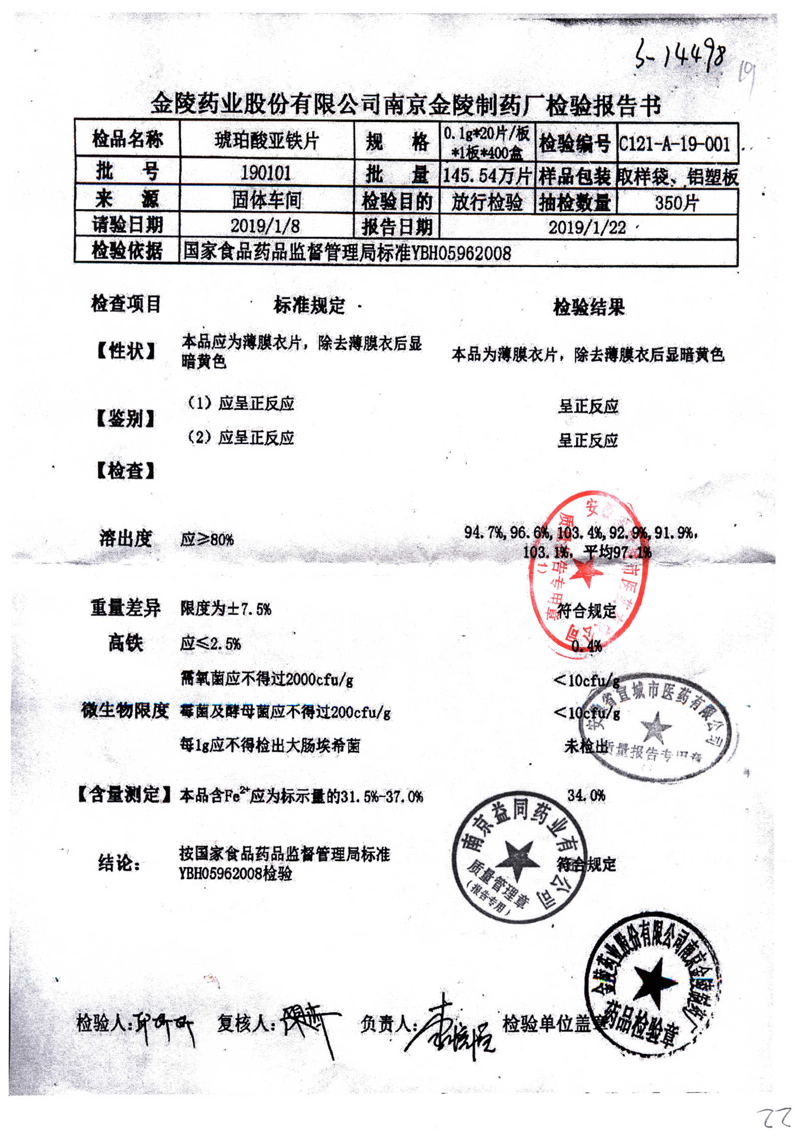 琥珀酸亚铁片 | 0.1g*20片 | 190407 | 查看详情 |