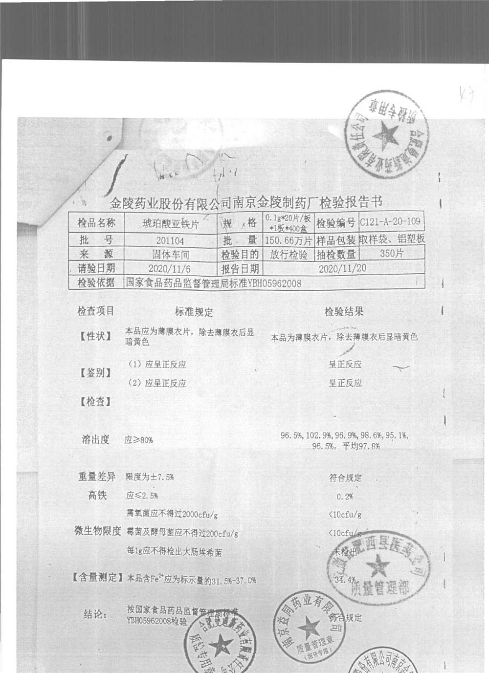 琥珀酸亚铁片 | 0.1g*20片 | 201104 | 查看详情 |