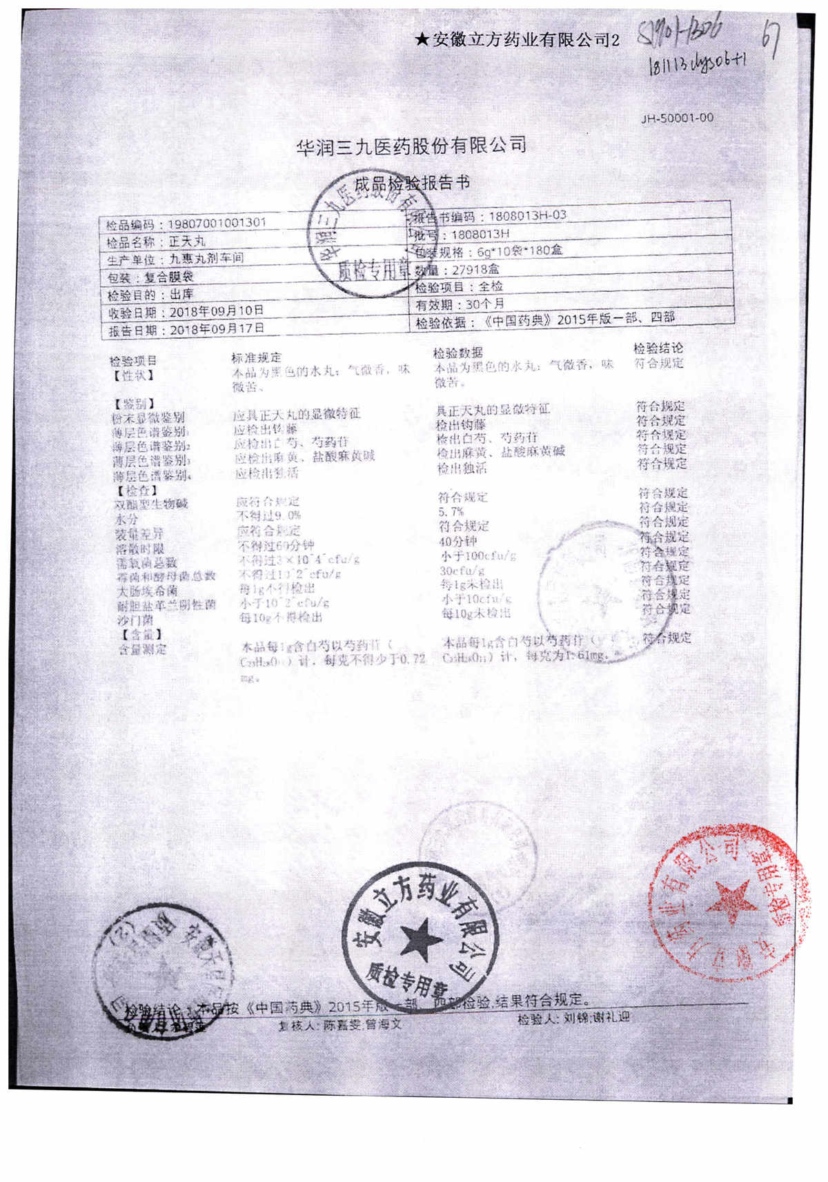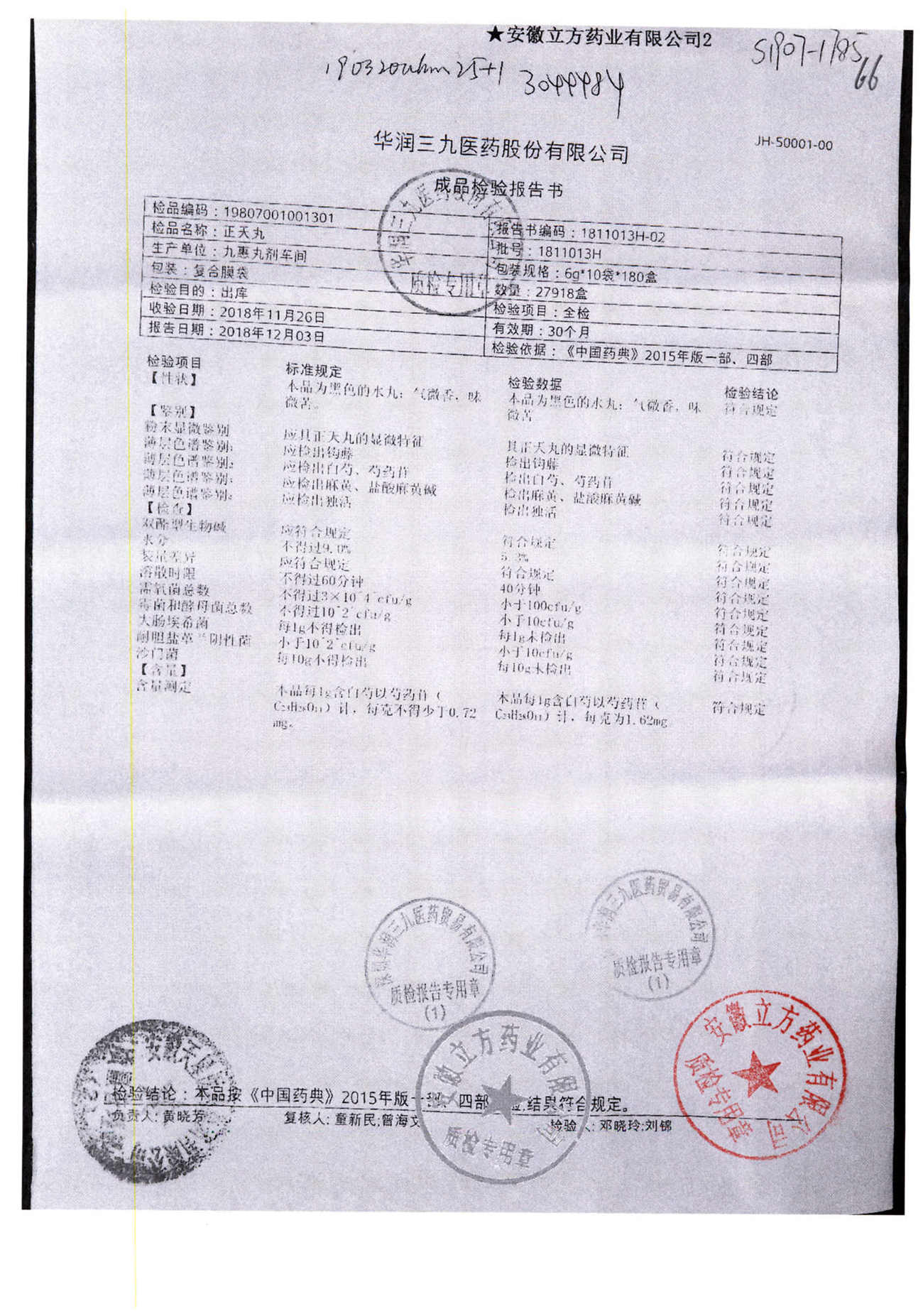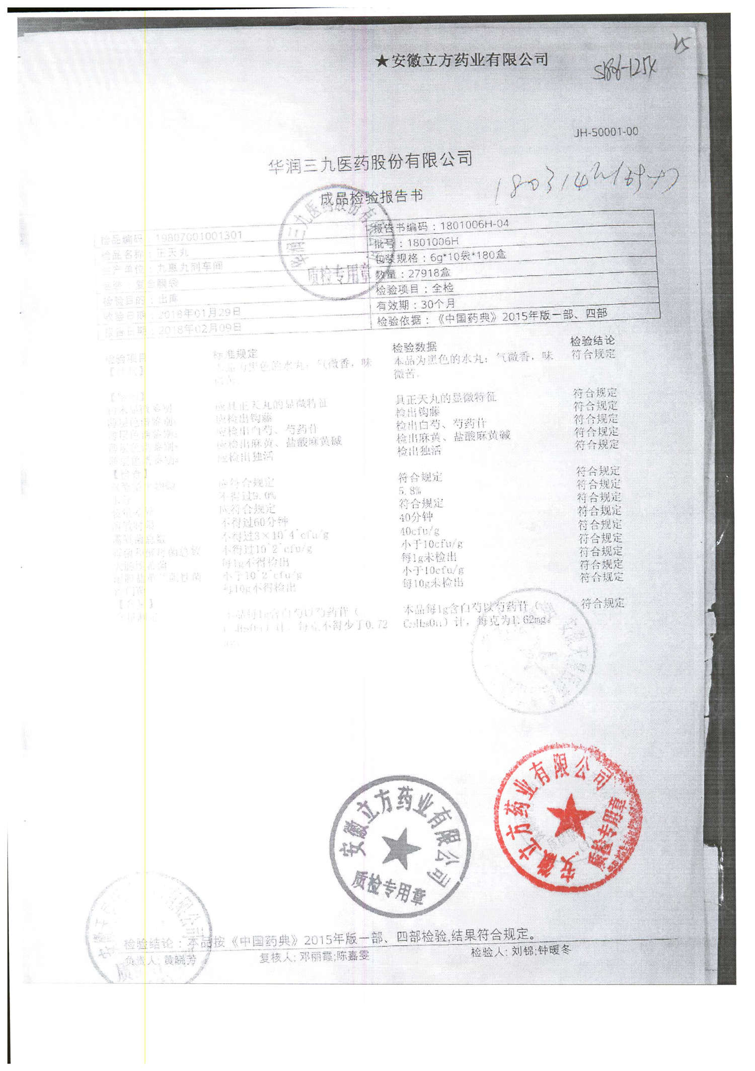 名称 | 规格 | 批号 | 药检报告 |