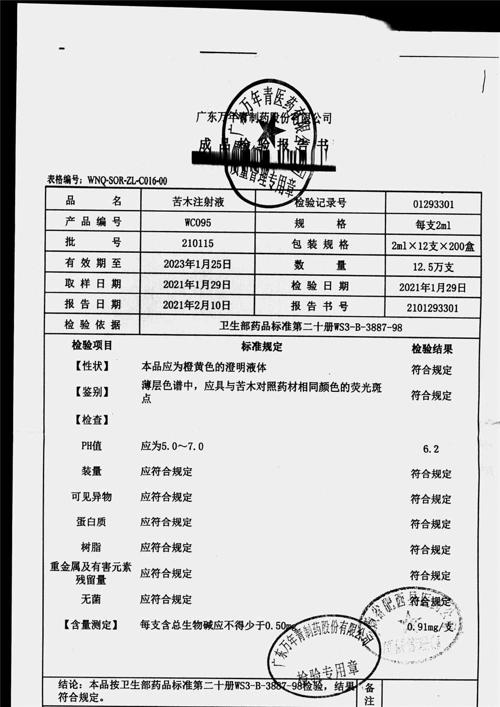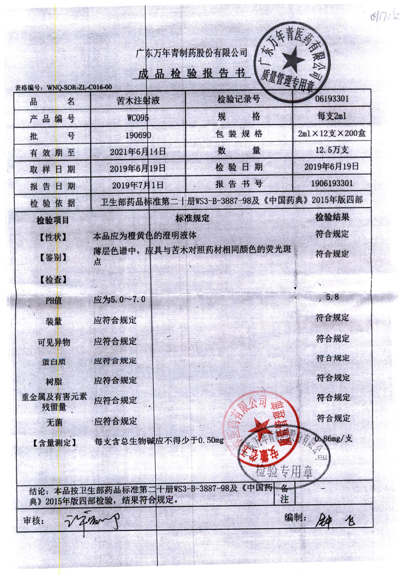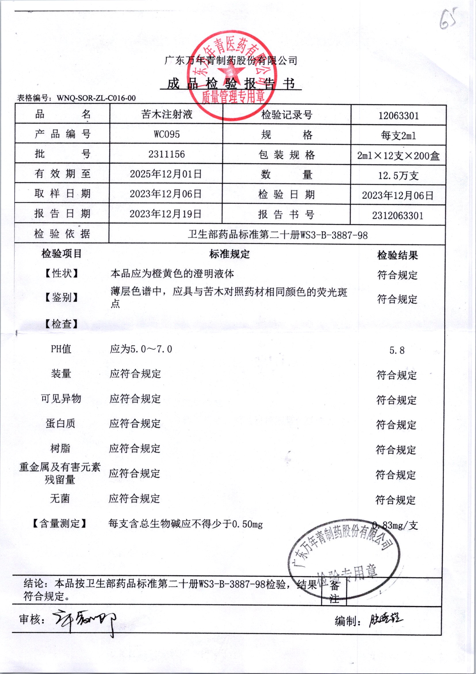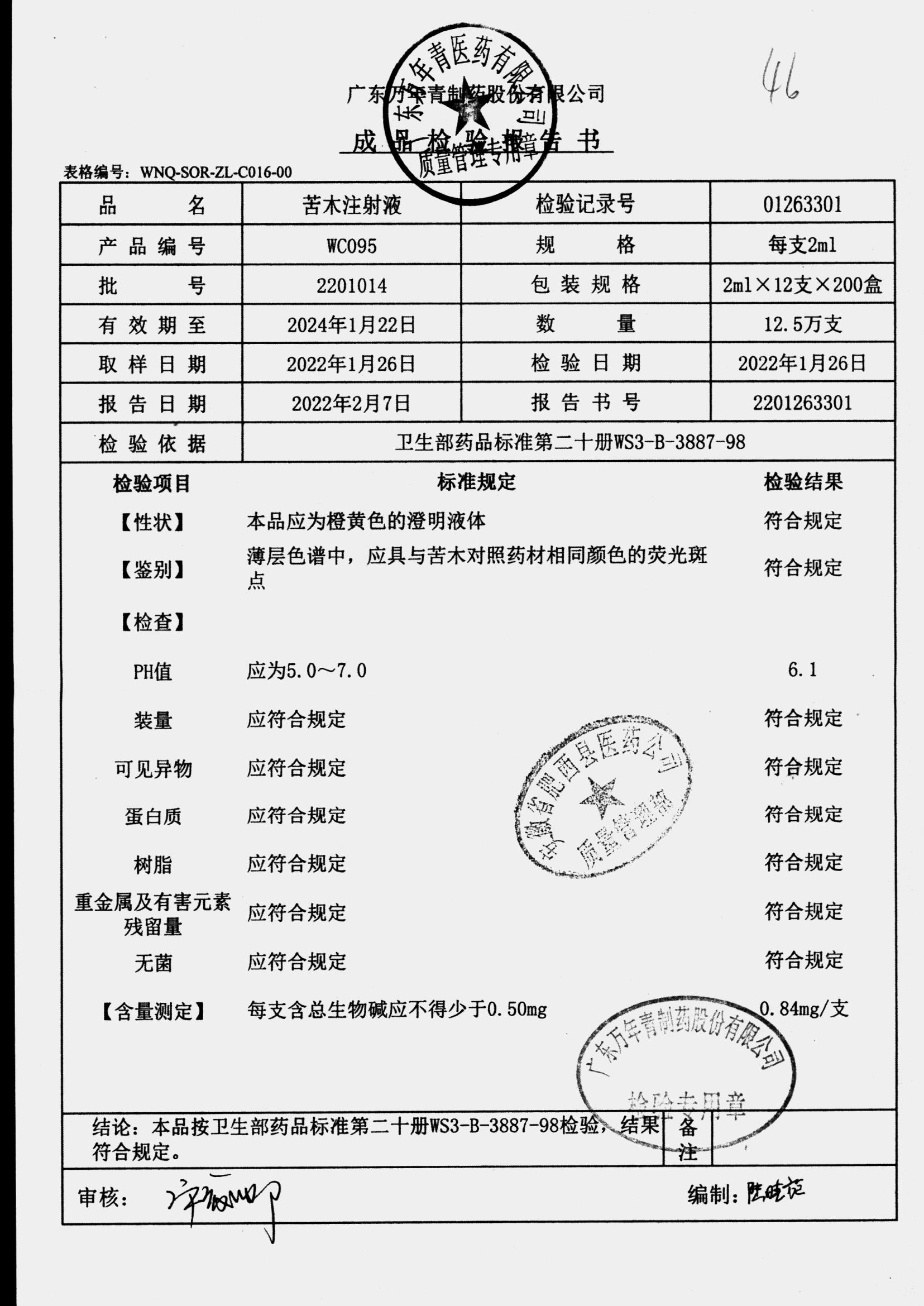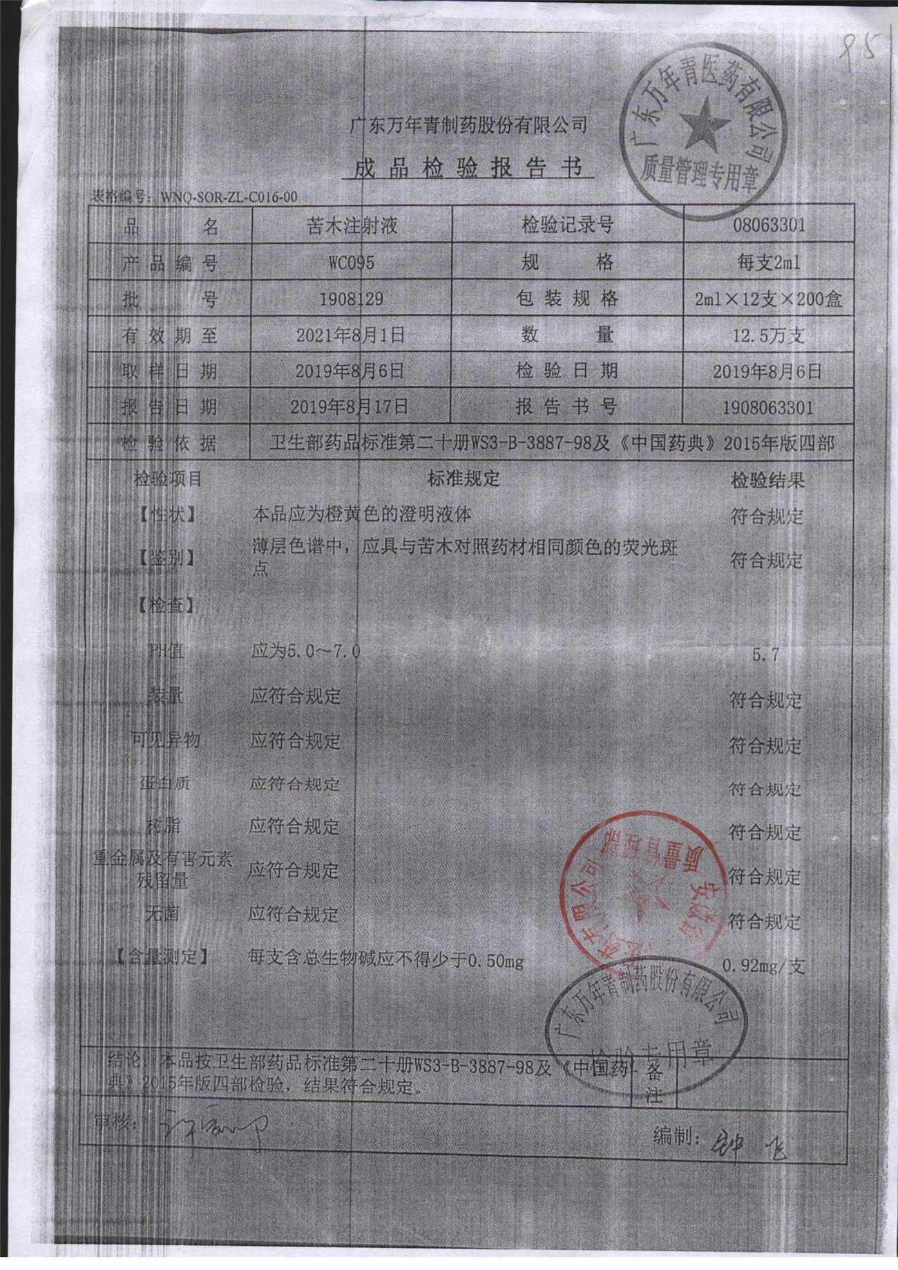 苦木注射液 | 2ml | 210115 | 查看详情 |
