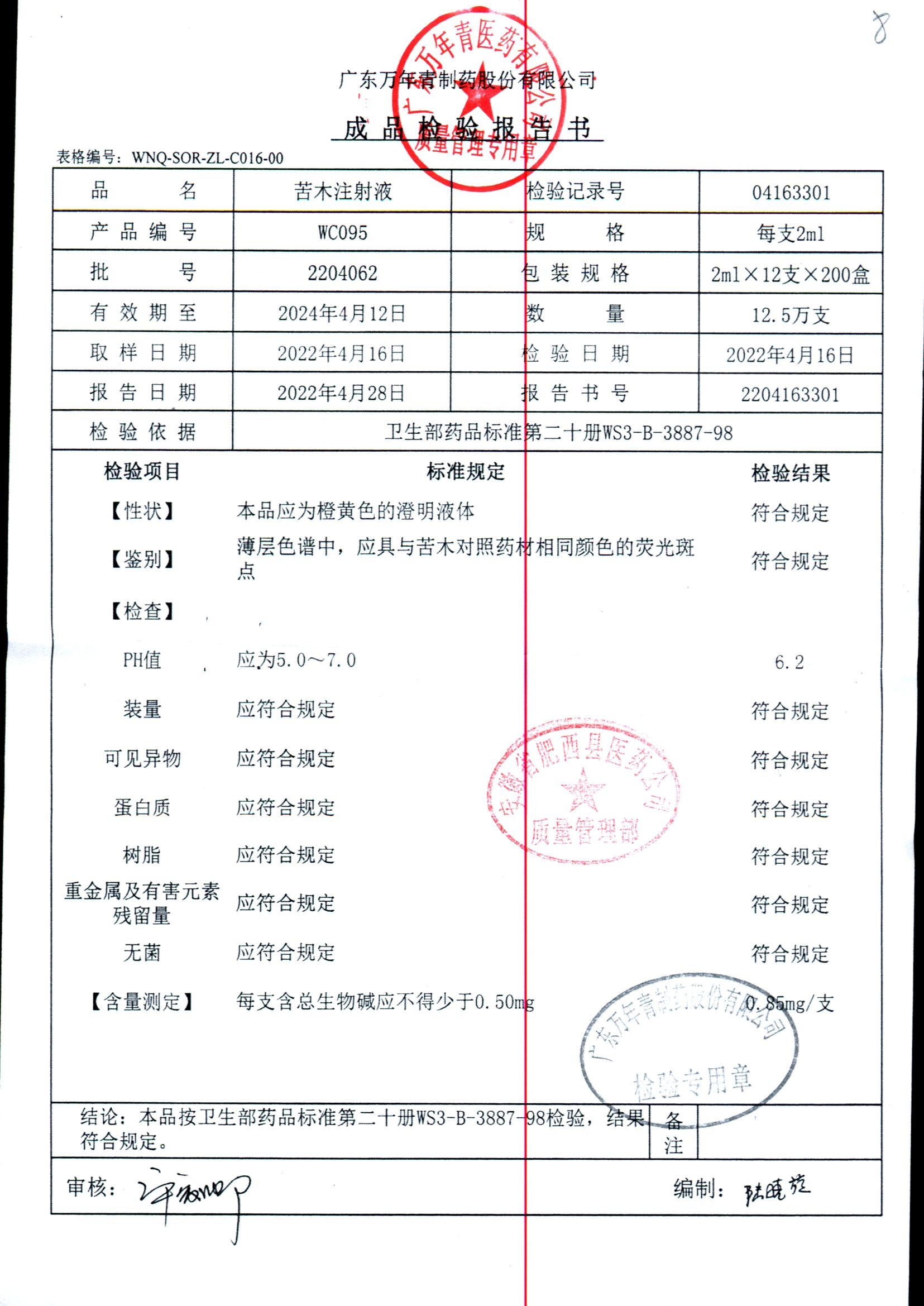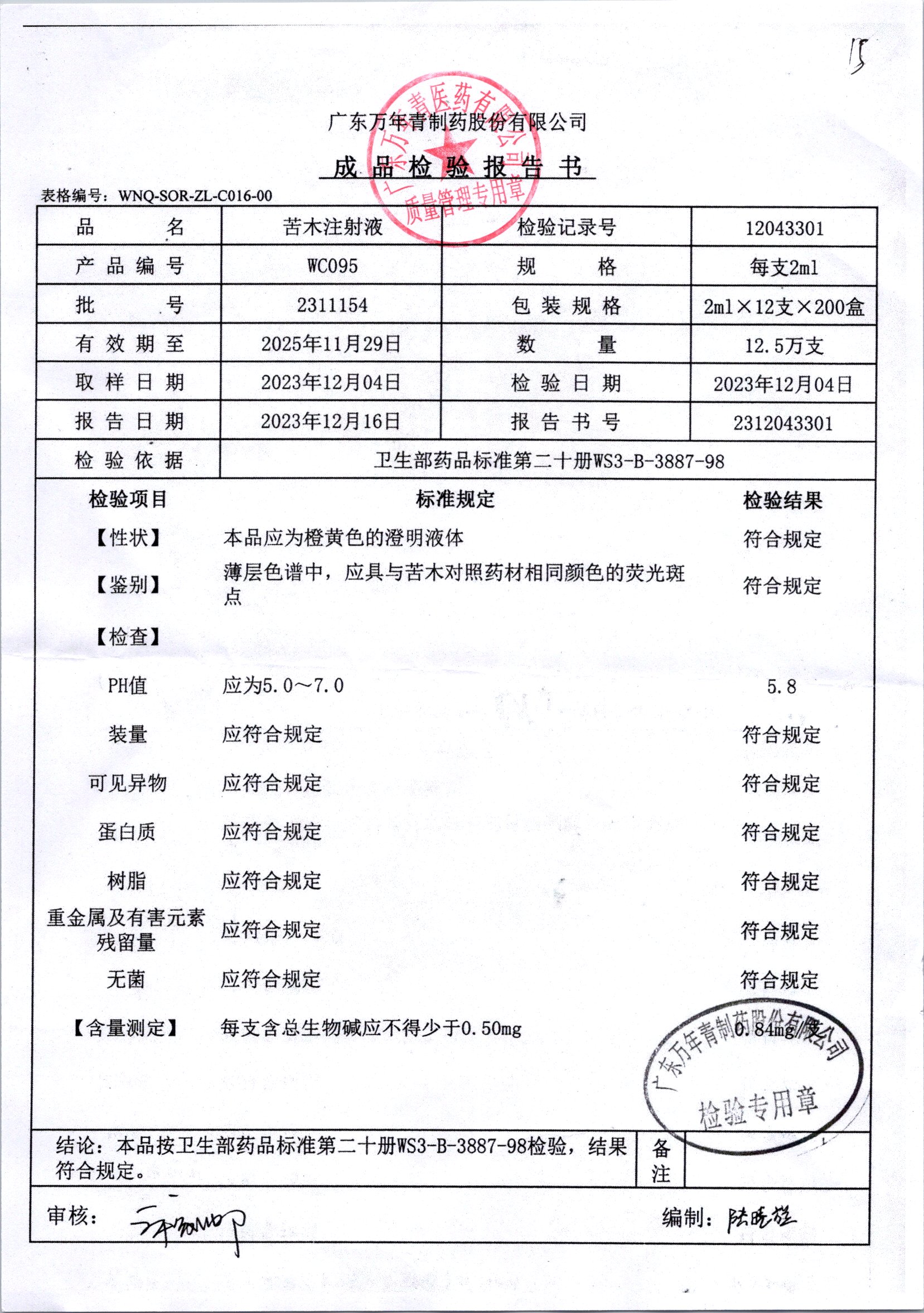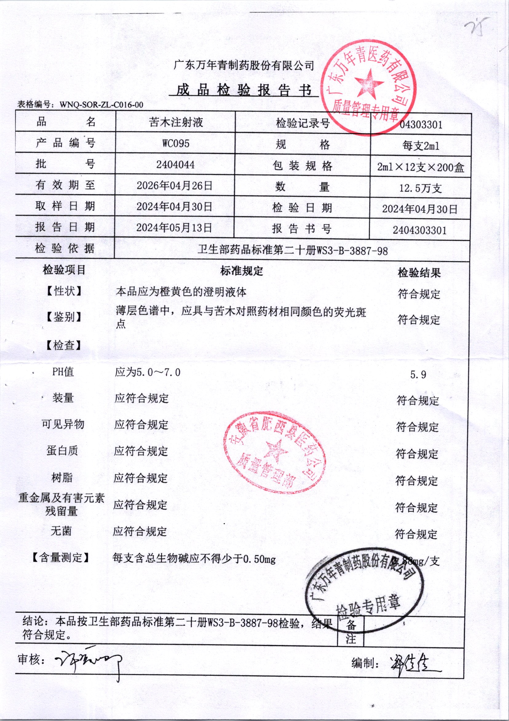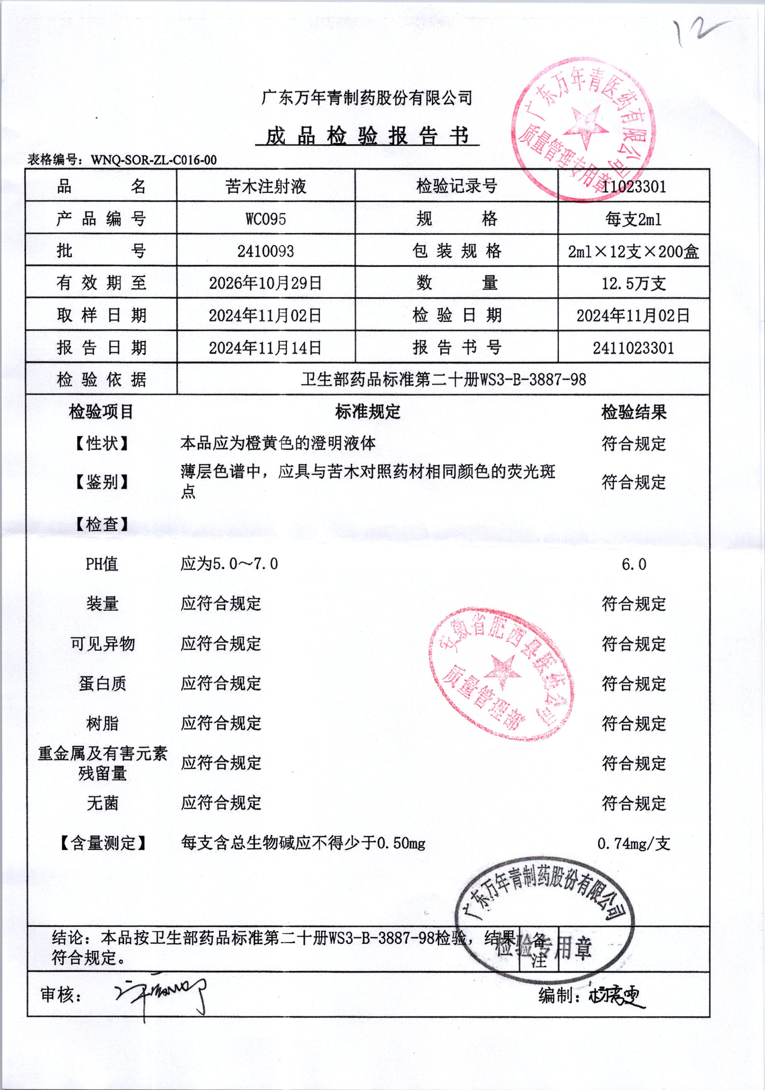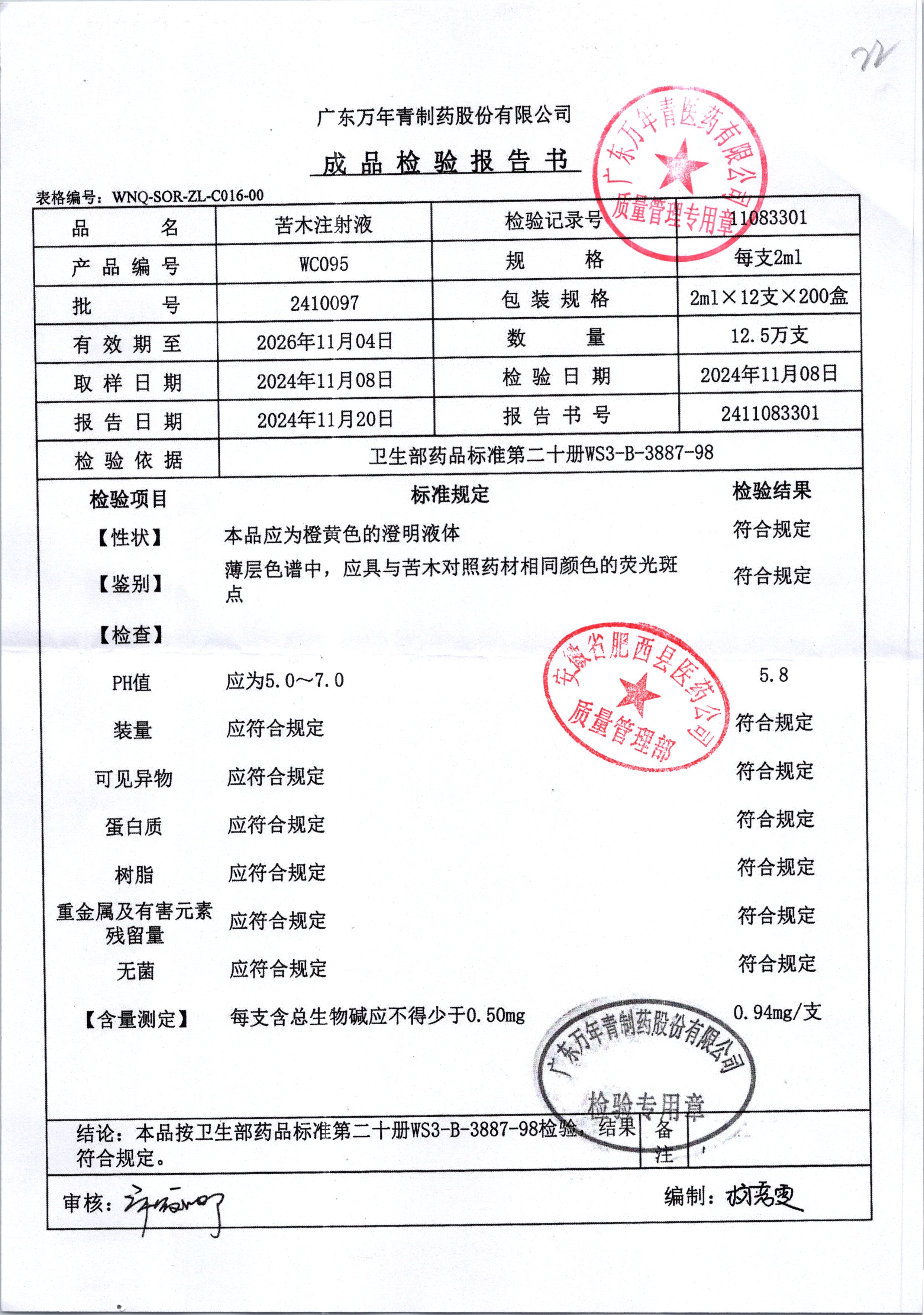 苦木注射液 | 2ml | 210115 | 查看详情 |
