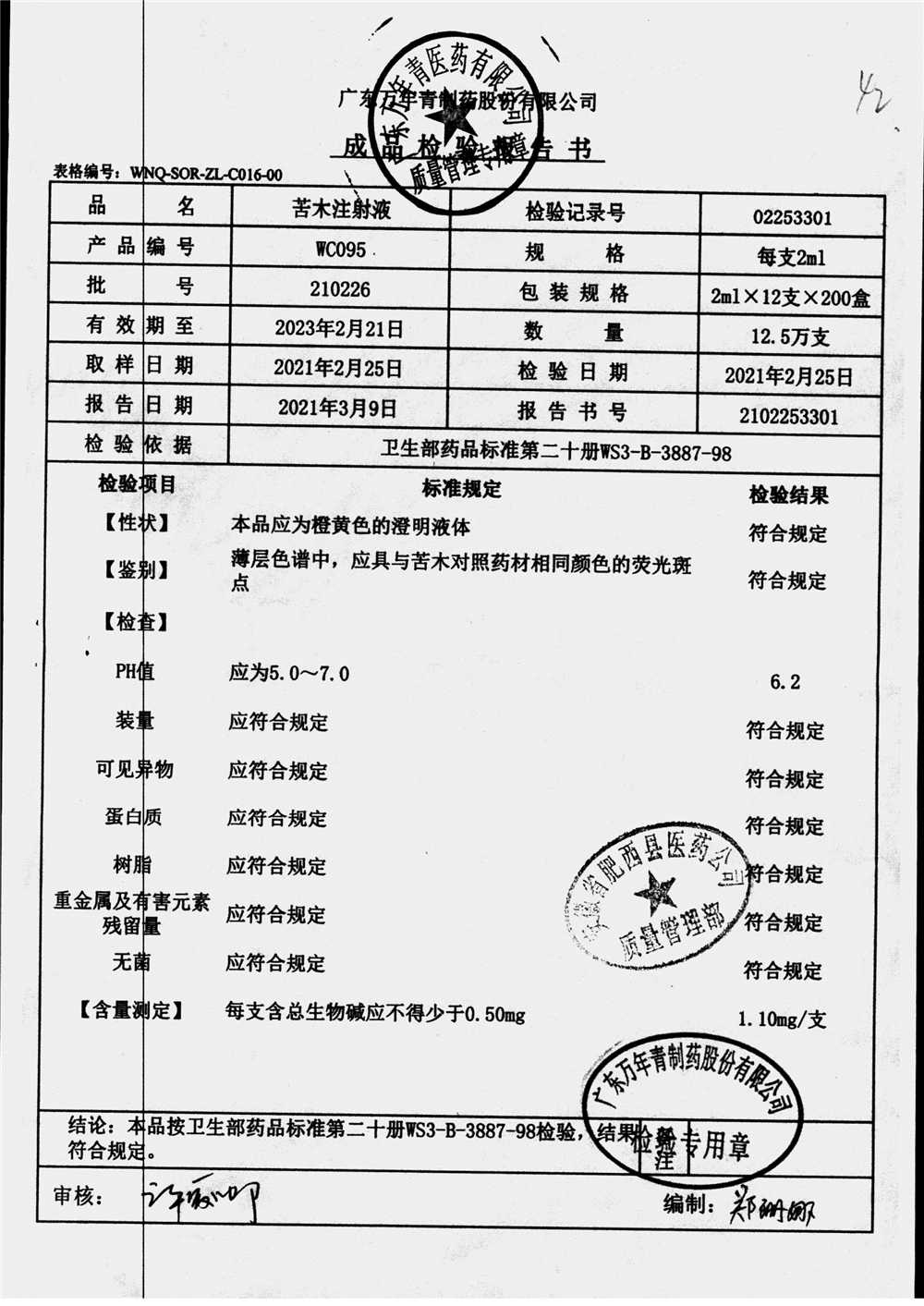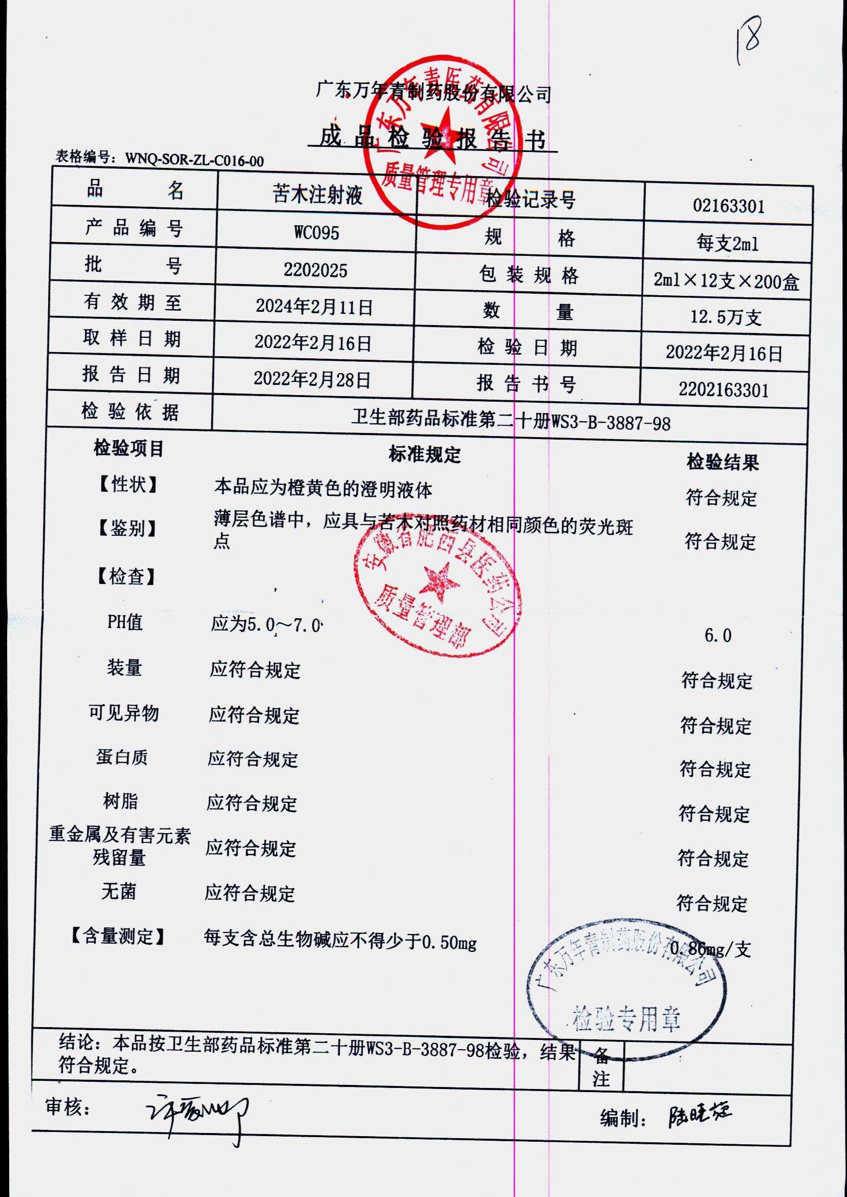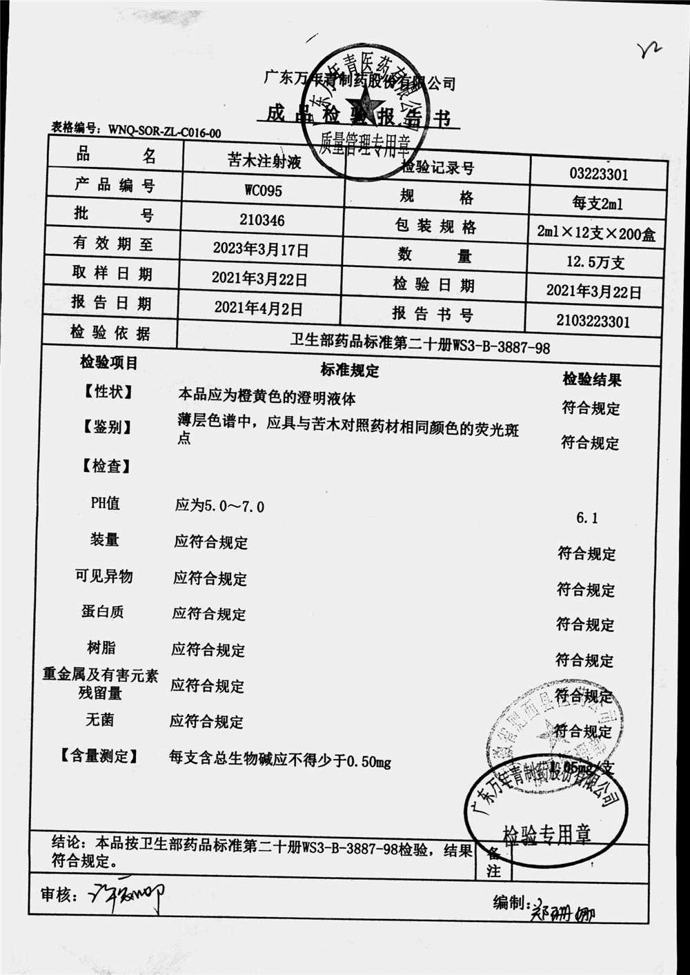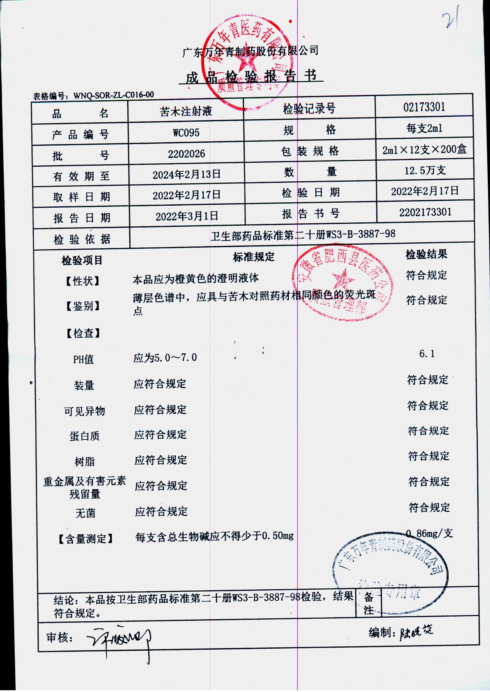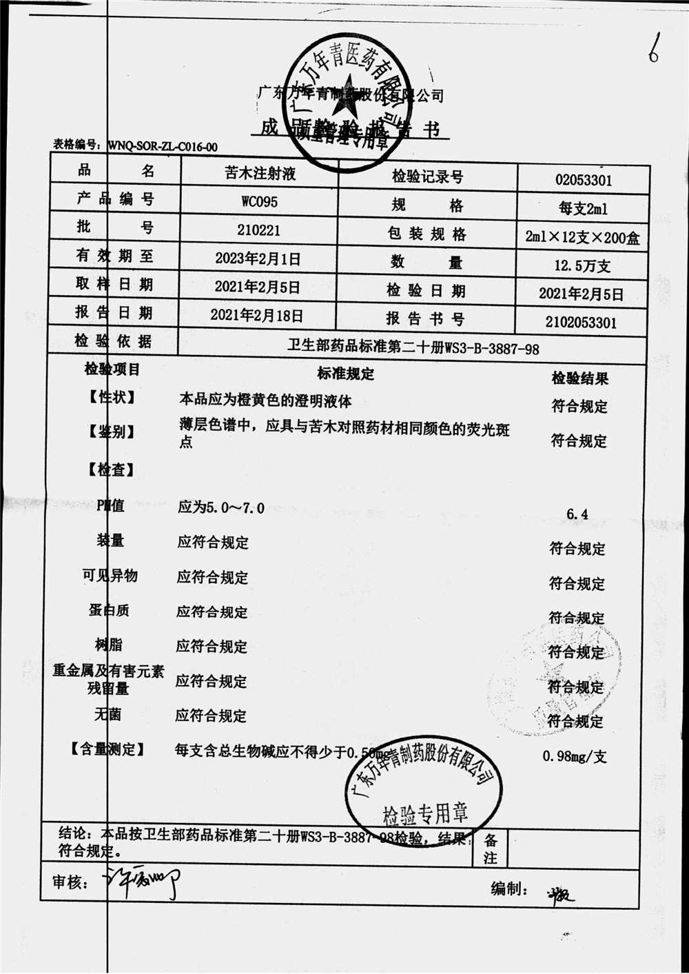 苦木注射液 | 2ml | 210226 | 查看详情 |