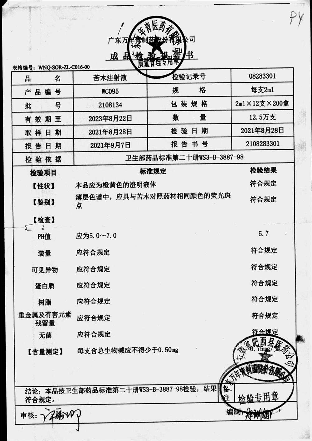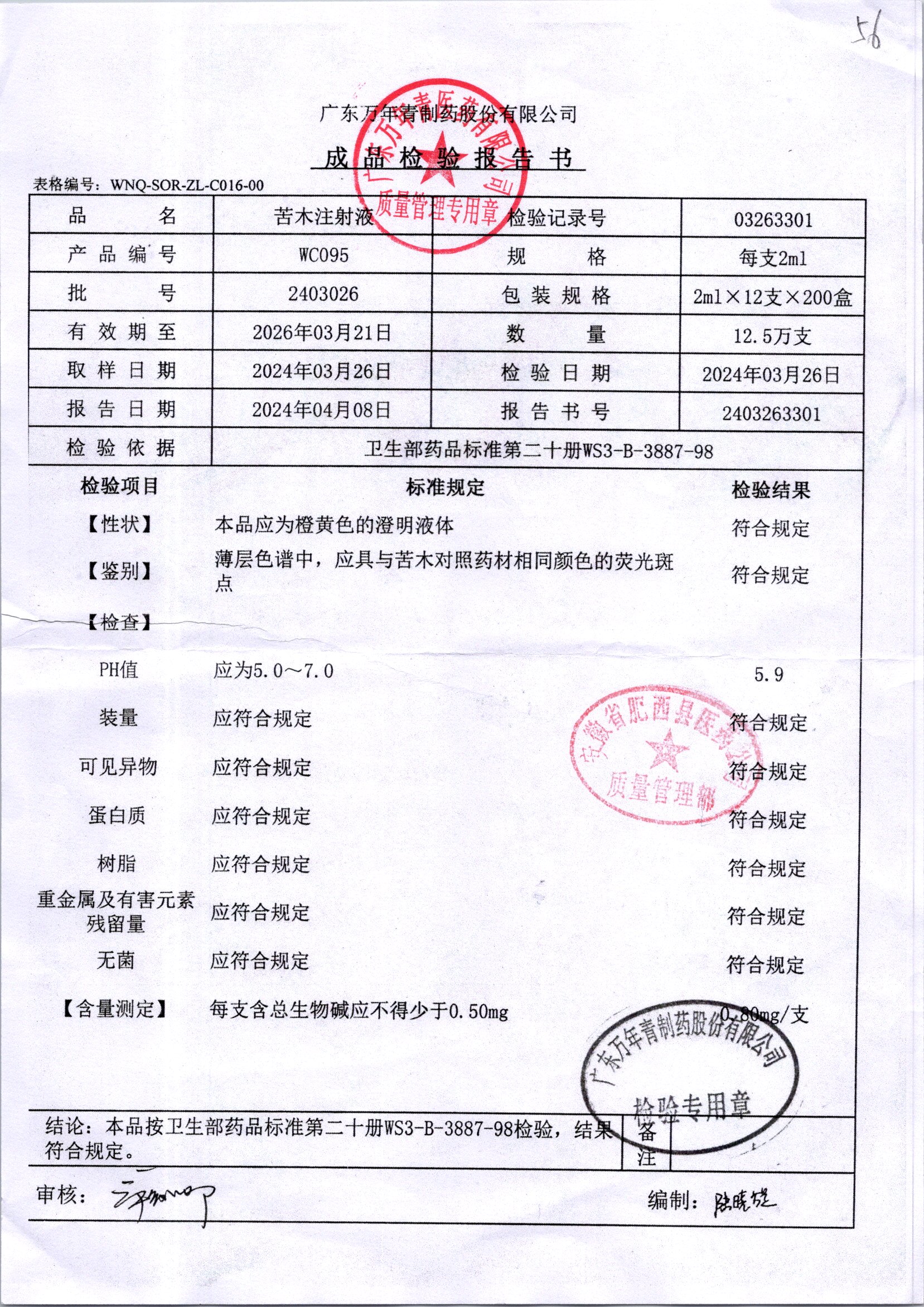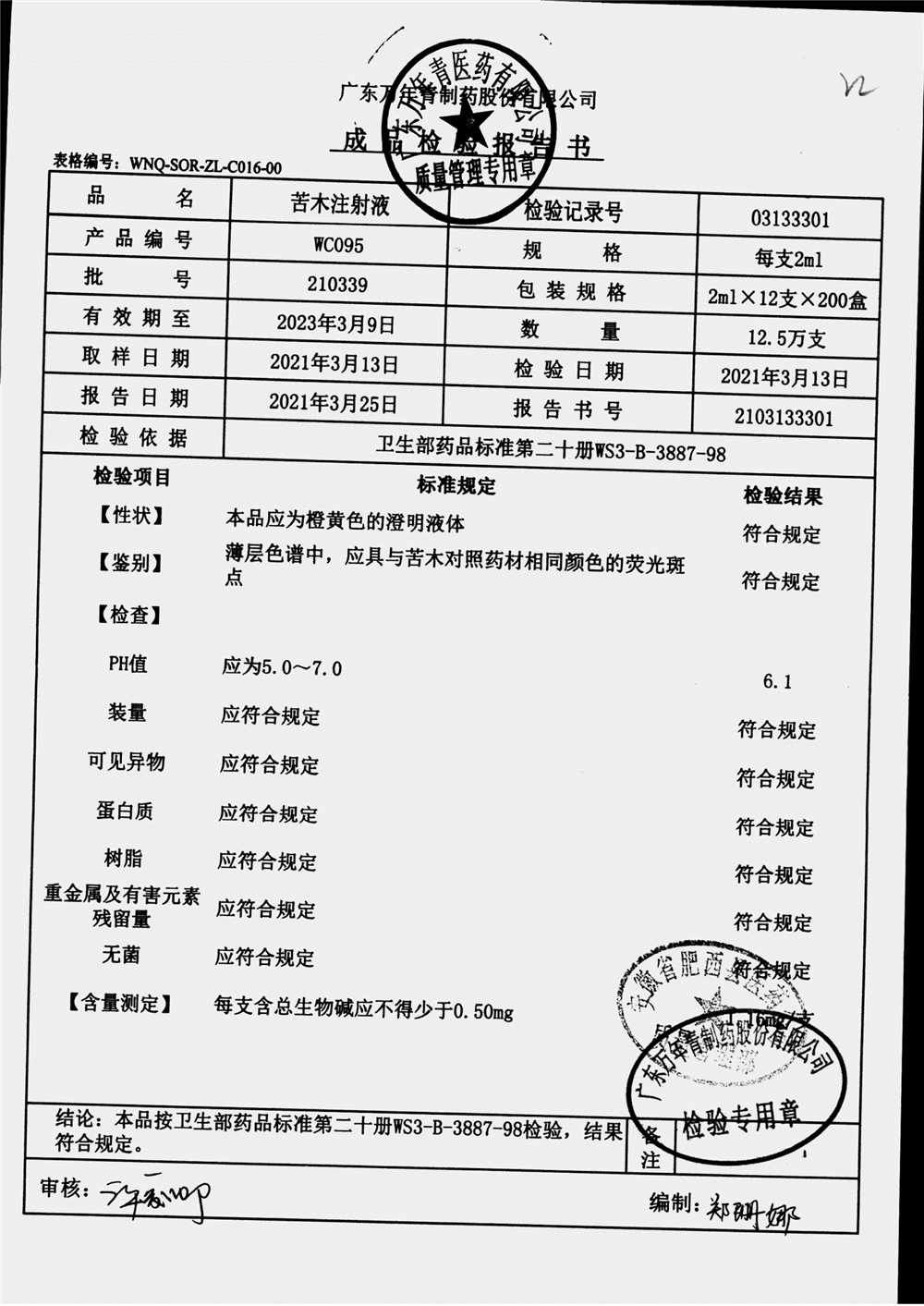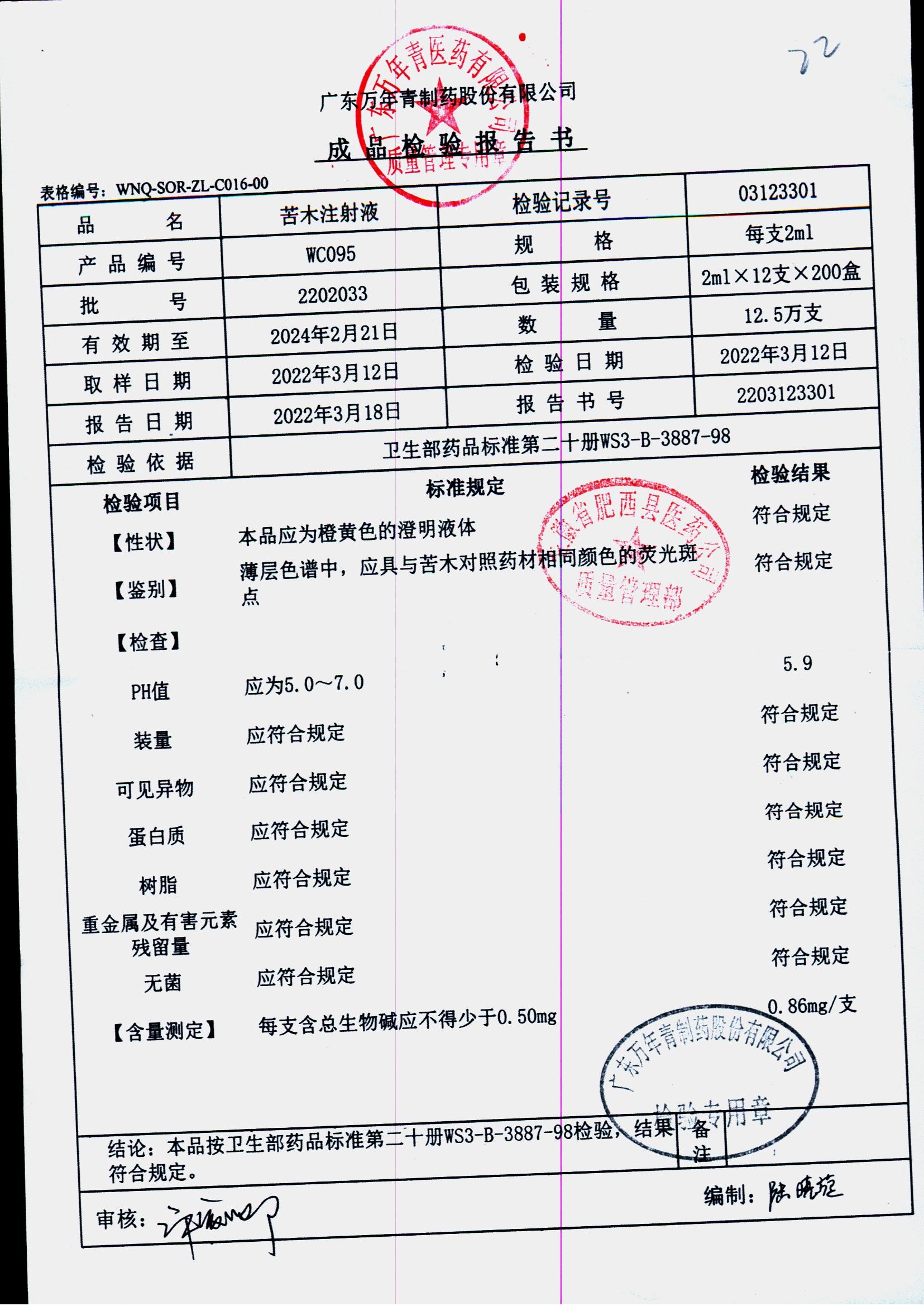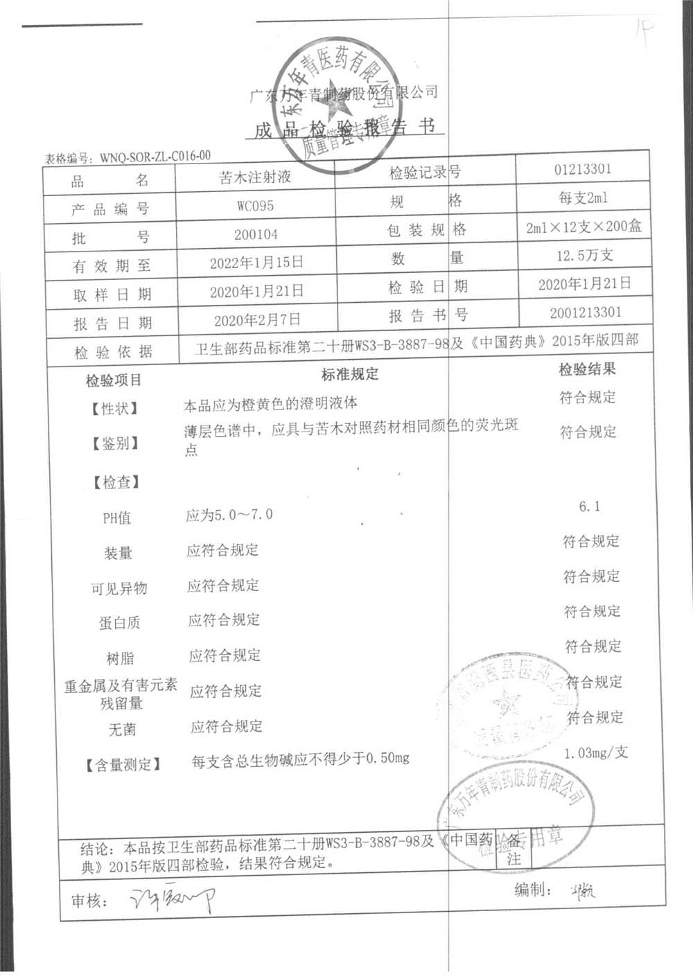 苦木注射液 | 2ml | 210226 | 查看详情 |