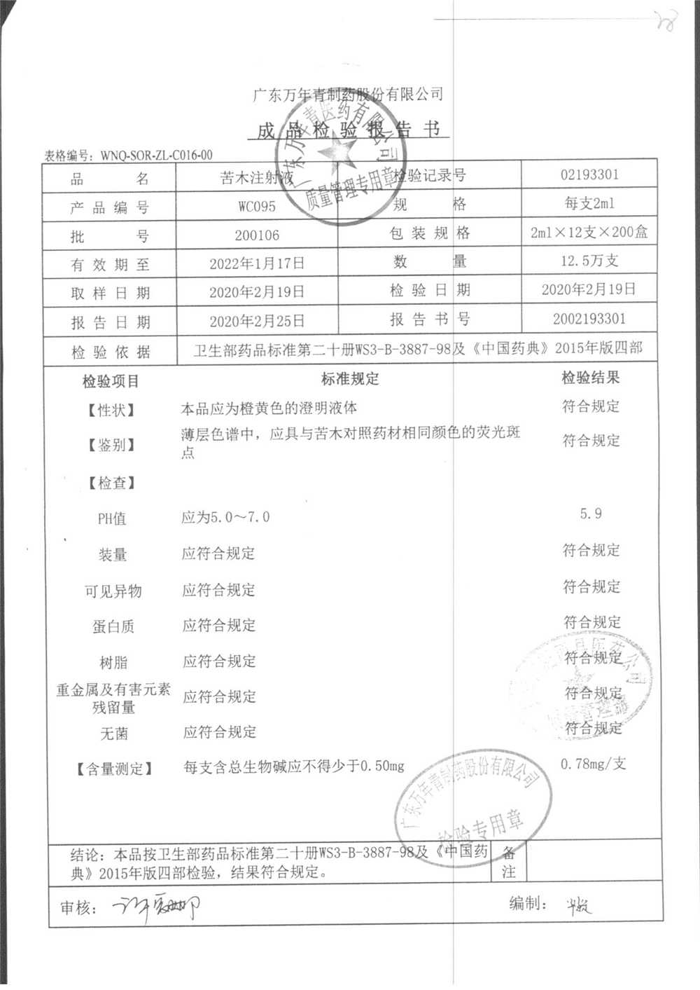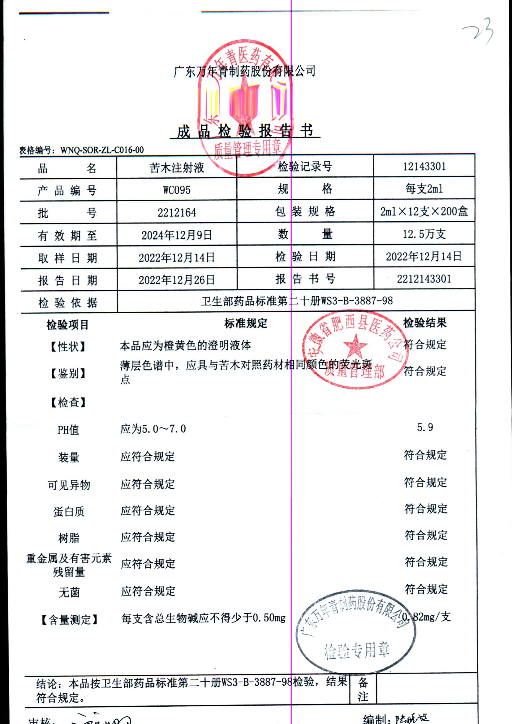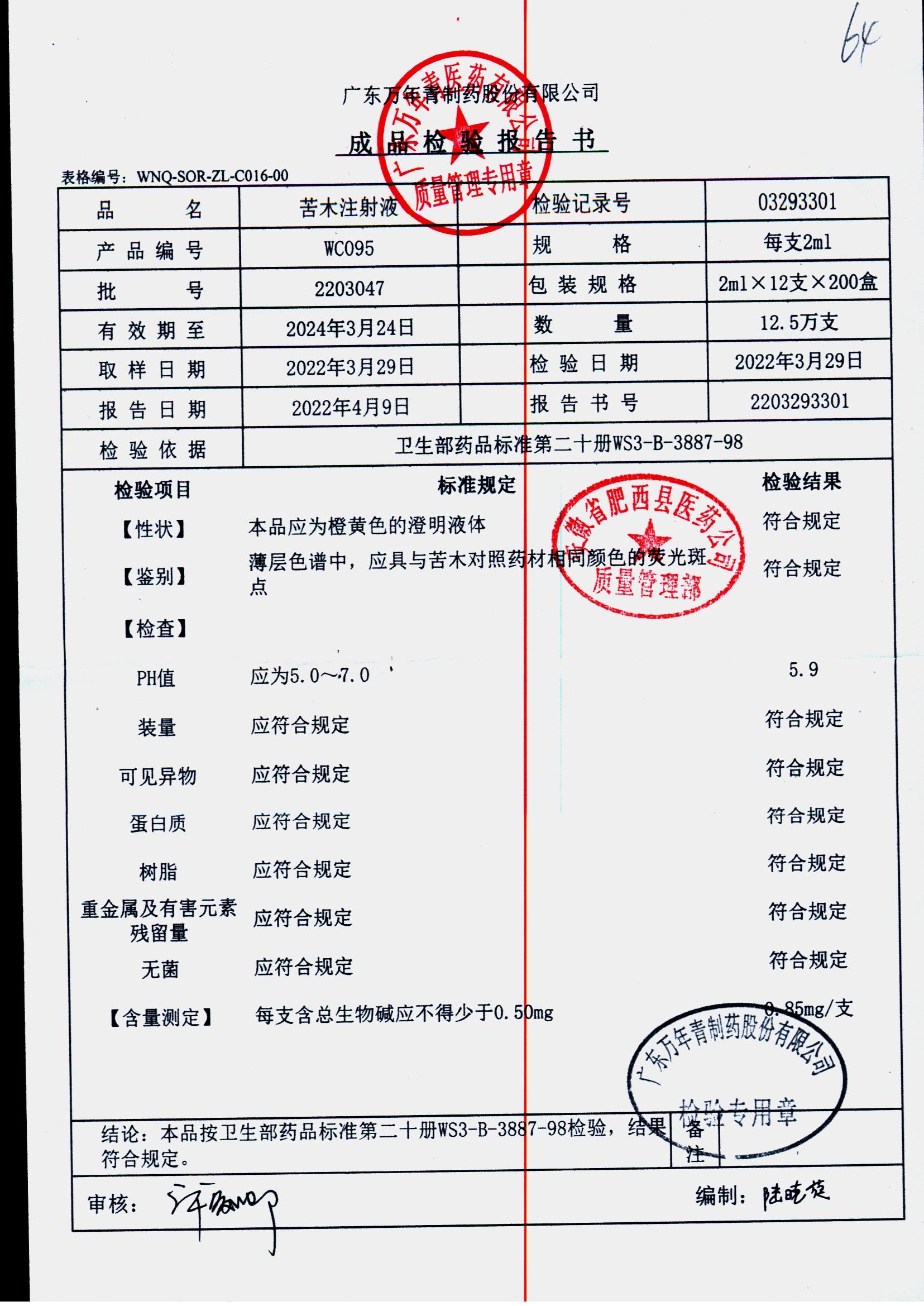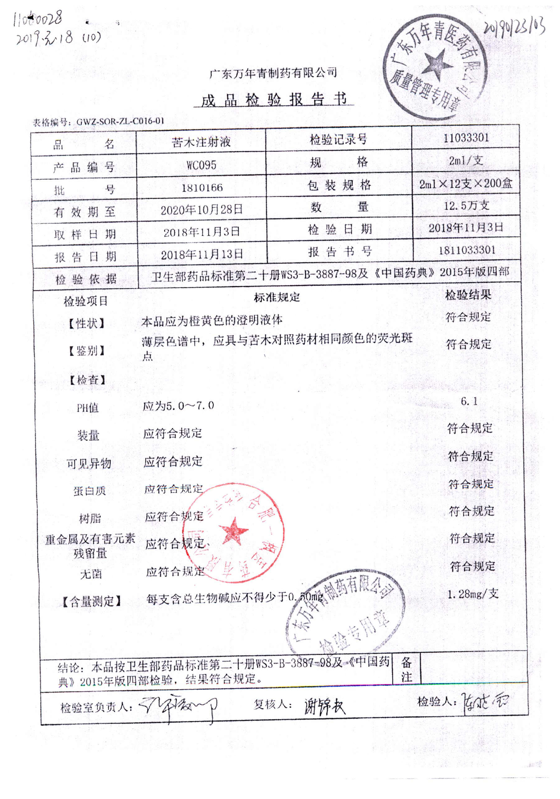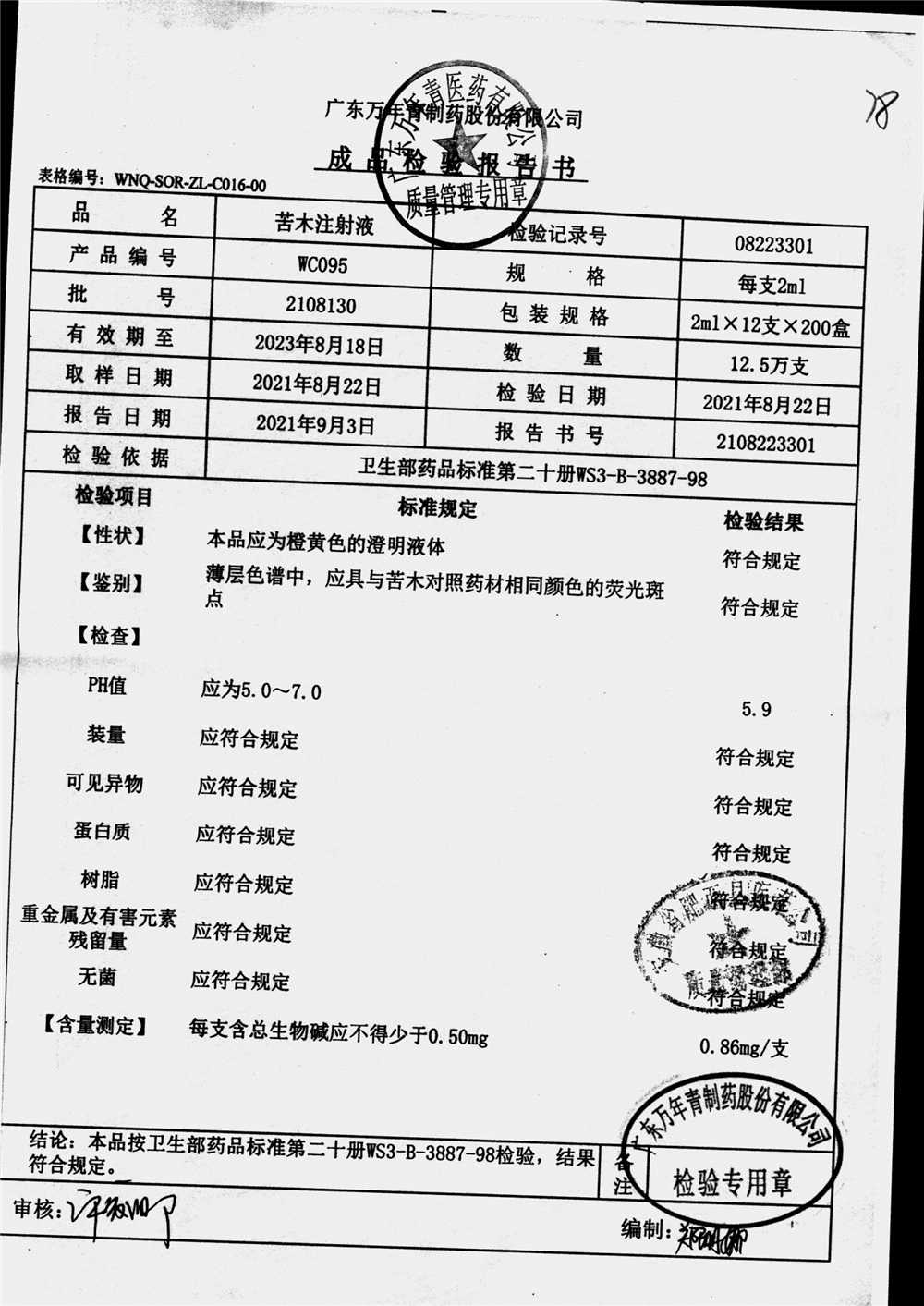 苦木注射液 | 2ml | 210226 | 查看详情 |