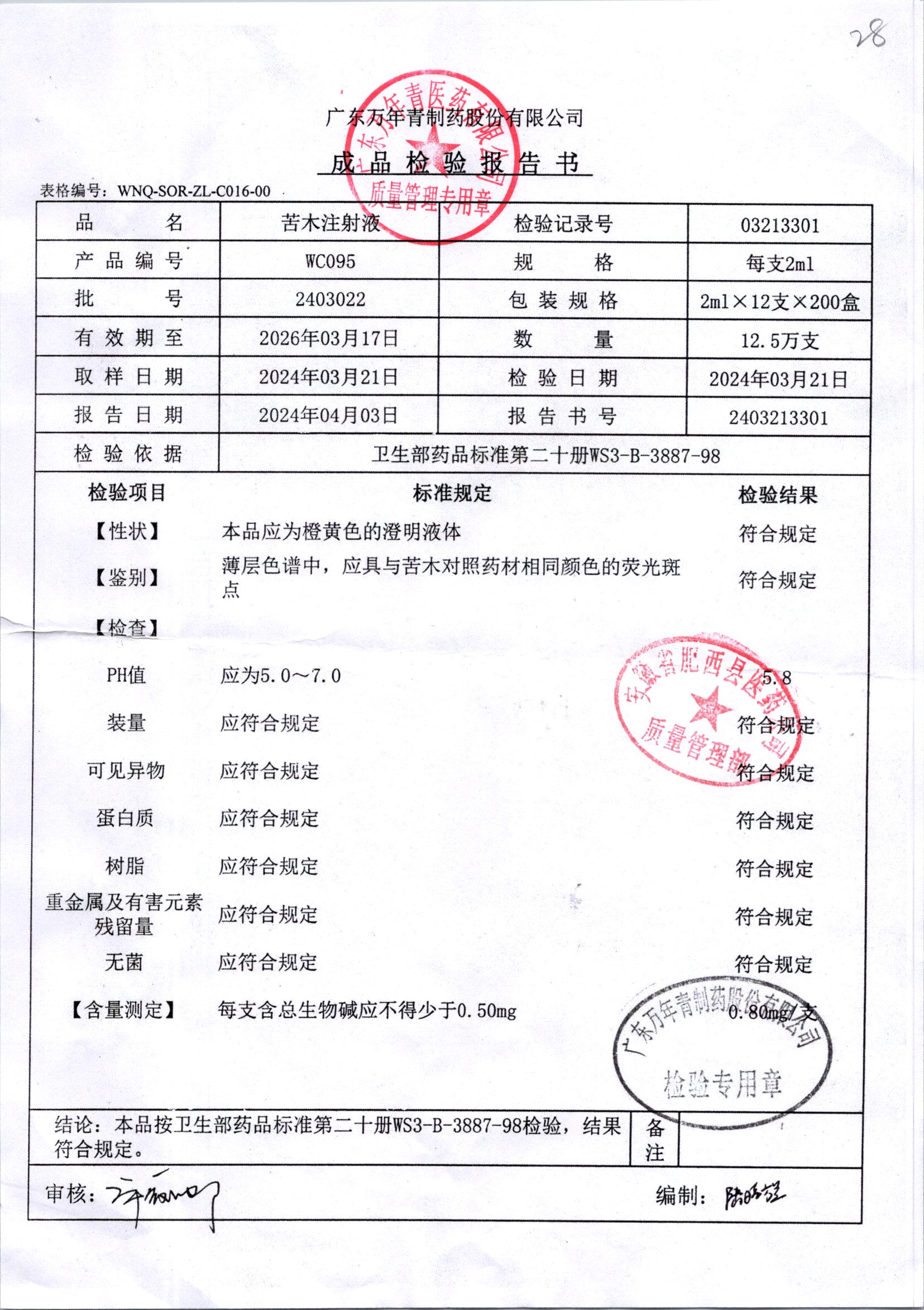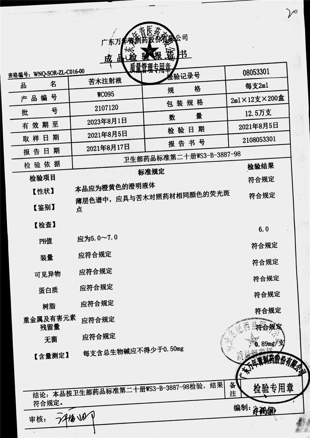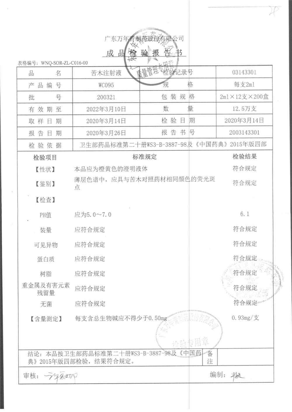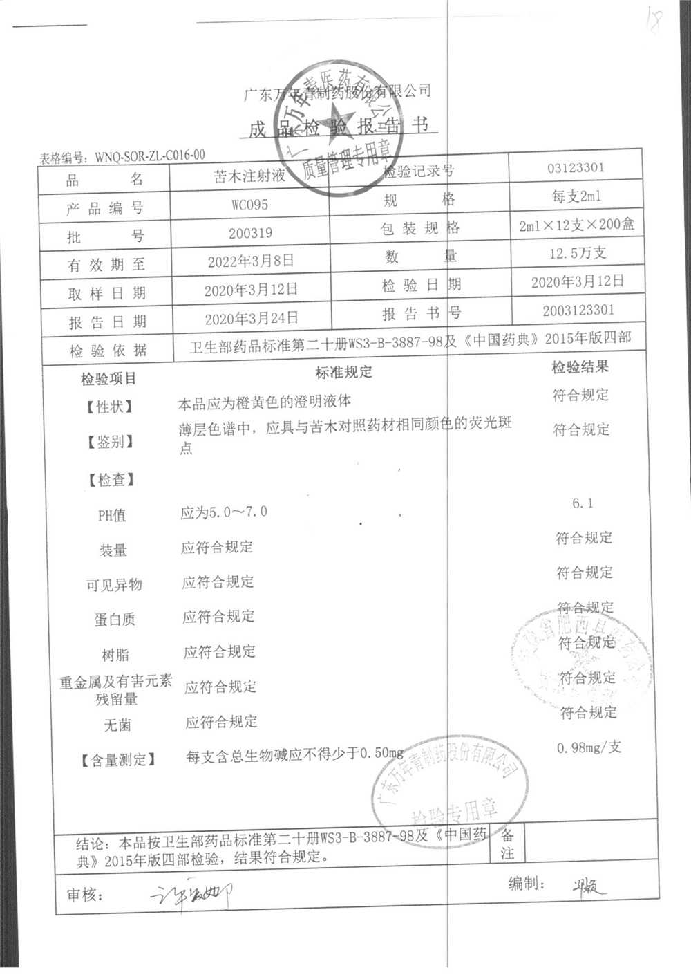 苦木注射液 | 2ml | 210226 | 查看详情 |