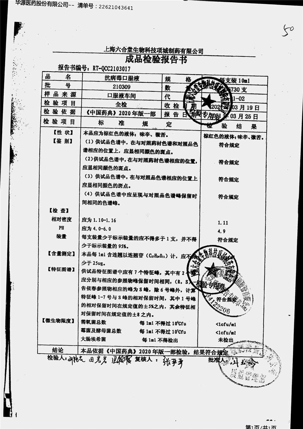抗病毒口服液 | 10ml | 210309 | 查看详情 |