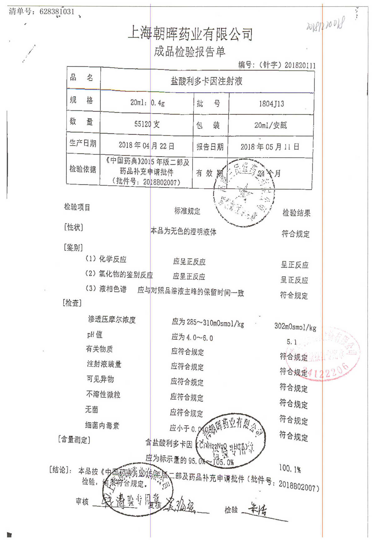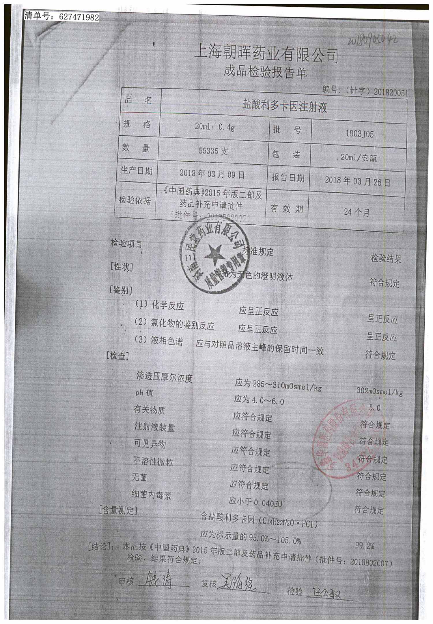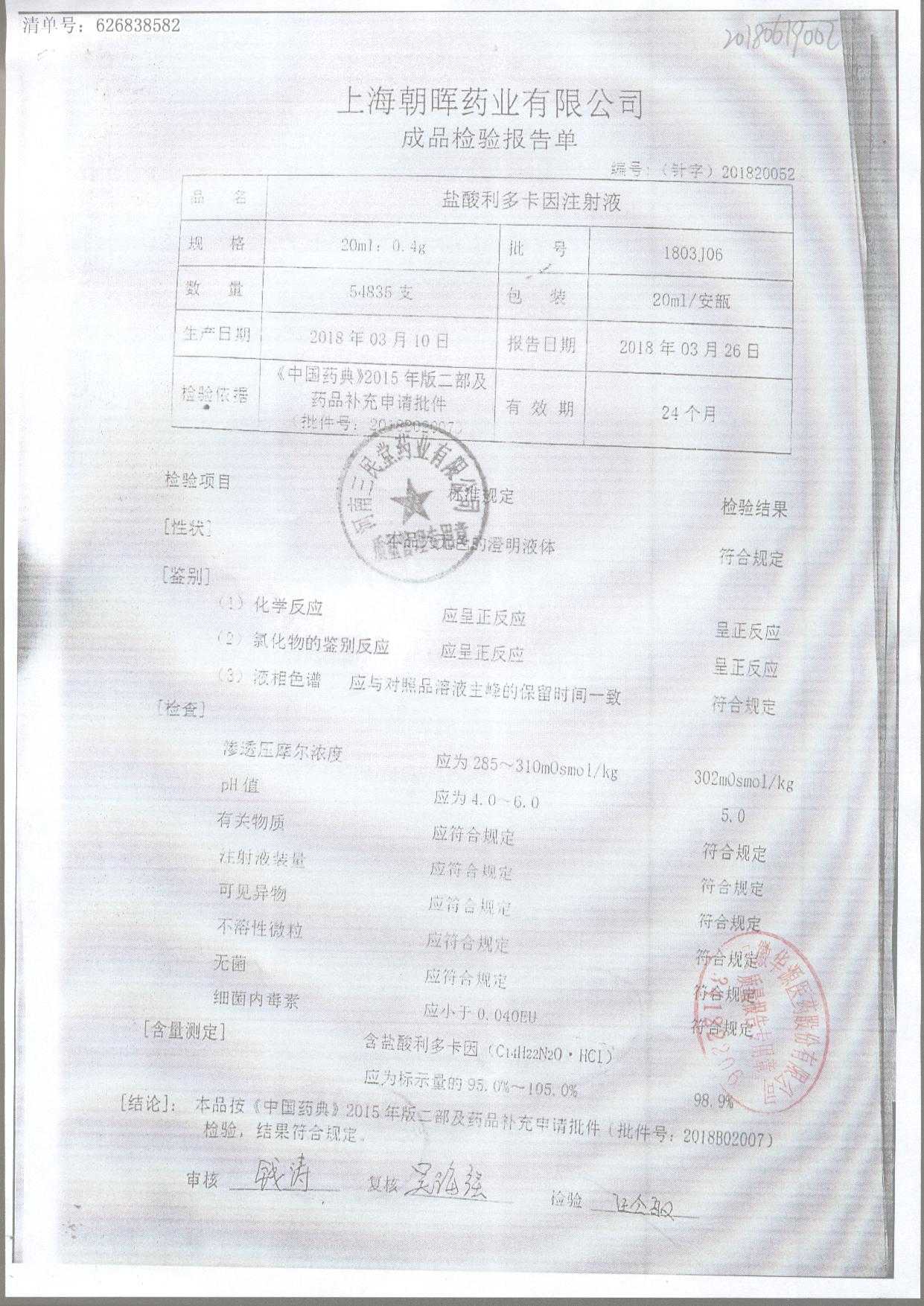盐酸利多卡因注射液 | 20ml:0.4g | 1803J06 | 查看详情 |