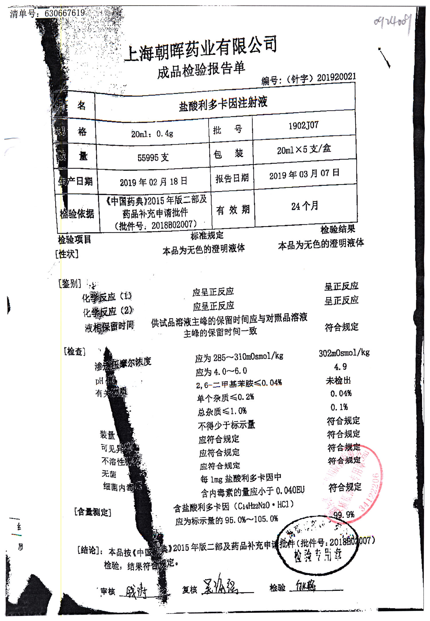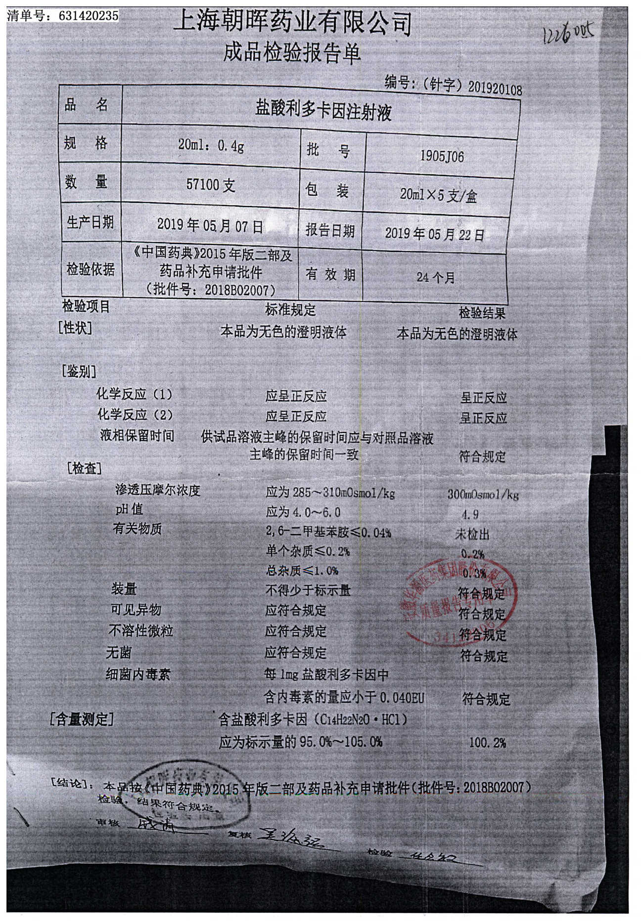 盐酸利多卡因注射液 | 20ml:0.4g | 1905J06 | 查看详情 |